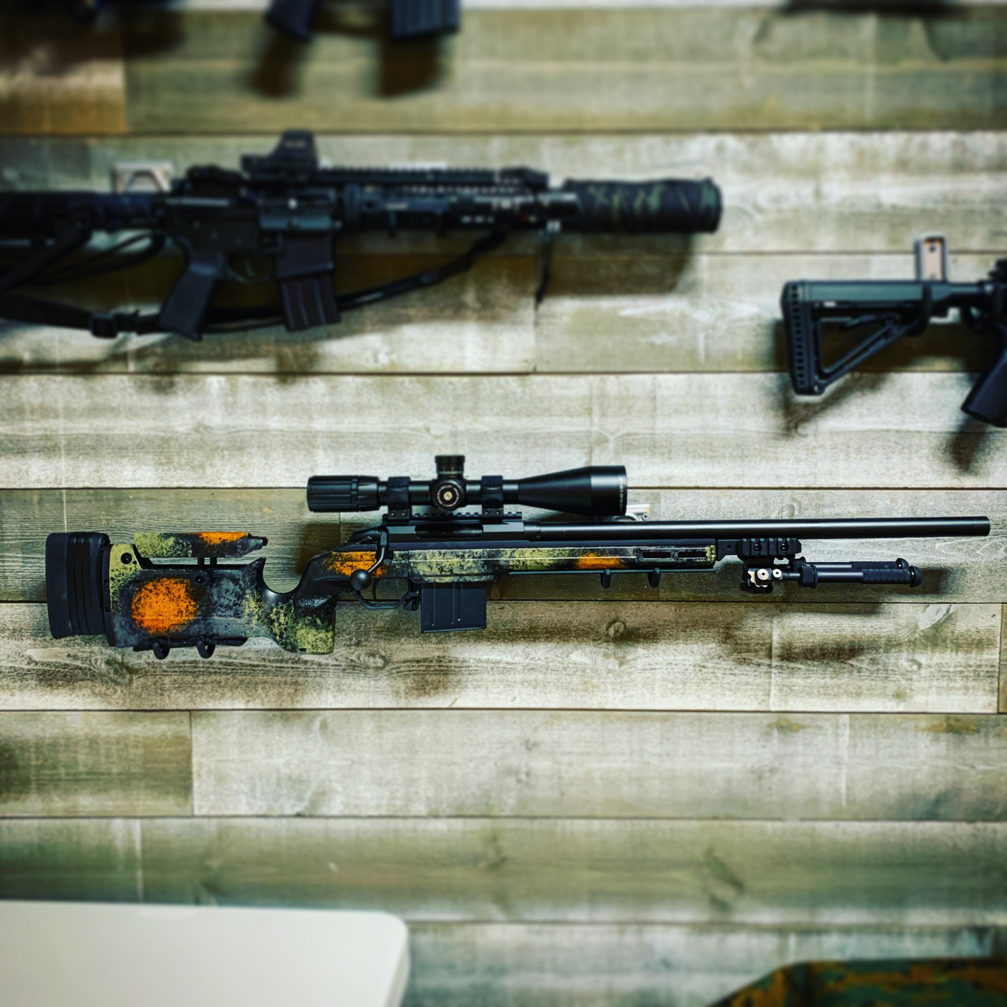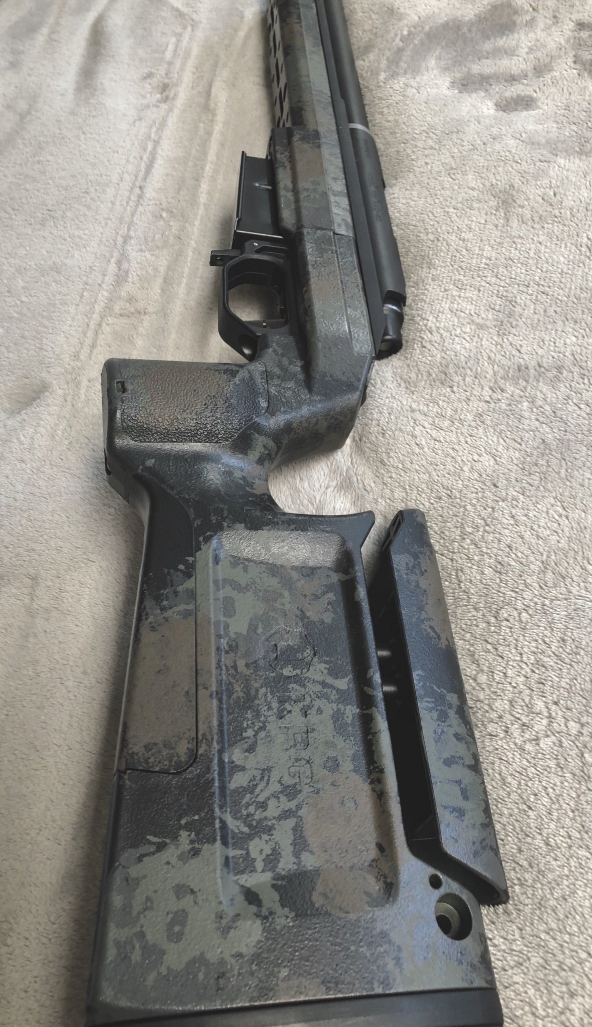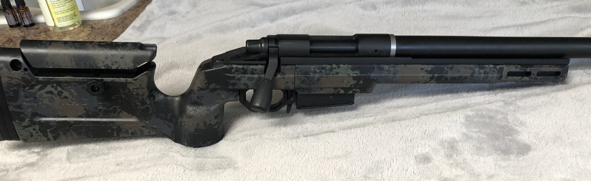 This rifle inspired me to do one and I had a big plan to pretty much copy it. I practiced on some black plastic trash cans but once I started the plan went out the window and the rifle became what it wanted to be. I like it more than the plan I had. Lesson is just go for it, you can always sand it and start over if you don’t like it. Key for me was getting the right sponge and getting the hang of how much paint/pressure to put on it to get the desired effect.