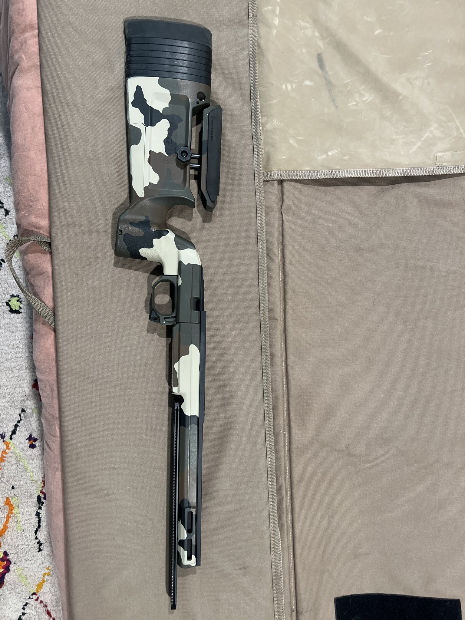 Selling my cerakoted M81 camo KRG Bravo R700 with 12" Area419 arca rail, also has a Hoptic foam saddle blanket. Chassis is in great shape other that where the cerakote has worn off in a few spots. Comes with 6 LOP spacers (I got long arms). Will also include the appropriate length screws and washers to run anything from 6 to just 1 spacer. Went with the longer Arca rail to essentially get a spigot, its plenty stiff enough to run a bipod all the way at the end. Chassis shoots great and is reasonably light for what it is. I upgraded to an MPA Hybrid so I'm no longer in need. Asking $500.00.