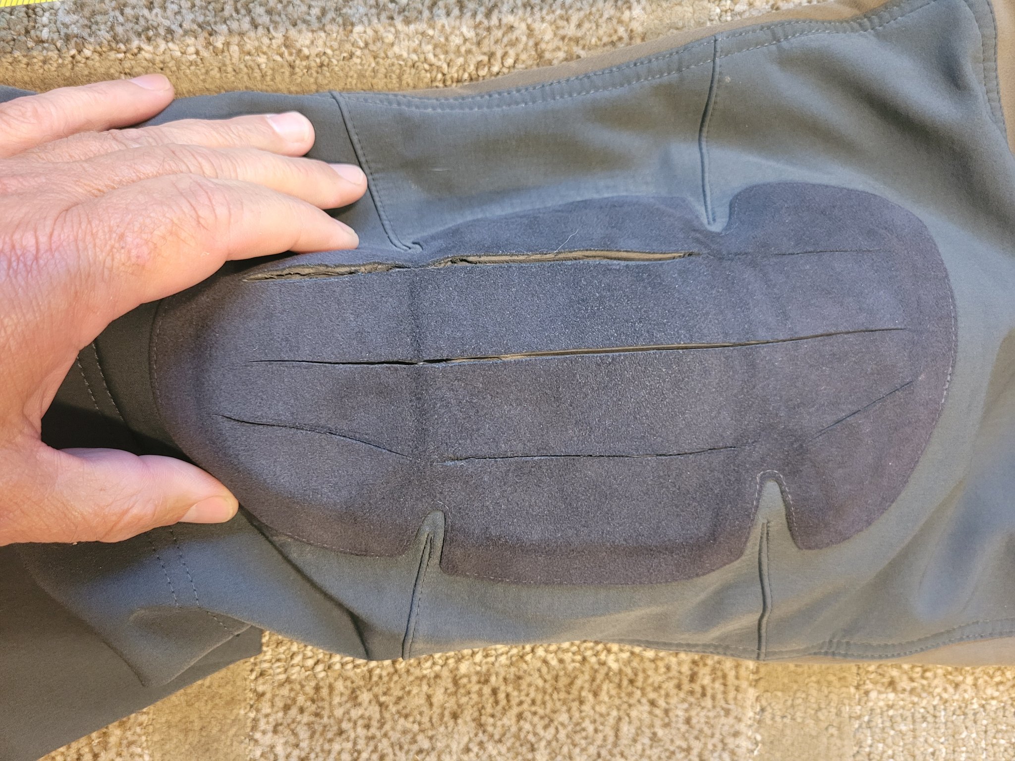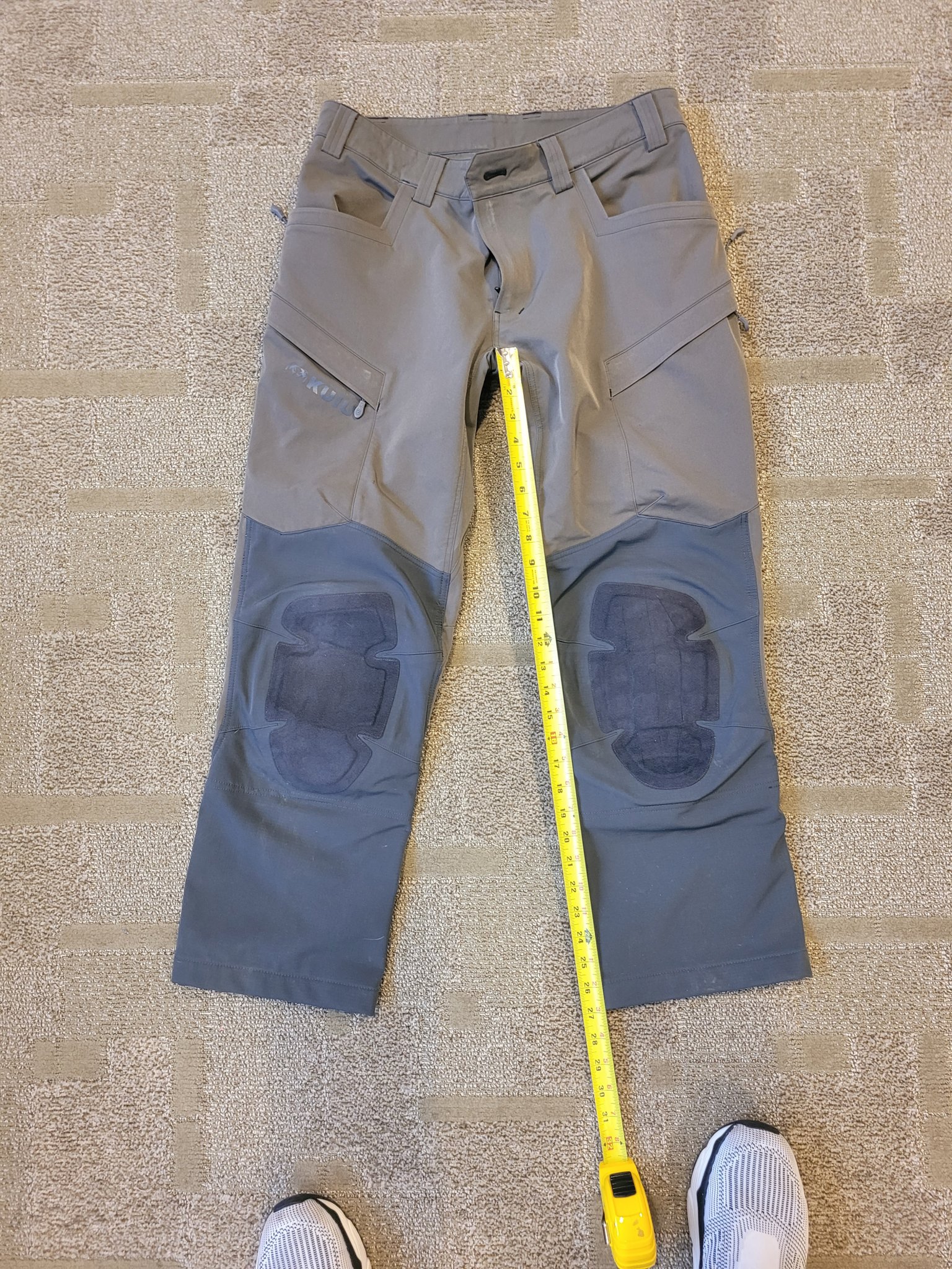 I only wore these pants a few times. Great pants - but too warm for my SoCal climate. These pants are like new, no wear marks - except that the knee pads bothered me being stiff, and since my left knee was most often down (bent), I tried to relieve the stiffness in the pad with some careful slits in the pad. These do not go through the pants into the inside. They improved my comfort with no loss of padding function (see picture). I was going to do the right knee, but never got around to it.