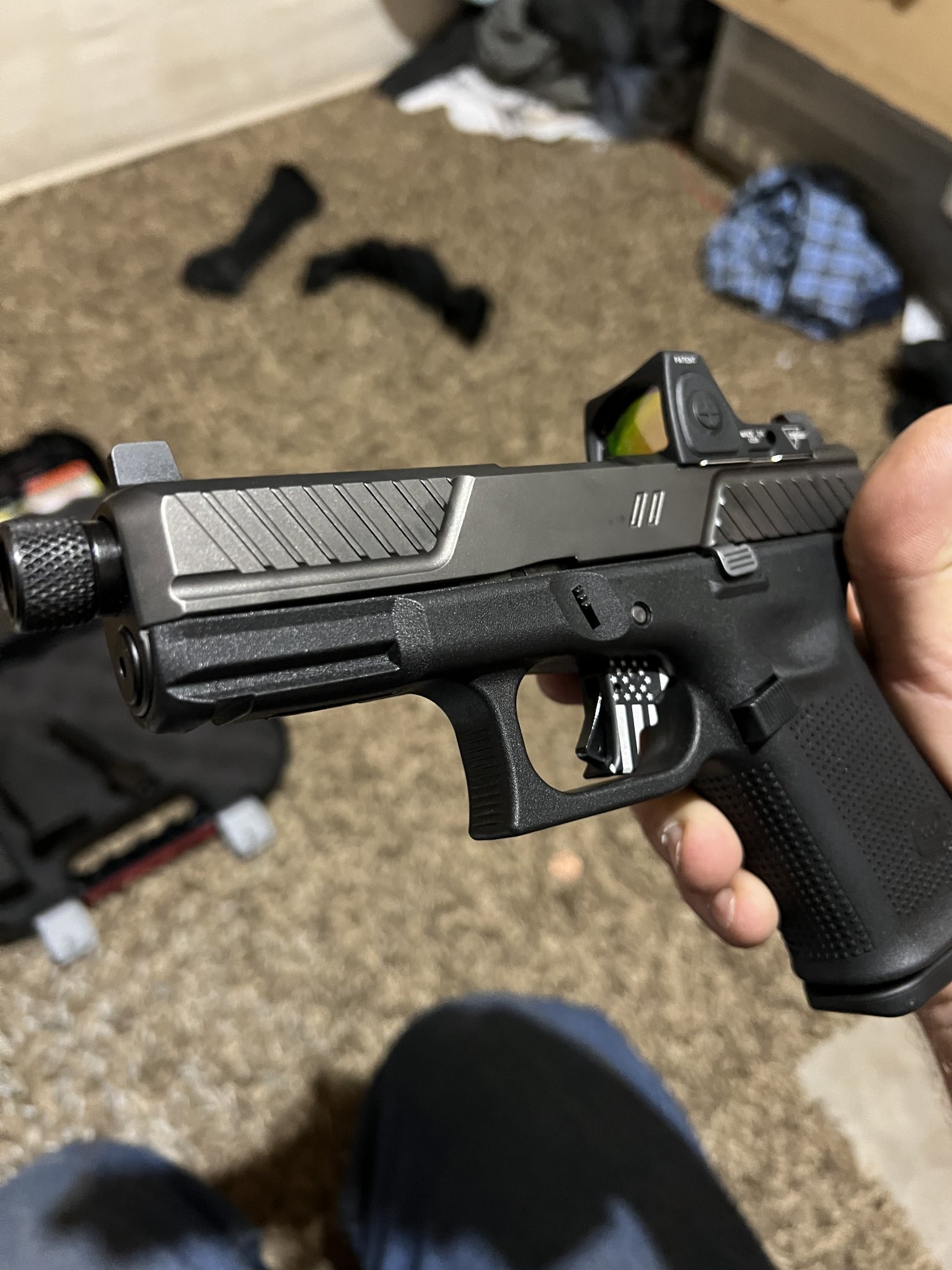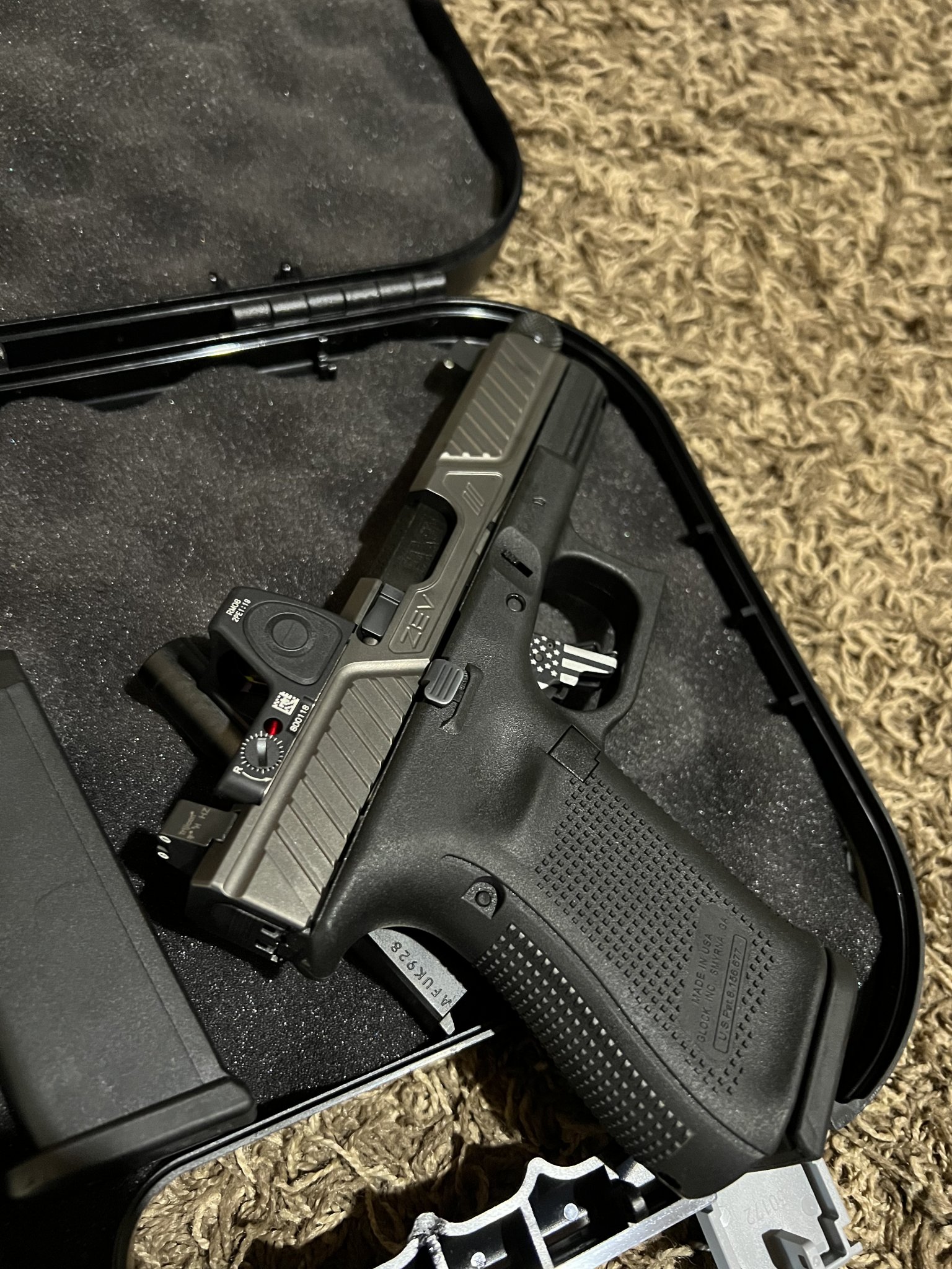 Up for sale is my Glock g19 gen 5 with Zev technologies gen 5 citadel slide rmr cut, trijicon suppressor height night sights, trijicon type 2 rmr 3.25 moa red dot, Faxon pvd flame fluted 1/2x28 threaded barrel and apex tactical special edition gen 5 trigger. Also comes in original plastic case with original slide, barrel and trigger, 3 15 rd Glock oem magazines and mag loader. Also includes back straps and cleaning rod/brush from Glock.