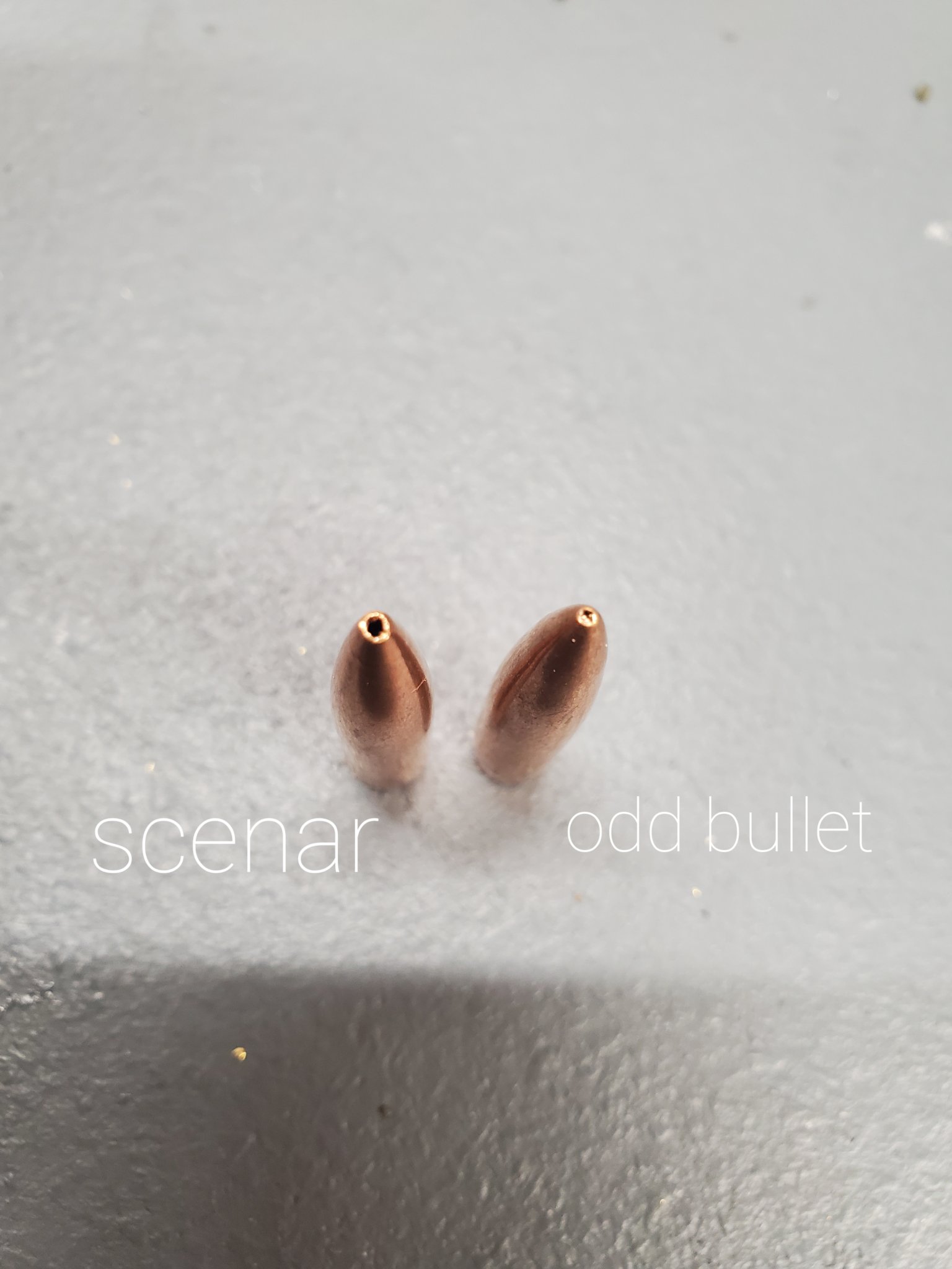 So I bought a bulk bag (700ct) of lapua 139 scenars from a fellow hide member to load for my pdog hunt in 2 weeks. While starting to load I noticed that a few looked different(end up being about 80 out of 700) The visual difference was the meplat. The odd ones were more closed than the scenars. The oal and base to ogive are slightly different. I weighed all the odd ones and they are all exactly139gr.
