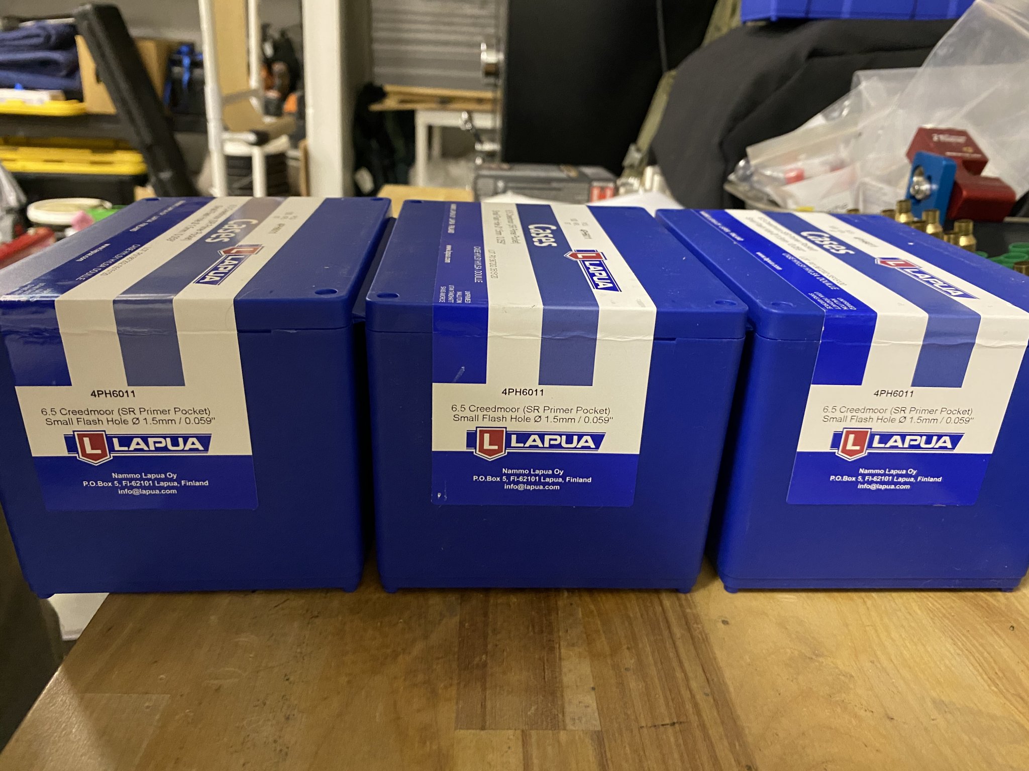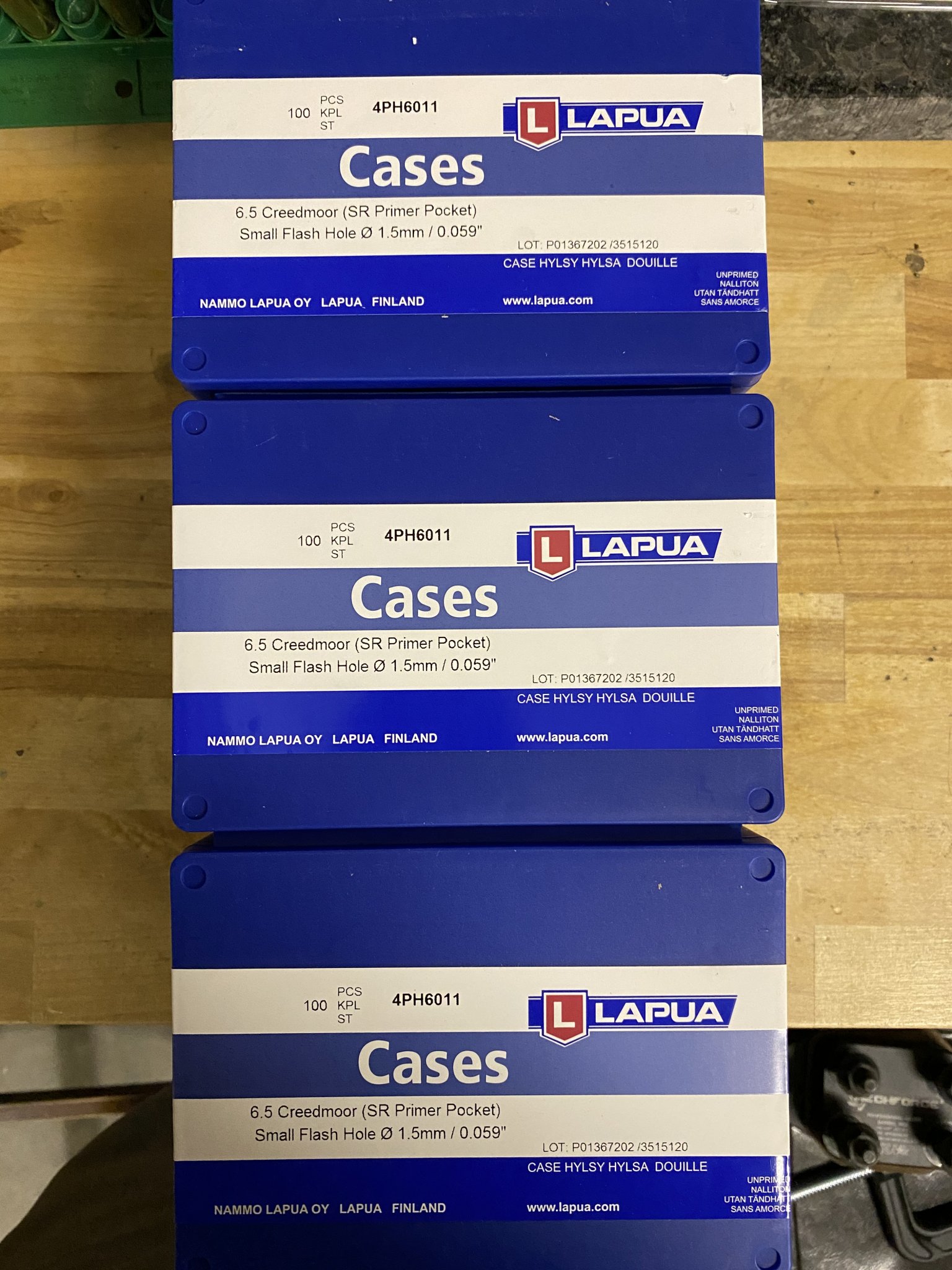 For sale 300 Lapua 6.5 Creedmoor small rifle primer brass. All same lot in unopened boxes. Price $340 shipped TYD.