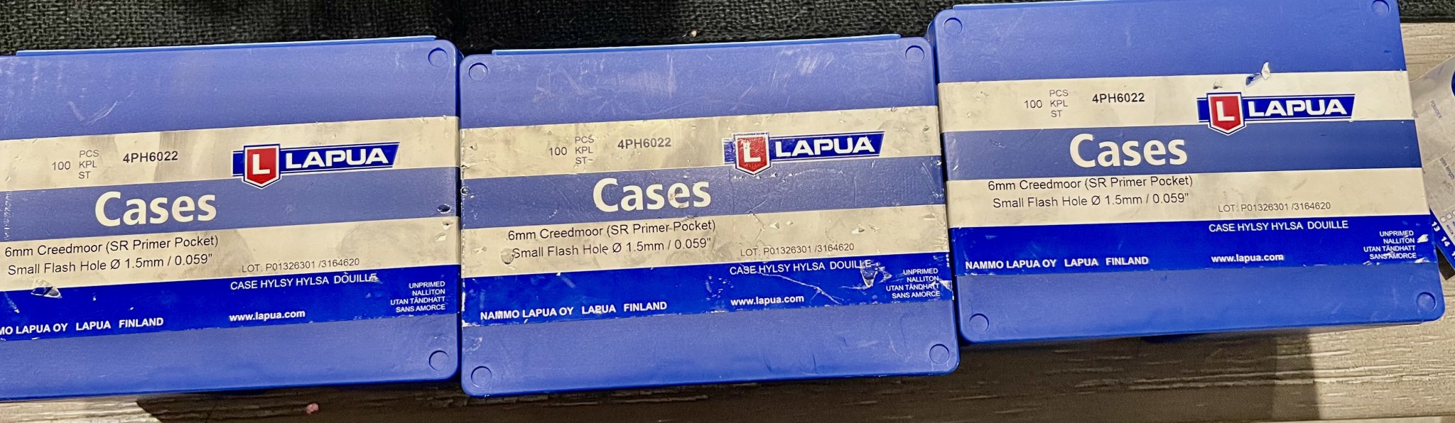 Lapua 6mm creedmoor SRP brass 4x fired, annealed on AMP annealer every firing (can give code if you’d like) qty 299 pieces of all same lot number in original boxes (or I can ship in a bag/shipping box if you don’t want the blue boxes). Price is $180 shipped.