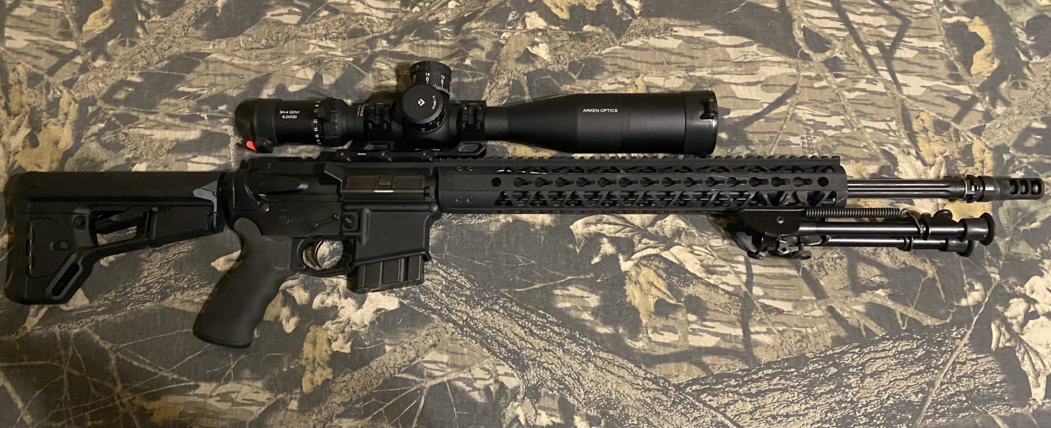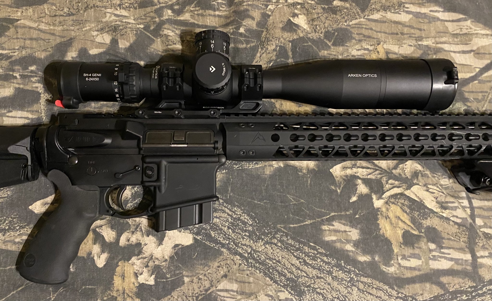 20” 6.5 Grendel custom build… Arken SH4 Gen2 6-24x50 VPR MIL in their 34mm 20MOA AR mount. Works great. It’s a pretty hefty scope, but when mounted it’s not overly heavy or burdensome. Balances well, especially with a Can on the end. The extra magnification is nice, as well as the huge amount of elevation adjustment, thanks to the 34mm tube.