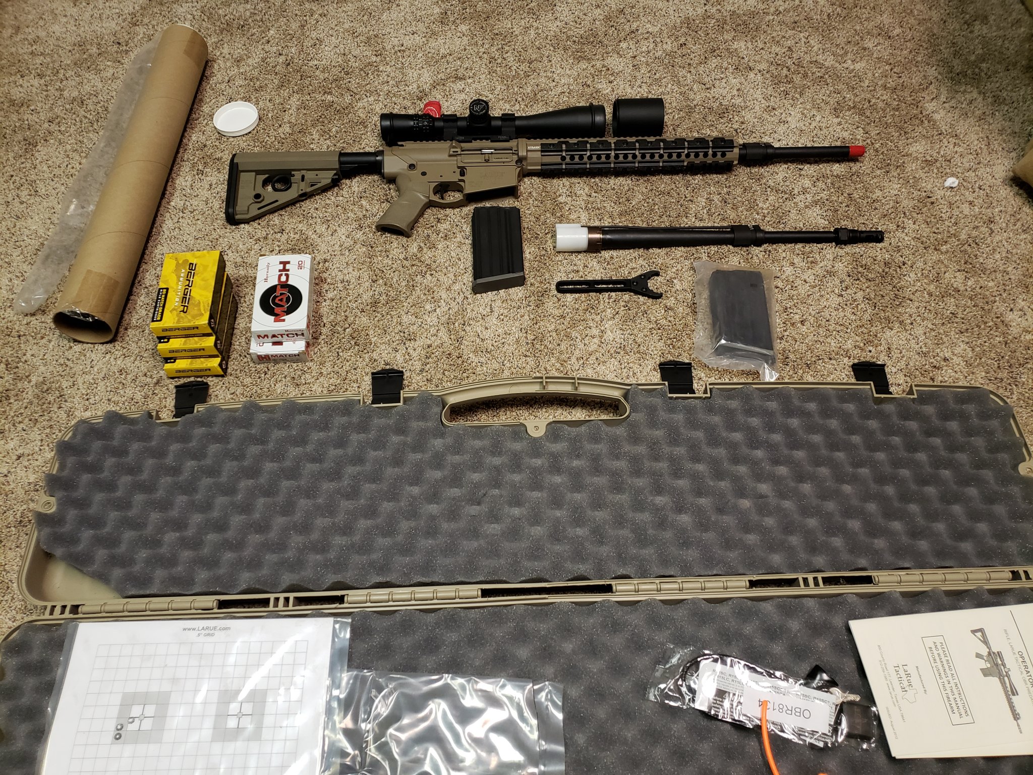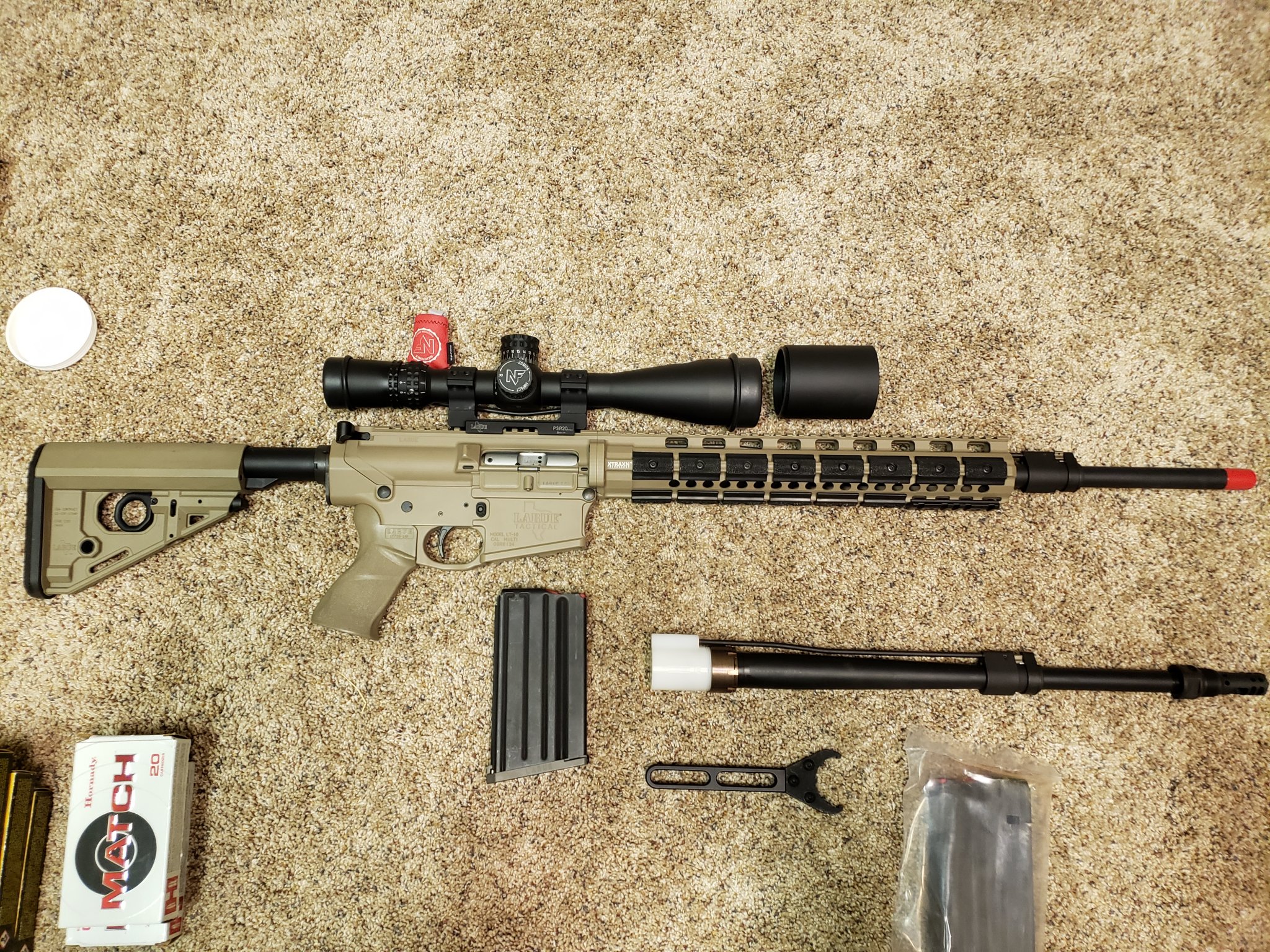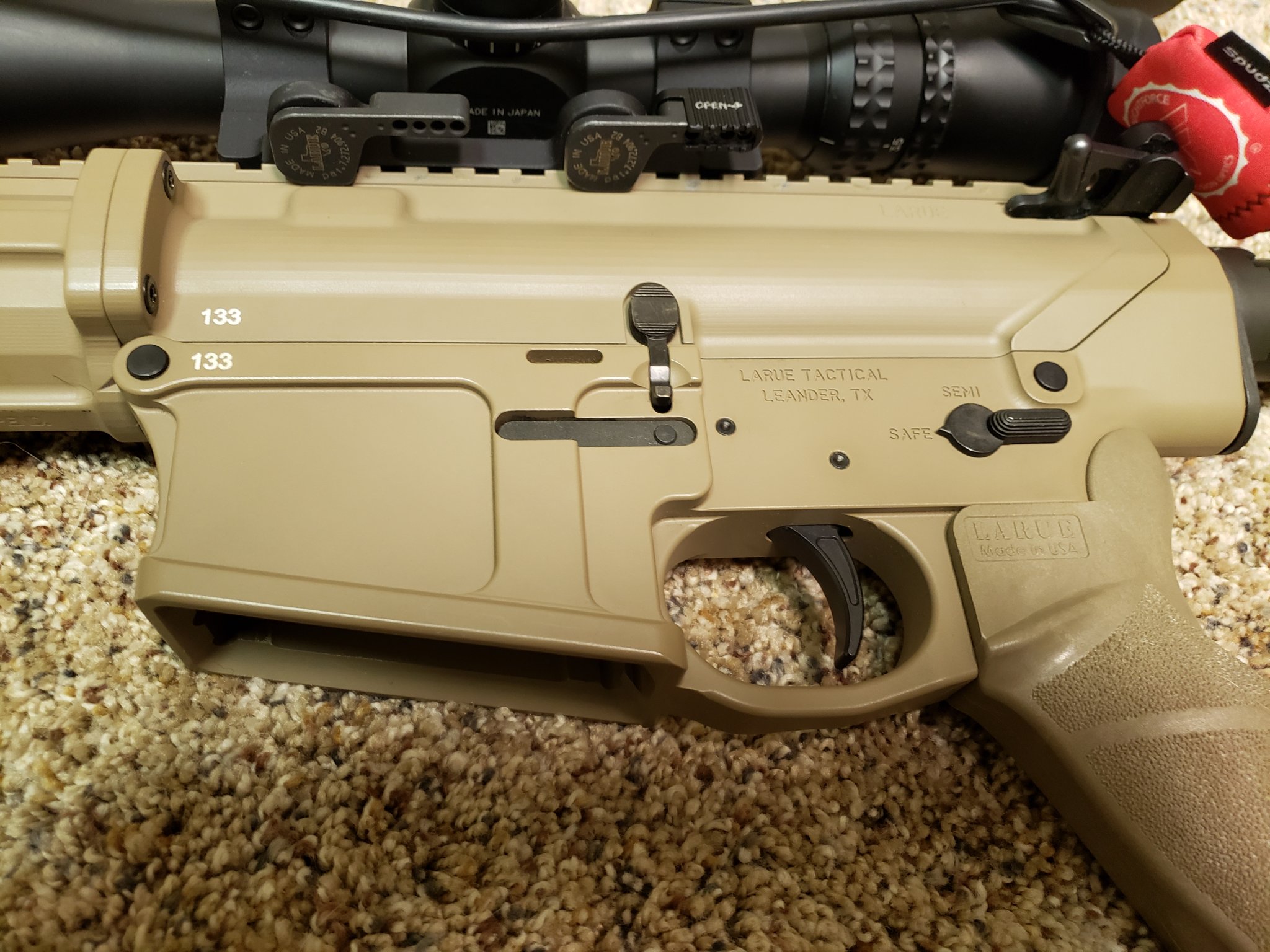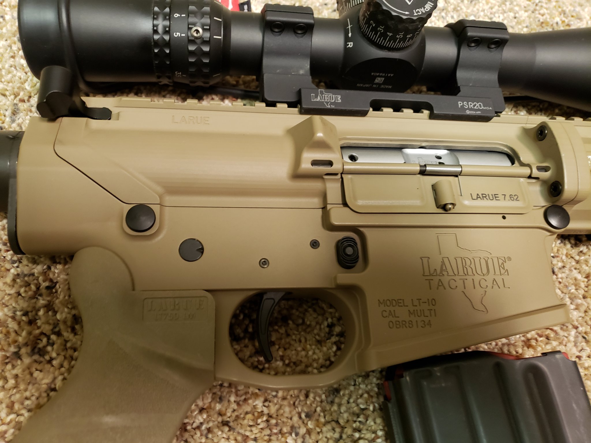I'm gonna sell my Larue Limited Edition rifle. It's number 133 of the FDE 7.62 heavy barreled PredatAR run. I paid the extra for the optional 22" 260 barrel, so it has the 16" 308 barrel and the 22" 260 barrel that change out with the collar like the Predatobr rifles. I have only shot the rifle with the 260 barrel, and that was only 3 different times for a total of 52 rounds. The rifle is in almost new condition with just a few marks tiny marks near ejection port and very minor rubbing in the magwell. The rifle has a Nightforce NXS 3-15x50 scope with the Velocity 1000 LV.5 reticle mounted in a Larue PSR20 mount. I chose this particular optic as I felt it was perfect for the 308/260 combo. The reticle matches dang near perfectly for Federal Gold Medal 175 out to 900 yards. My thinking was I would zero and use the reticle when shooting 308, and I could dial when shooting the 260 barrel. The scope is in excellent condition as well...no dings or scratches. Included with the rifle, 2 barrels, scope and mount are the case/papers the rifle was shipped with along with the 2 Larue magazines (1 is still in package), obr sling adapter, 1 tranquilo brake, wrench, 3 boxes of Berger 260 ammo with 130 hybrids, and 28 rounds of Hornady 260 Match ELD-M ammo. It's a top of the line, turn key setup in a limited edition Larue rifle. I have a bunch of money getting this thing set up perfectly, but I just don't shoot my ARs. Just finished up a custom 300 PRC bolt action that I'd like to get set up and dialed in by hunting season.