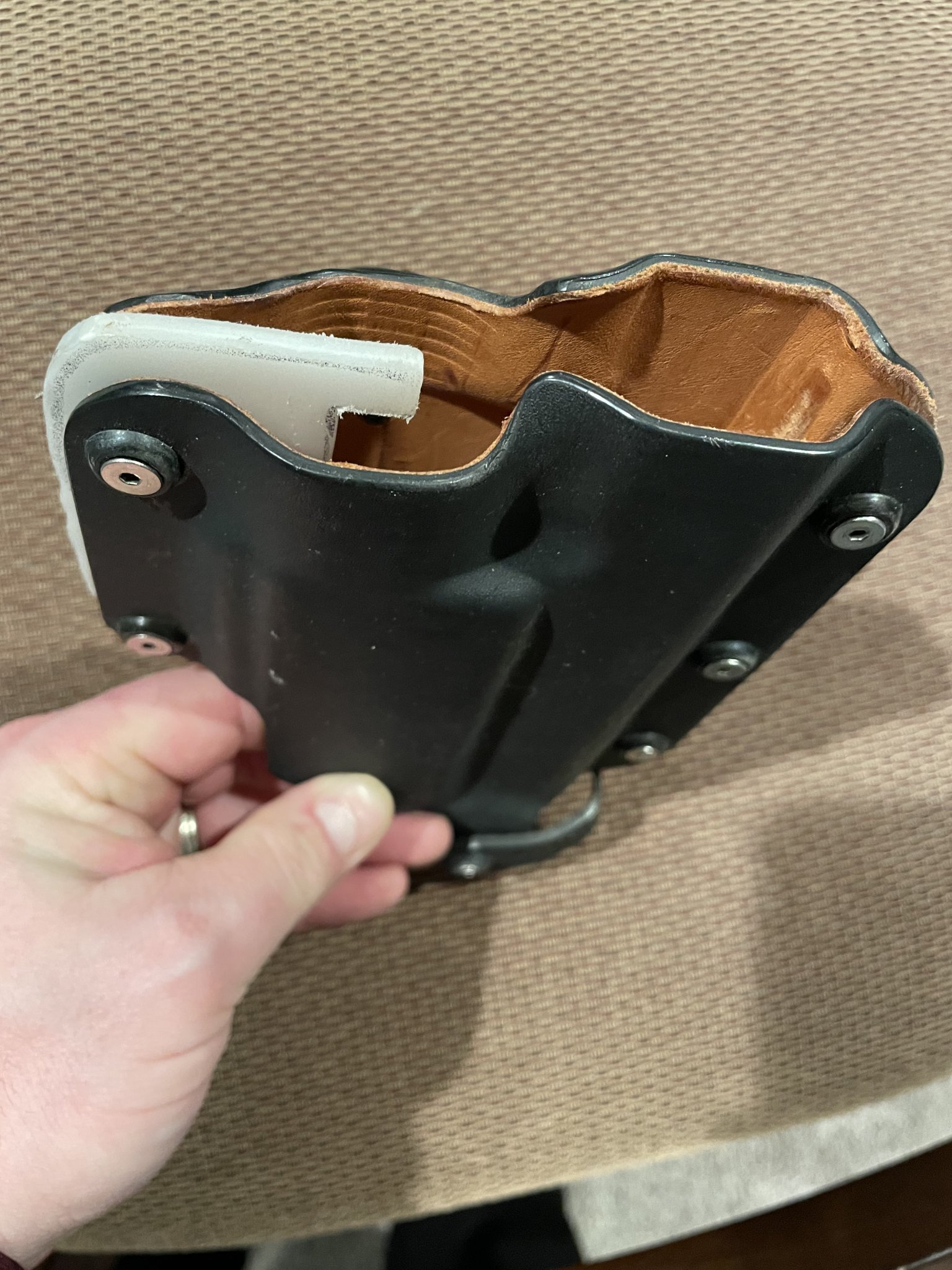 Leather lined Kydex. Light insert fits Surefire, you can trim/replace as see fit for other lights. I’ve sat on this for a long time and I just don’t carry my 1911 w/Surefire around to justify keeping it. If that’s your thing, this is a nice piece!