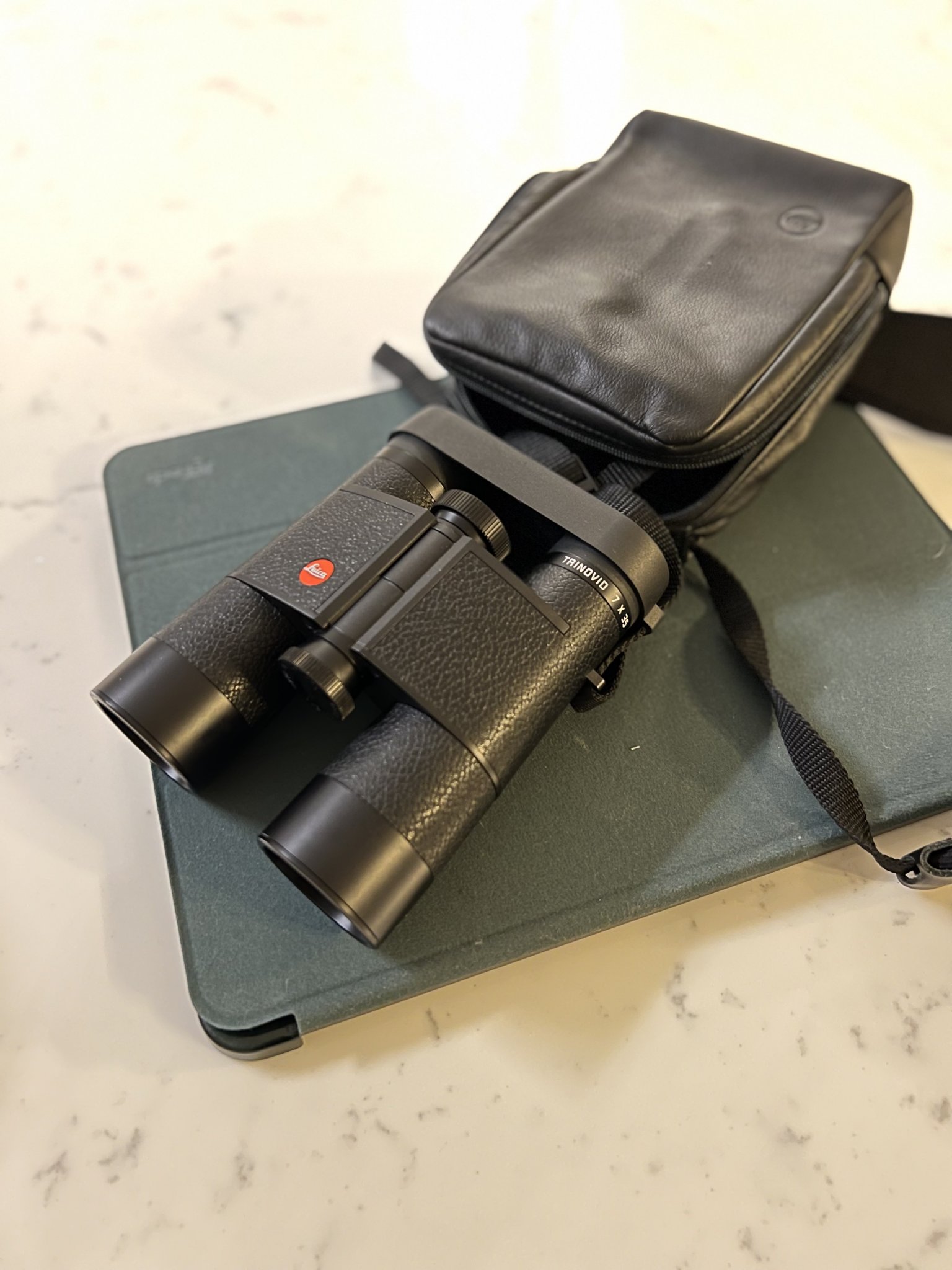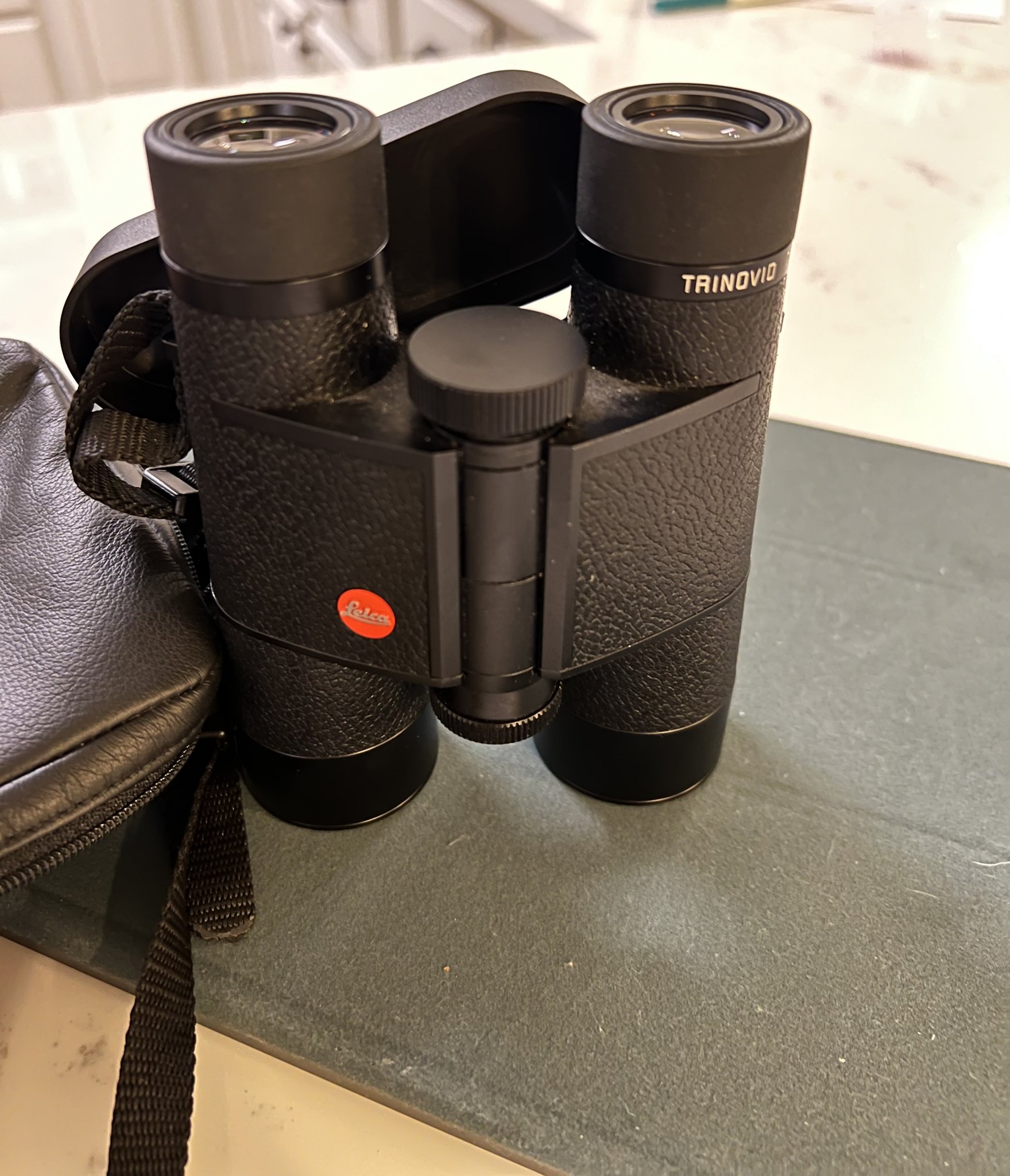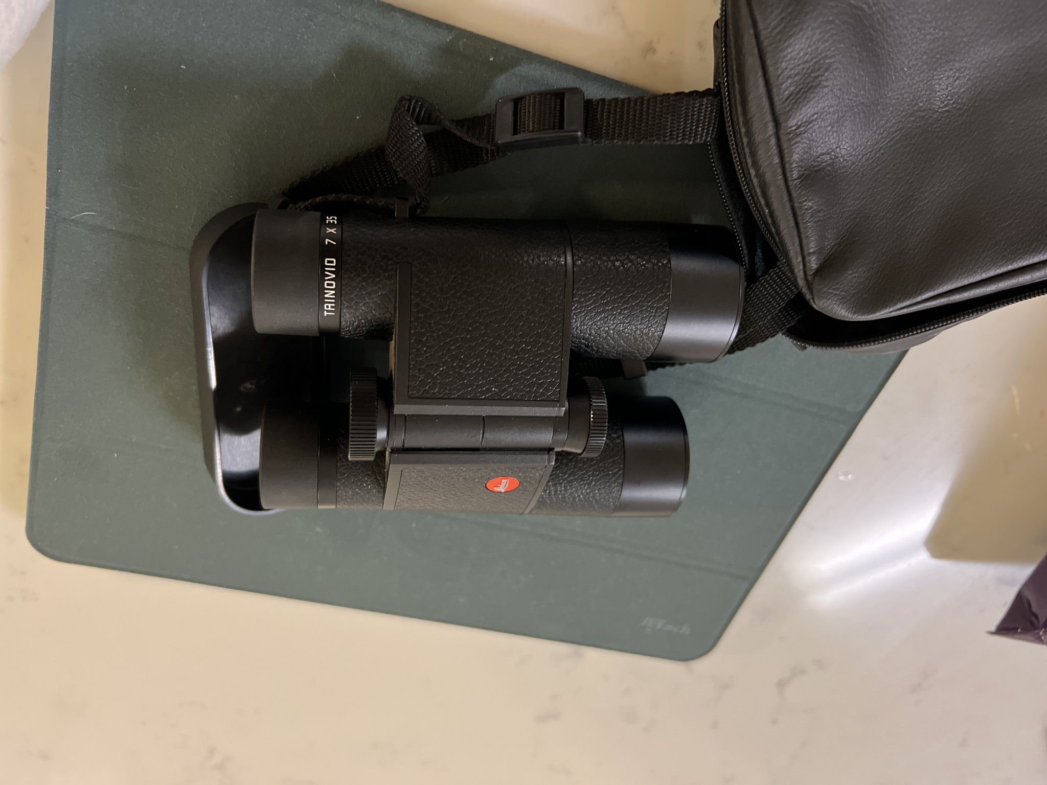Leica 7X35 Trinovid leathered binoculars. Just over 19 oz with a field of view of 450 ft @ a 1000. $850 shipped here in the US