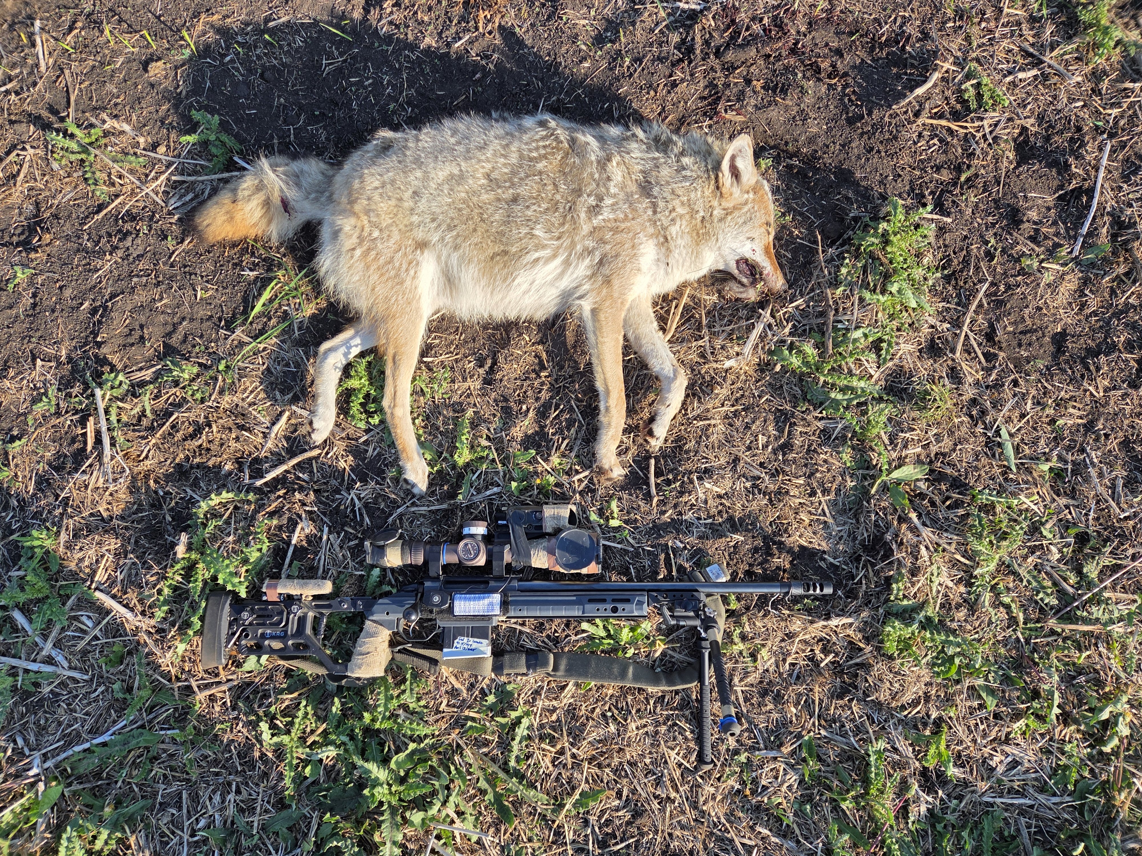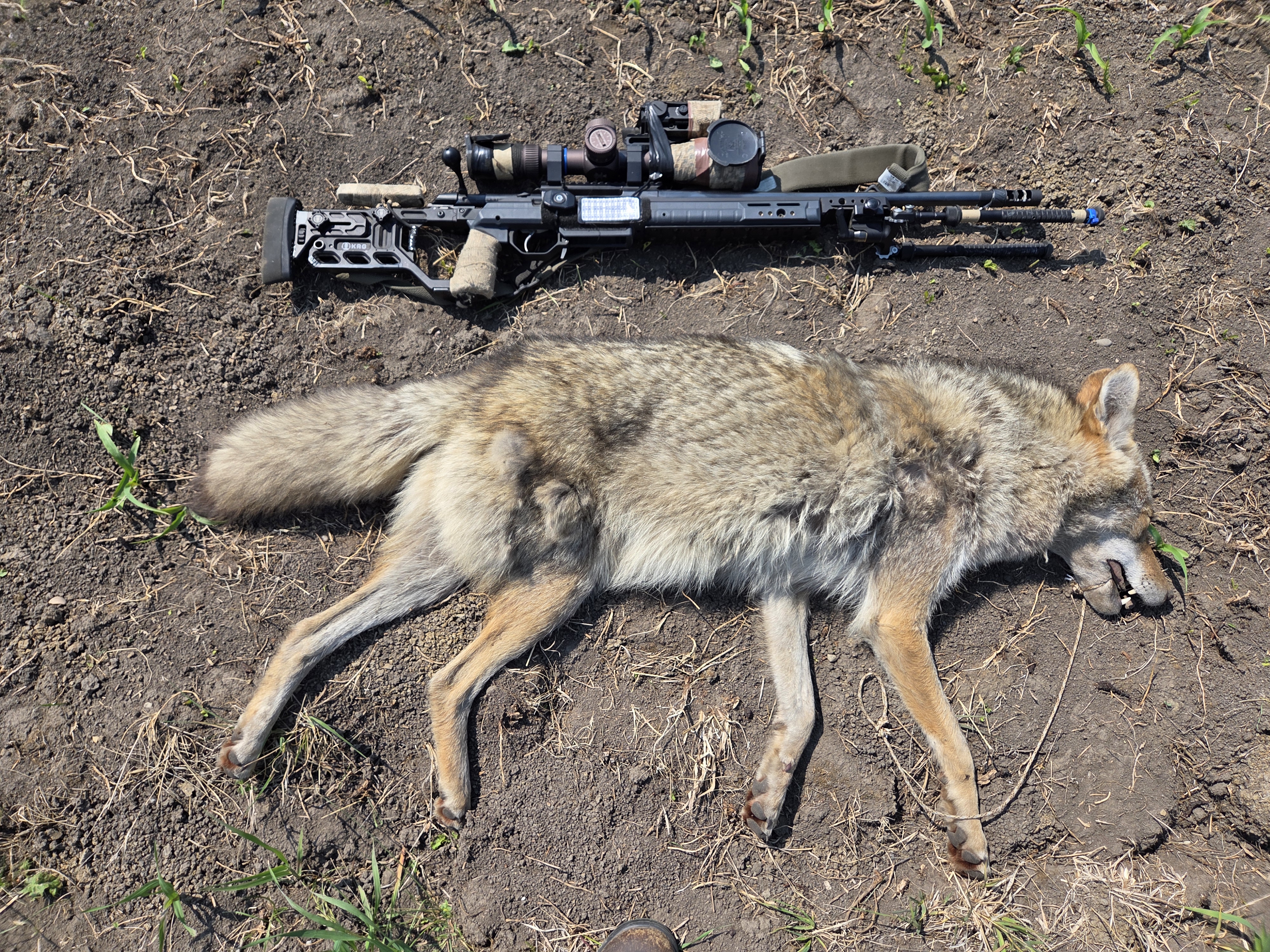 My scope was still on 12x, so I filled it with a coyote at about 30 yards and let fly. Had to finish him off because I didn't hit well as I was so unprepared.