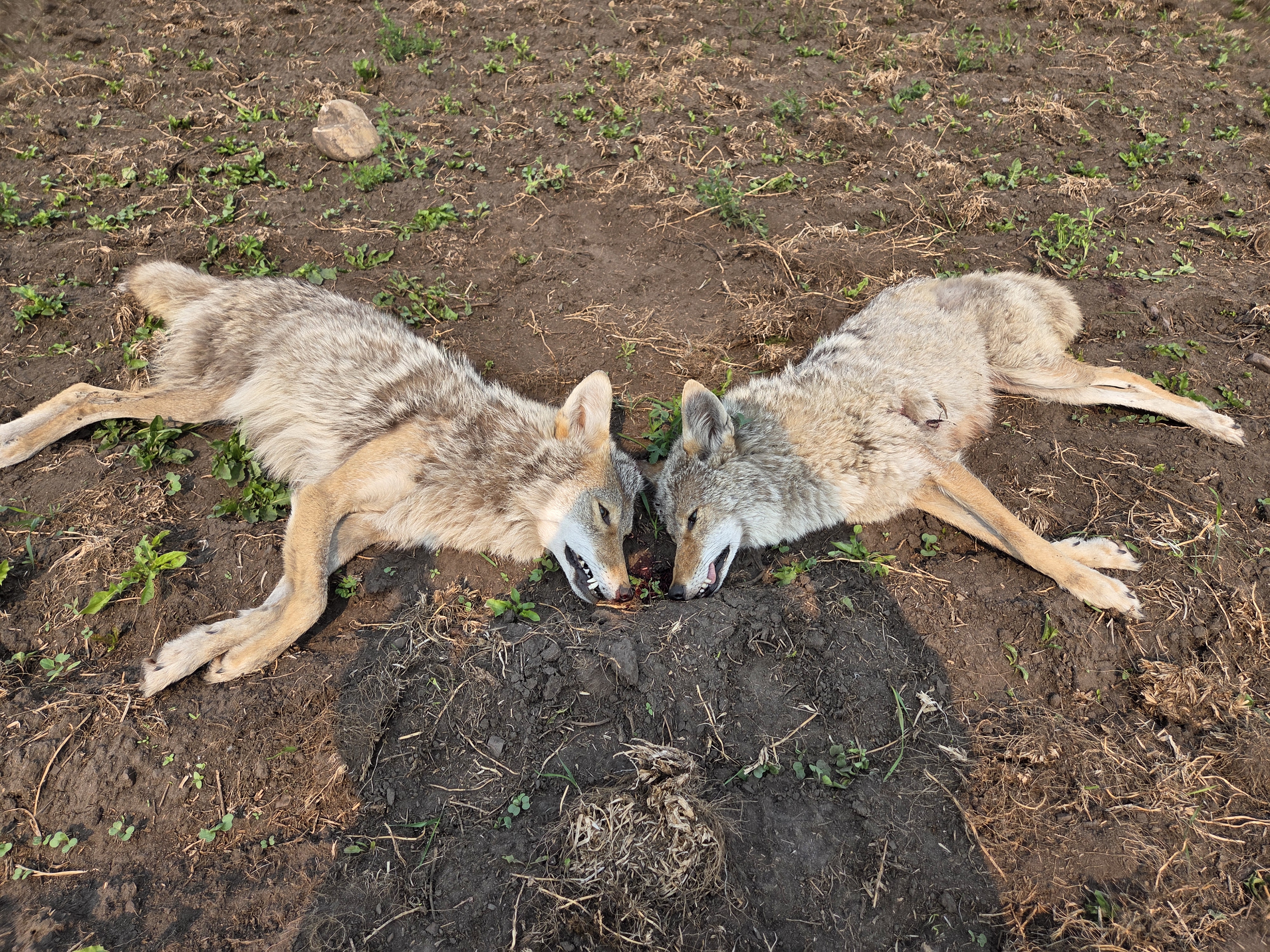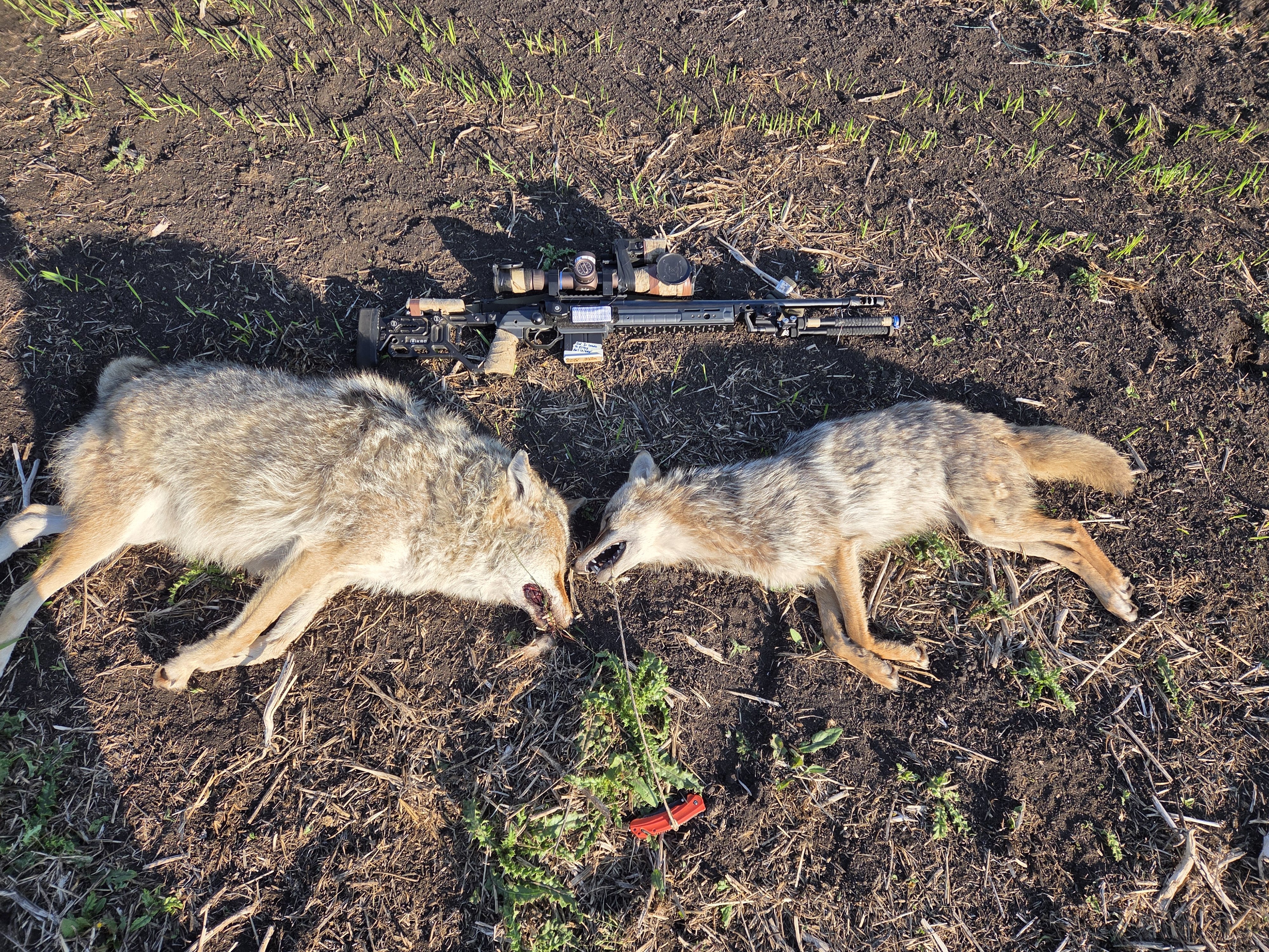 I got my first double last night just before the storm came in. I set up by a cedar tree watching an open field between some woods with thermal scope. The wind was right and a couple started coming across the field in tall grass. I have worn out the call and educated them since I hunt my 80 acres always. I got the first one and the other took off but stopped and gave me another chance. First was 125 and second was 240 yds. I really like the 204 Ruger barrel. I went back after daylight and found them after the rain.