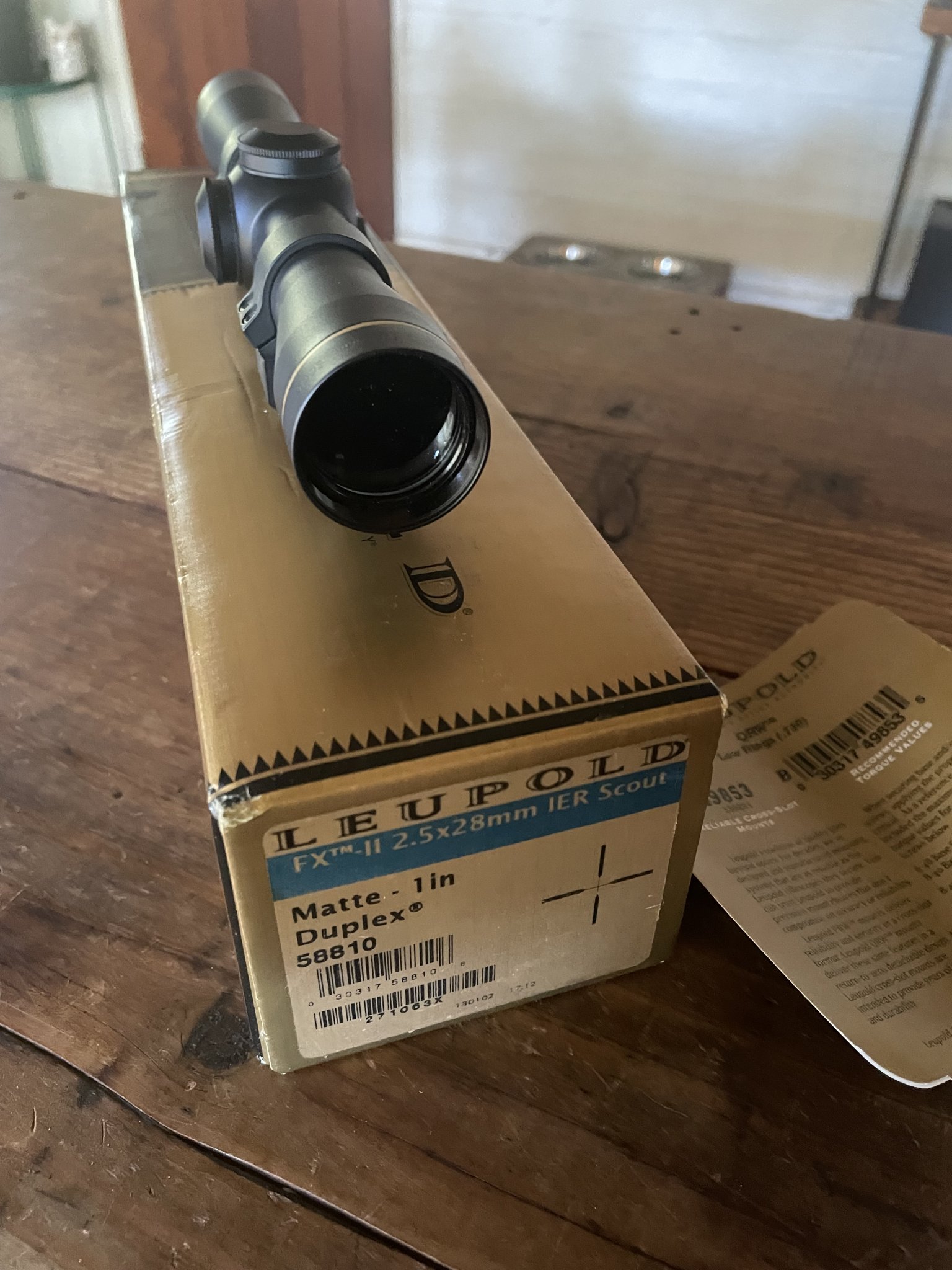 Leupold FX-II 2.5x28mm IER Scout scope. Matte black. Duplex reticle. Mounted but never fired. Comes with Leupold QRW low quick release rings. $340 shipped CONUS. Would trade for Eotech EXPS2 or 3, or XPS2 or 3 plus cash.