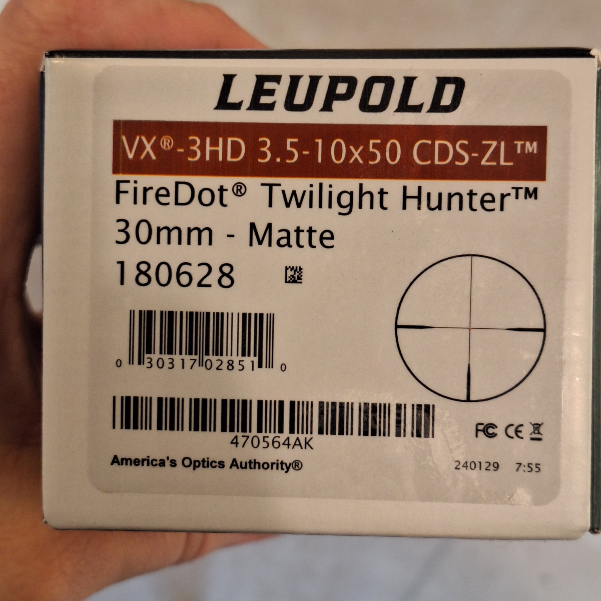 Leupold VX3HD 3.5-10x50 CDS Firedot Twilight Hunter Illuminated 30mm tube. Light signs of use on turrets. Selling since I bought a Burris XTR 3 on the Eurooptic sale and it will be replacing this on my 308.
