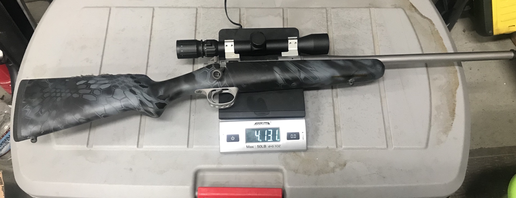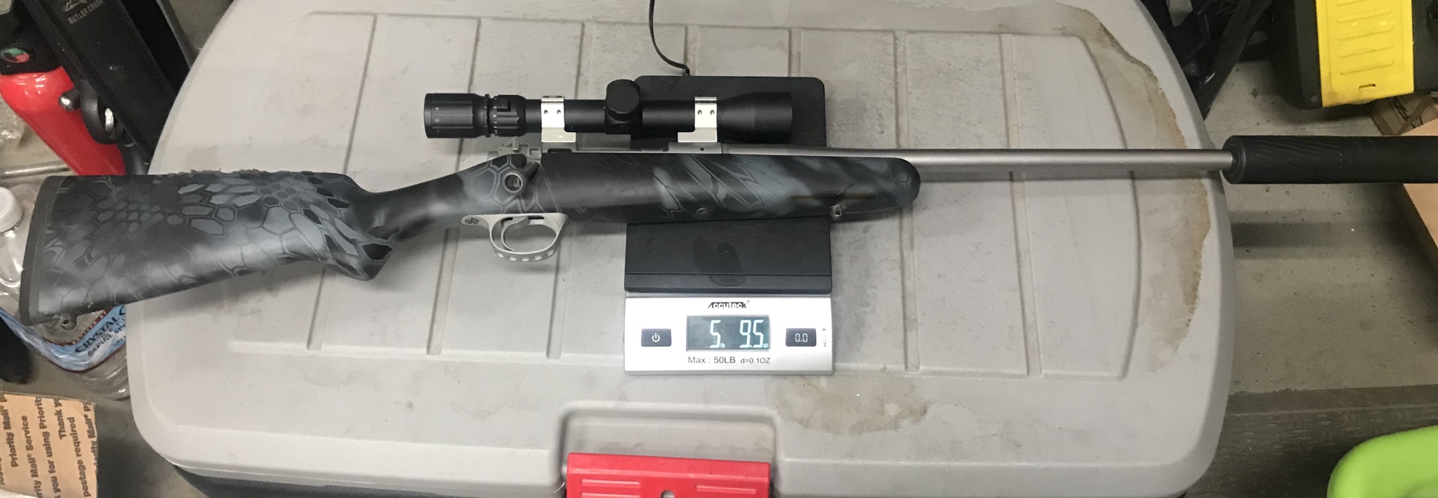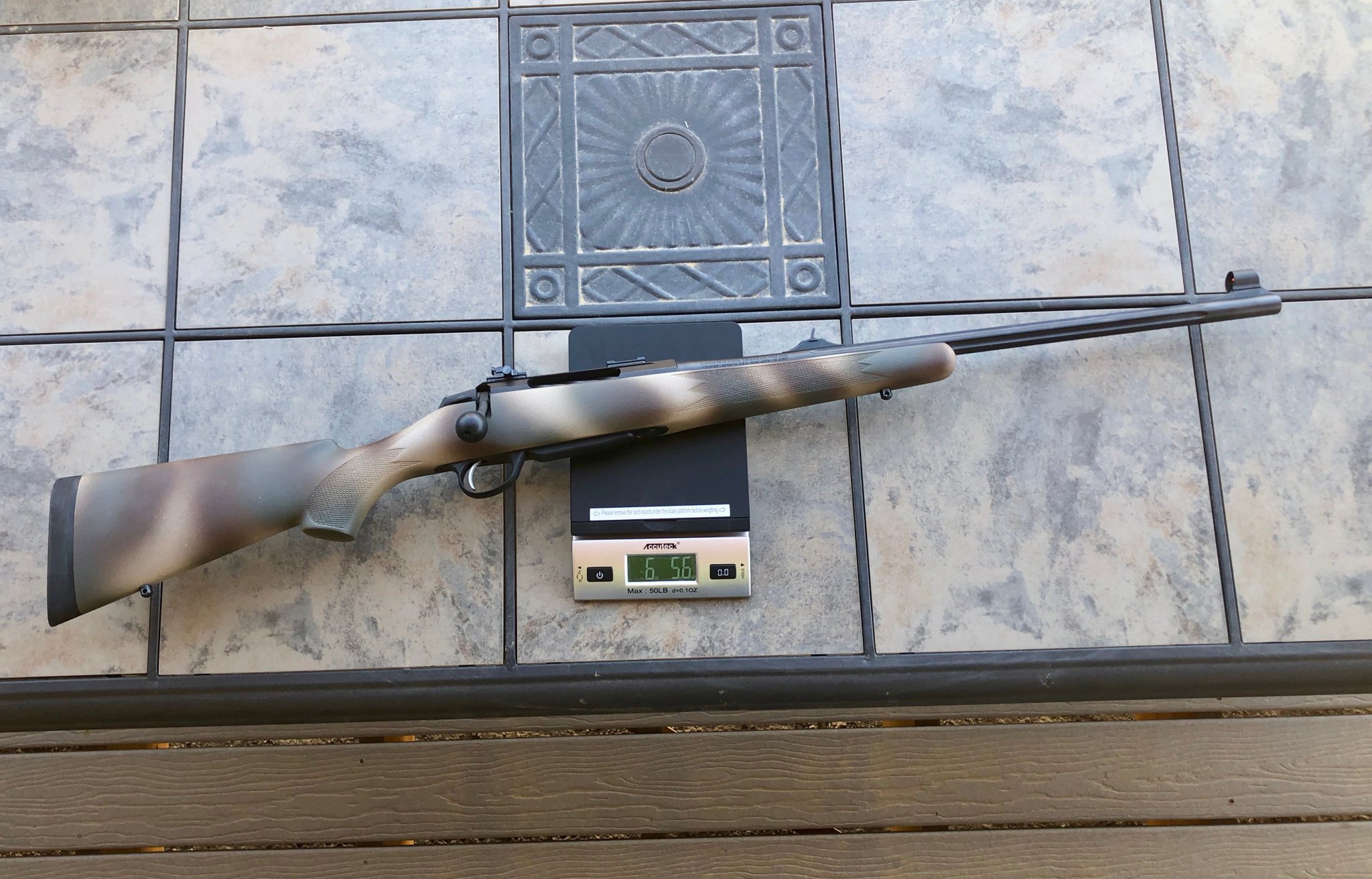 Its 4.8 pounds scoped with the little 2.5-10 SWFA Ultralight on it and 5.6 pounds with a TBAC ultra 7 on there.