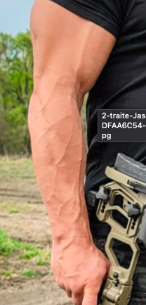 hes also flexing you can tell by his right chest/pec..its "pulled up" not hanging