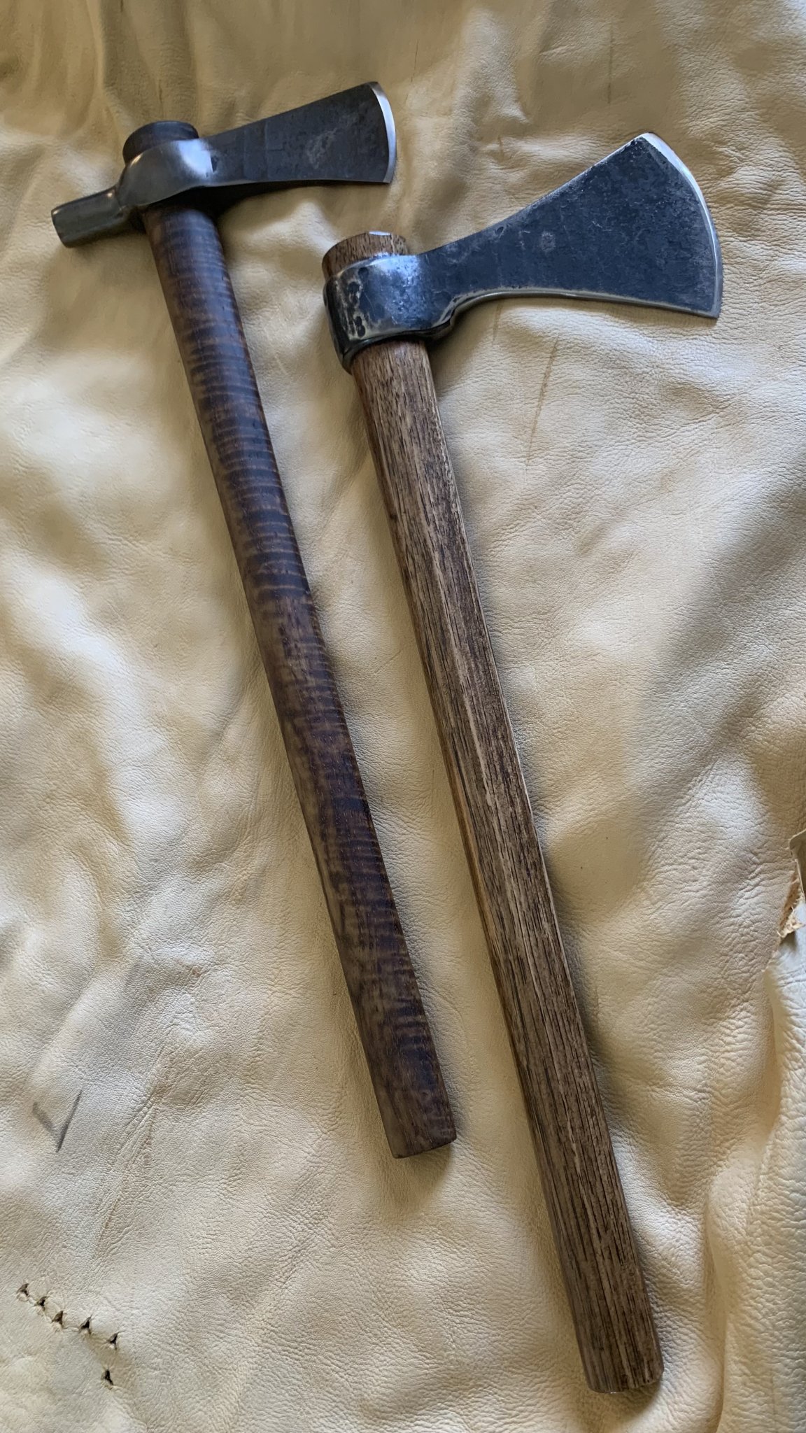These two aren't as nice as yours but I like them anyway. They are made by Beaver Bill. The head on the left tomahawk is made from an old .22-250 rifle barrel.