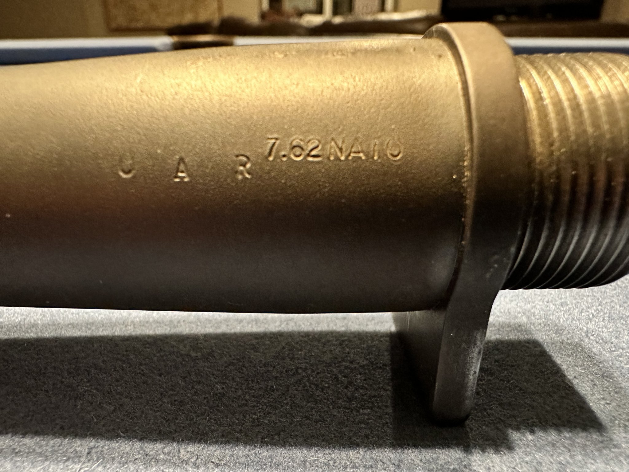Here's a few photos of my original M40 (221235) with a receiver produced in 1966 and a barrel (UAR) produced in 1968. Most likely this receiver was an overrun that was in storage and then shipped to the Corps at a later date with a new barrel. The U is the final inspector, the A is the month and the R is the year, so this barrel was produced in March 1968. Notice how this barrel doesn't have an assembly number and it's stamped with 7.62 instead. The UAR is marked further down the barrel, leaving enough extra room for the 7.62 stamp. The 7.62 stamp wasn't an afterthought and the stamps aren't squished together. If a barrel has the markings squished together, then the 7.62 was added at a later date.