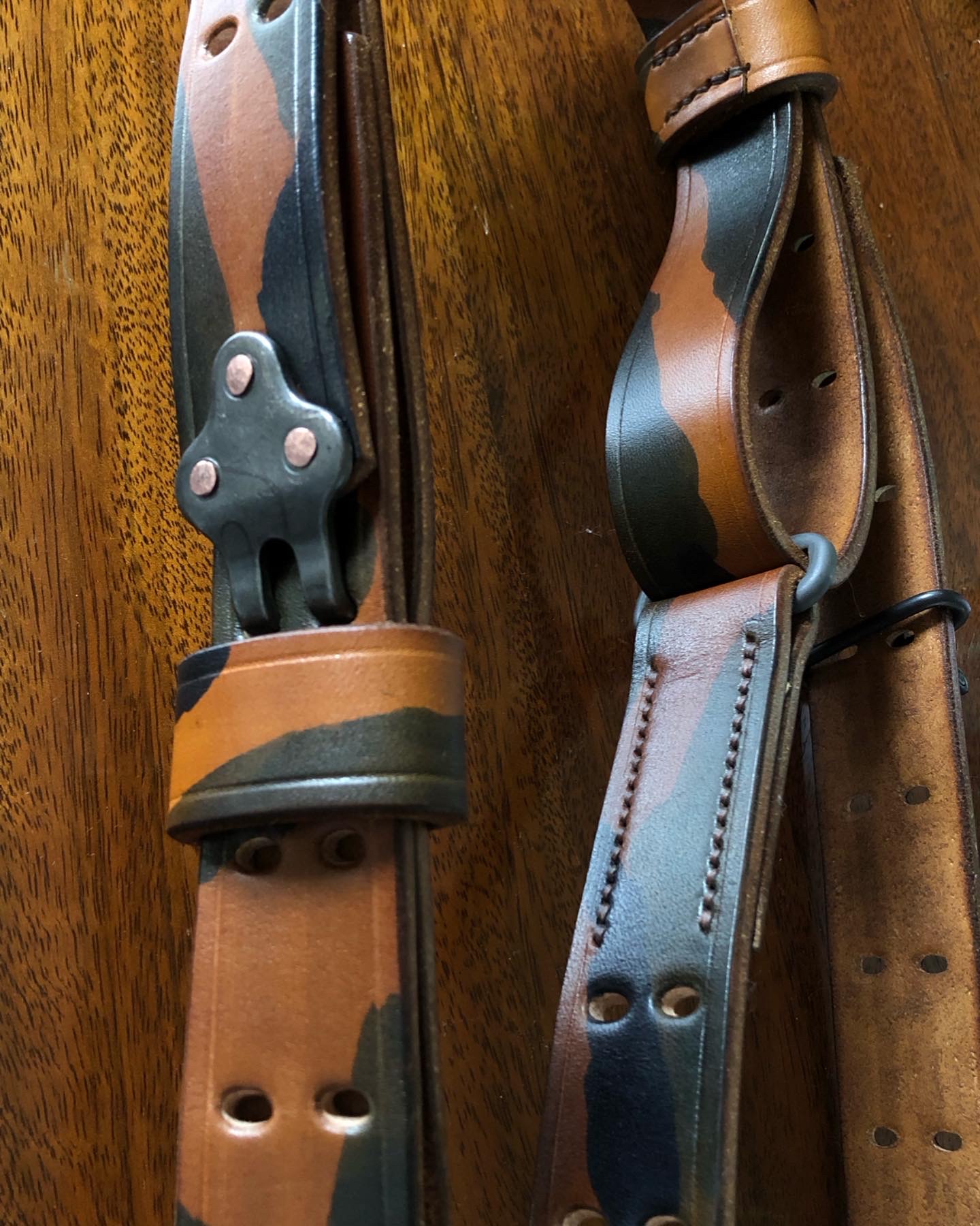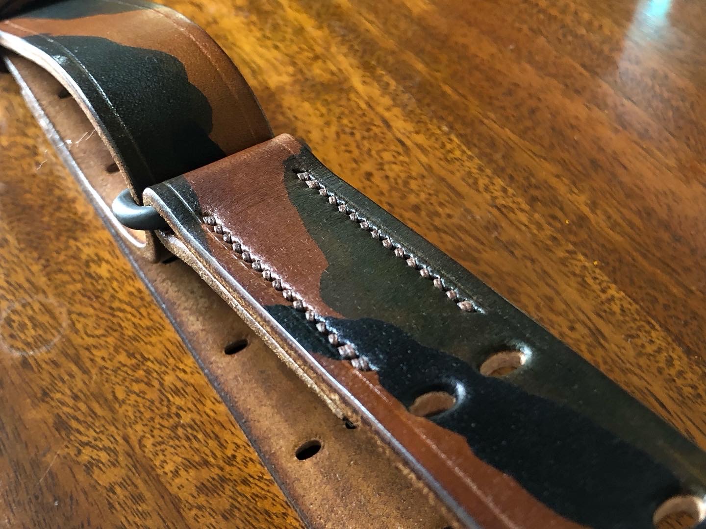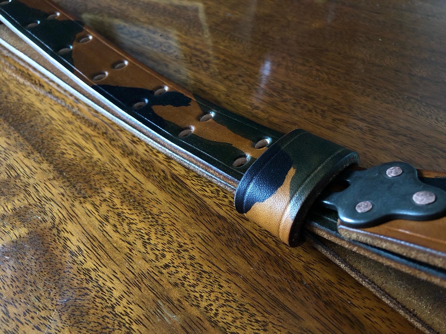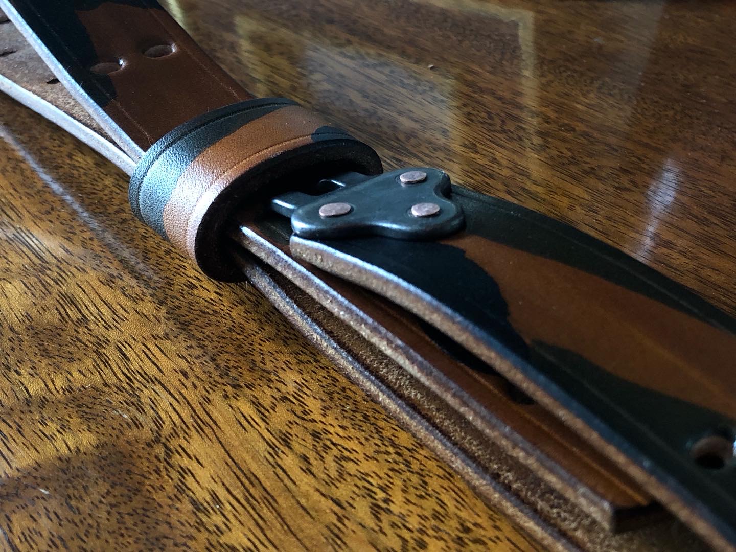 The frogs (claws) are surplus as well as the steel connecting ring. Very sturdy. All stitching is done by hand with .8mm polyester thread. Leather is dyed, finished and oiled by me. It started life as Wickett and Craig "American Vachetta" leather. Hardy stuff, 10-12 oz (3/16") thick. Edges are sanded, burnished, and waxed so no fuzzy edges.