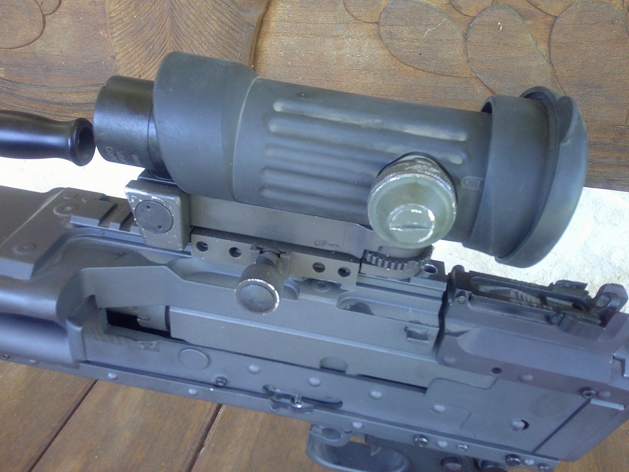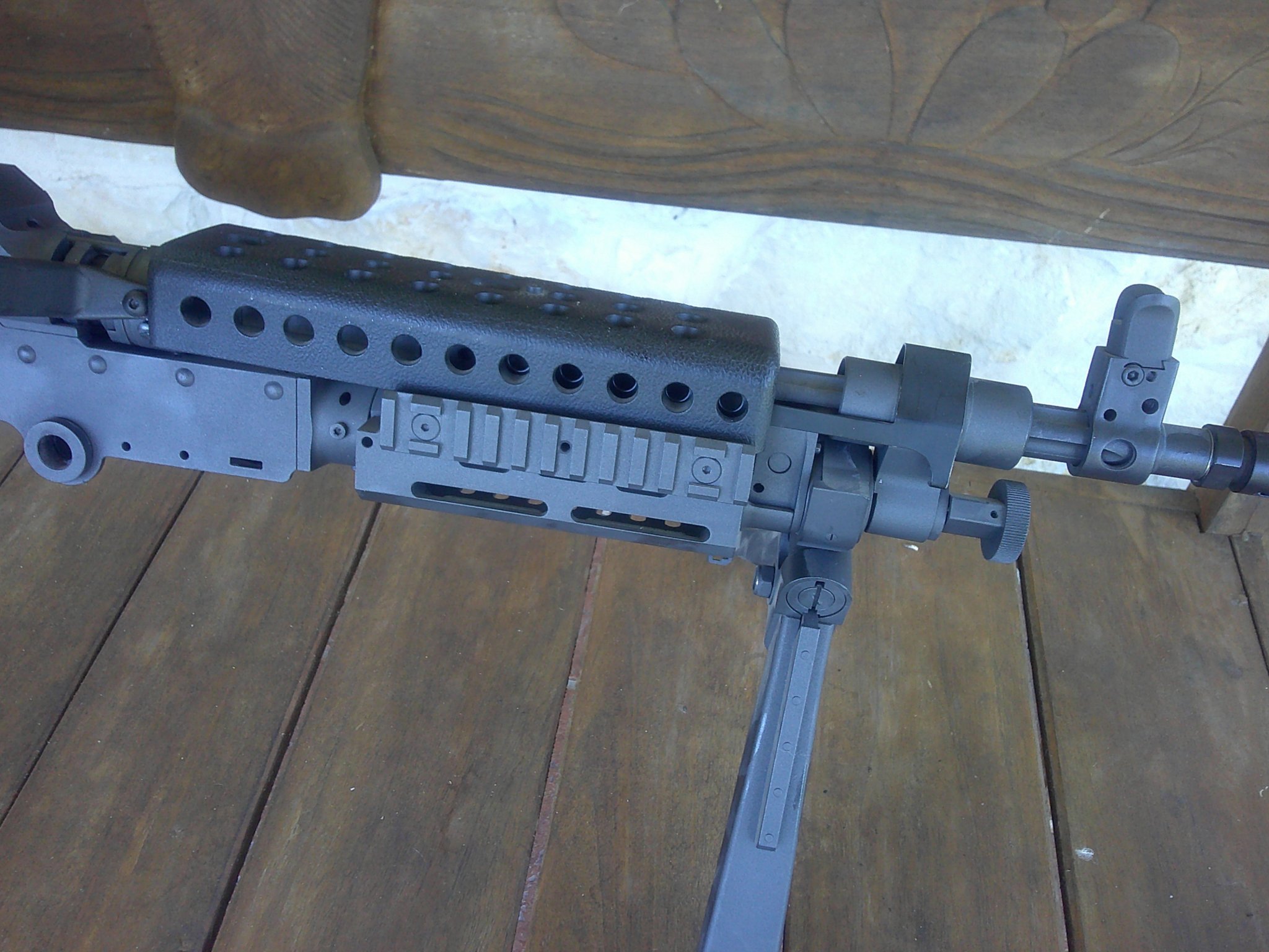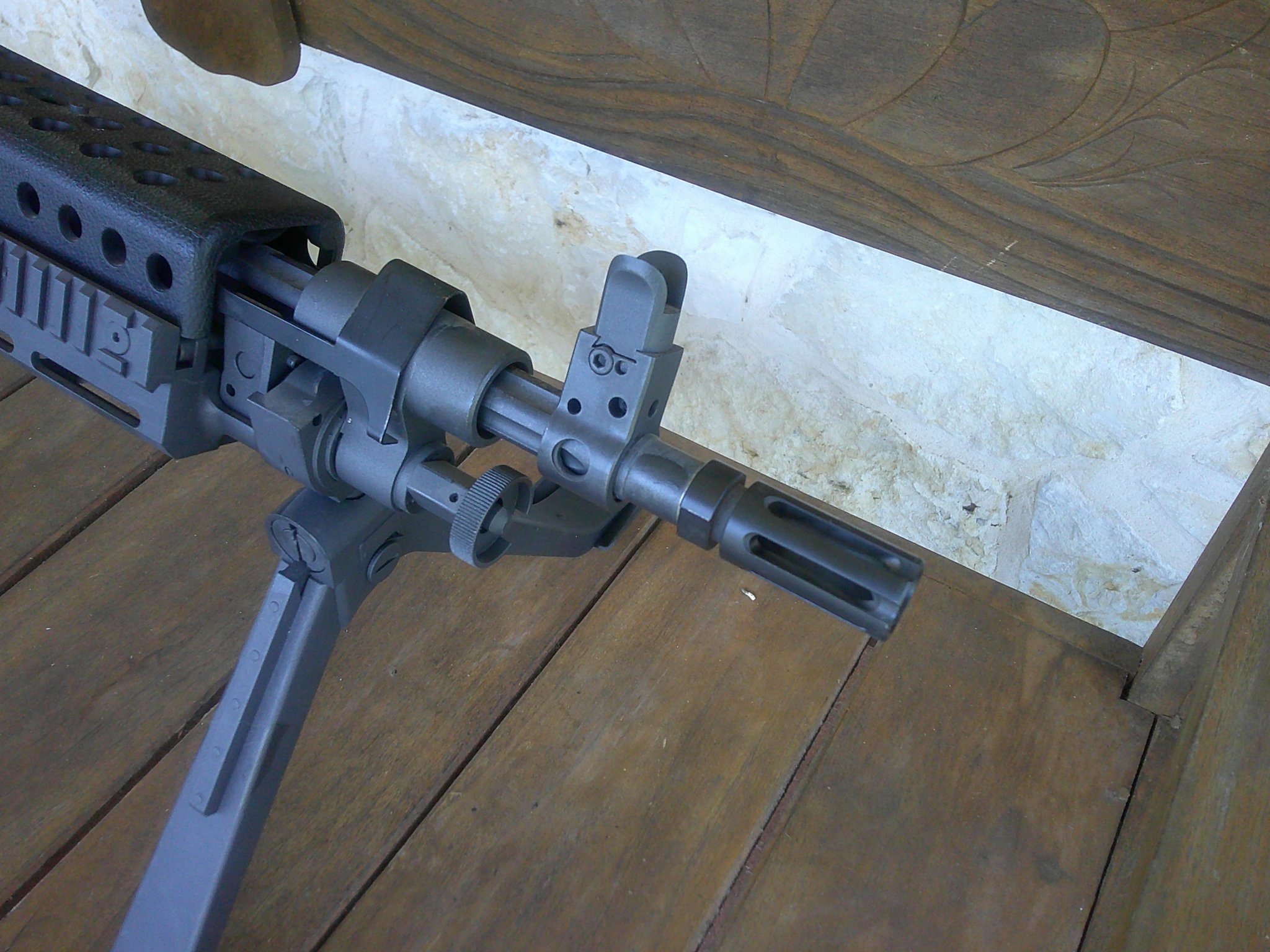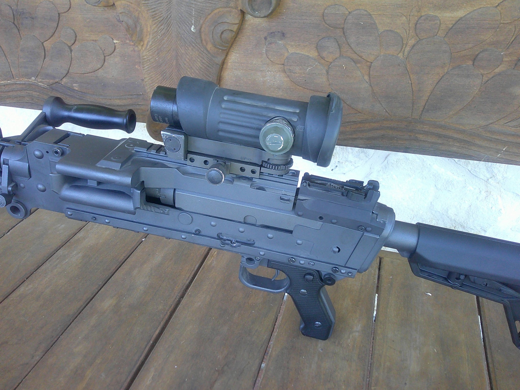 M240 semi-auto copy in 5.56. Uses AR-15 magazines, including drums. Magazine fed only...feed tray cover is fixed and will not take belts. Can be vehicle/tripod mounted. Fluted match barrel, 223 Wylde chamber 1:8 twist