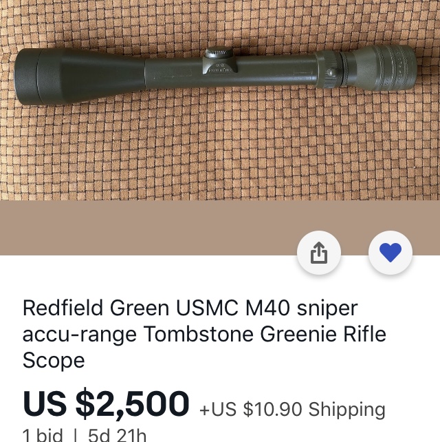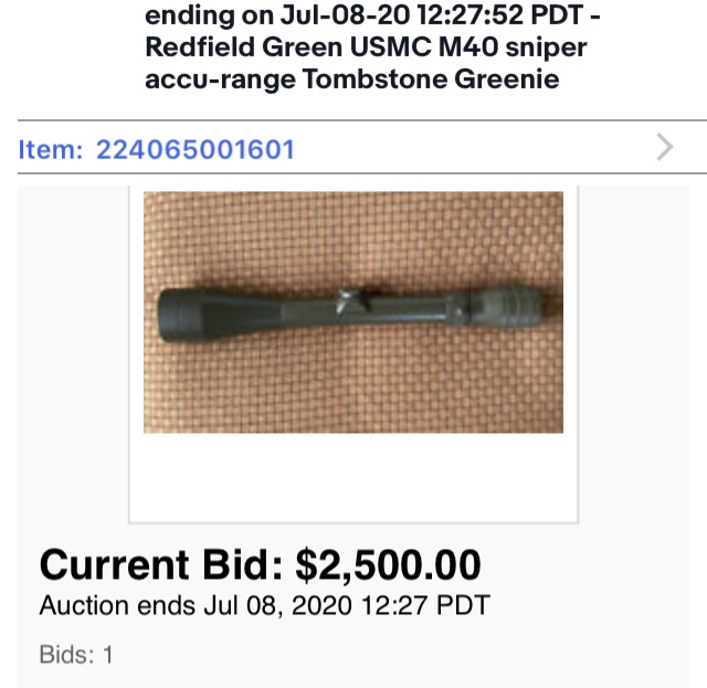 I'm still upset that I didn't get the real greenie in June 2019 on eBay as I was the highest bidder all week, but an eBay programming error re a false "ITAR Warning" prevented me from increasing my bid in the final day, and another guy in TX got the scope (as noted in post #31). He was not a collector, didn't have an M40 replica or even an interest in building one, and of course flipped it immediately for huge profit. I don't think I'll ever forgive eBay for their programming error or myself for not jacking up/doubling my initial bids to secure that nice greenie since I was the highest bidder that week... It will always be "The Greenie that got away.ā€