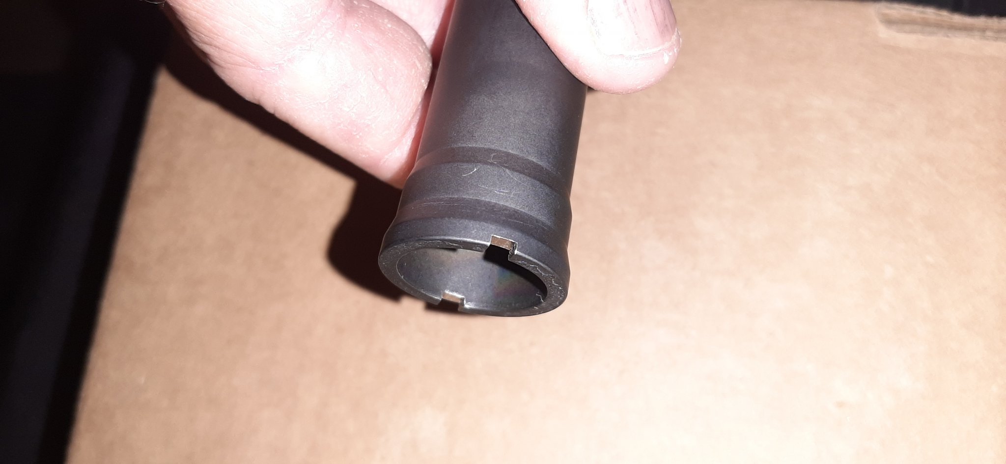 Sorry for such a screwed-up question, but I purchased a used, vintage Surefire MB762SSAL/RE muzzle brake from a seller on Gunbroker for an M40A5 build and when I received it, I found 2 cut marks on the back of the muzzle brake that look fresh. They are not in the photos in the listing. So when I contacted the seller, he said they were put there by the armorers for the aiding of removal with a spanner wrench in case they got stuck from carbon build-up. What do you all think? I have never seen this in any of my research of M40A5 rifles before collecting the parts for my build. I chose this over the other new ones on G.B. because it was an early version before the patent number when it was marked "Patent Pending". That's why I chose his listing. And this is what I got. Any help would be appreciated. If this he is correct, I'll keep it. But if this is someone's mistake, I'll send it back. Thanks for your input!!