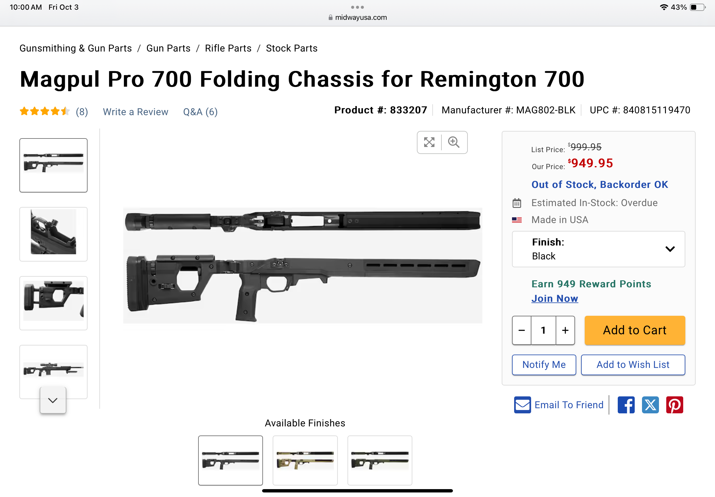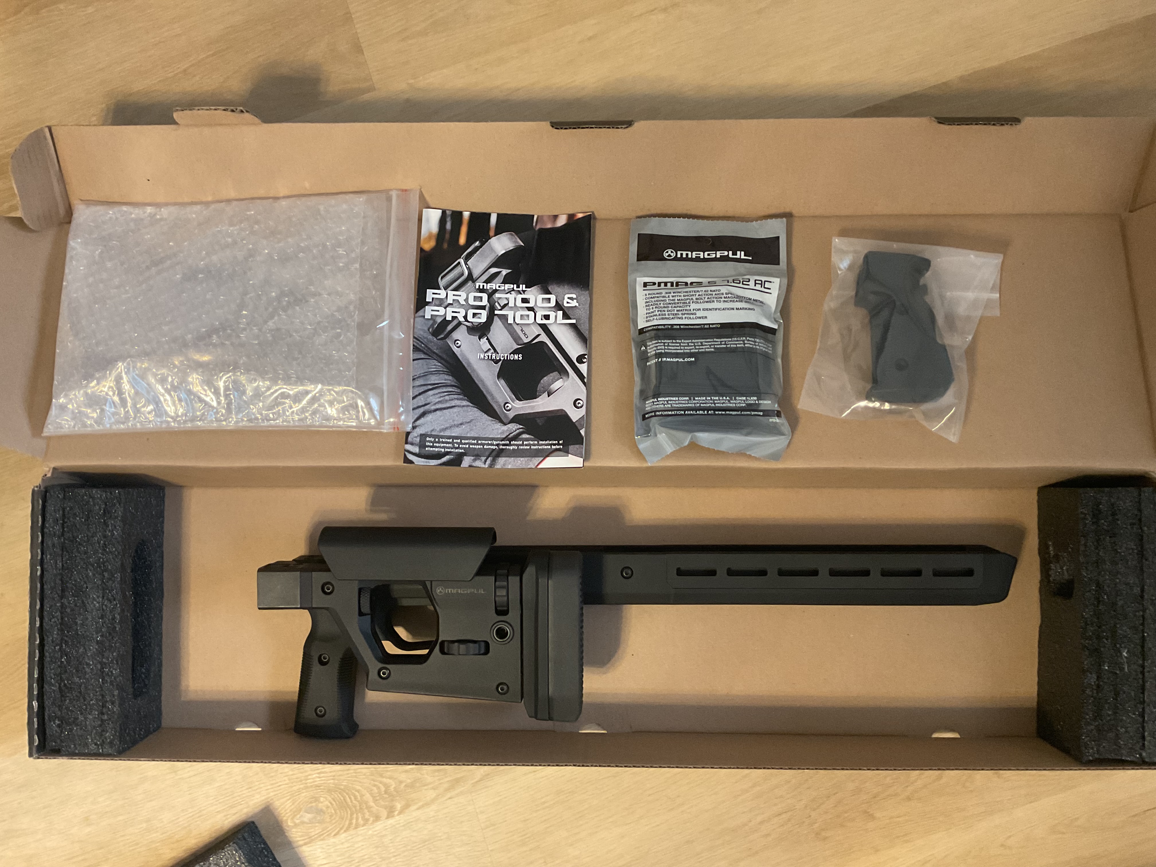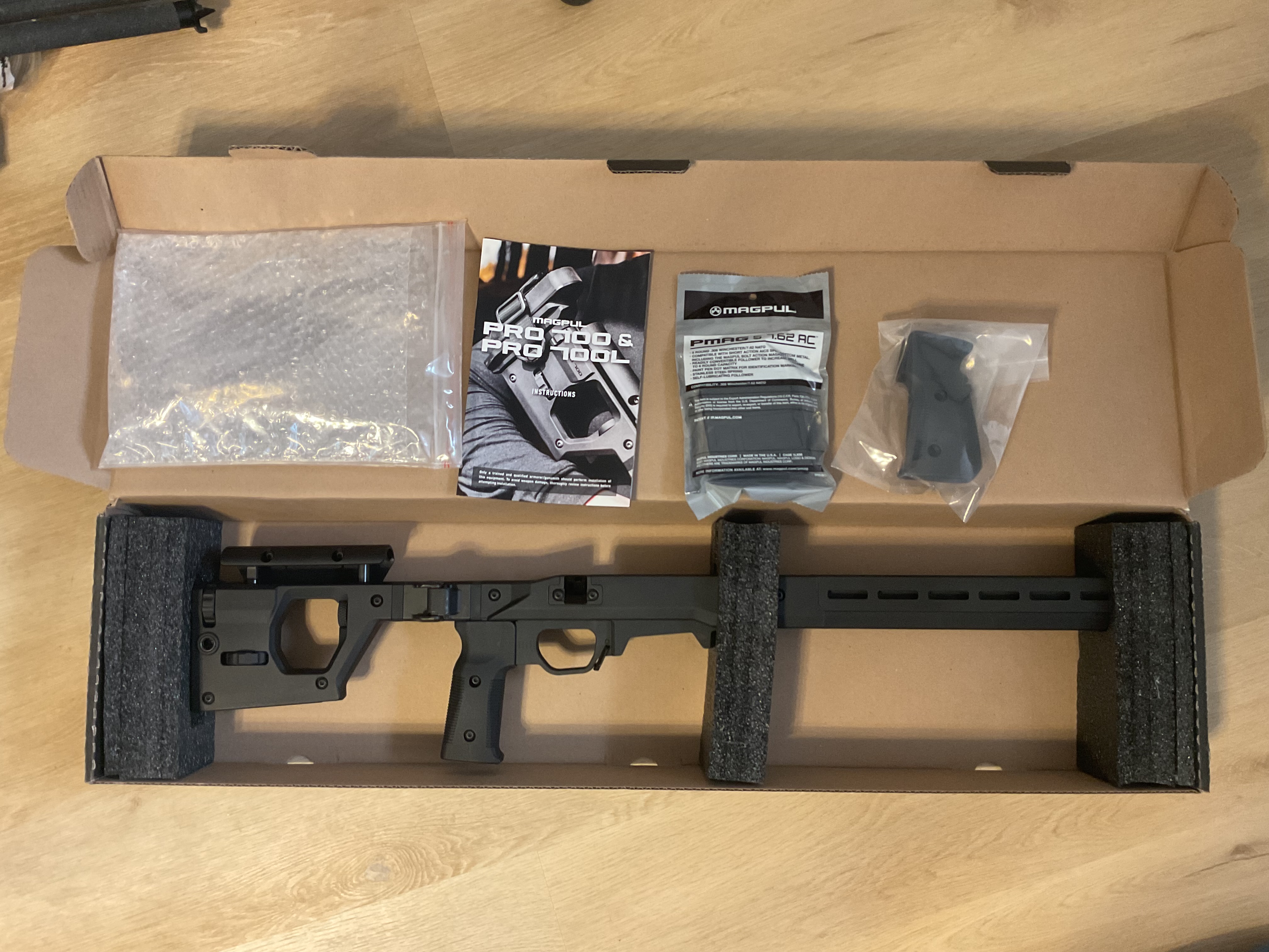 This is a black folding chassis for short action Remington 700 cloned. Able to accommodate right and left hand actions. Fully adjustable comb height and length of pull