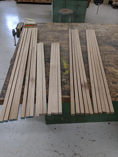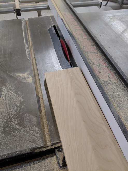 My very first step was to ensure the boards were all the same exact thickness and entirely flat. Through the surface planer at the wood shop they went, one at a time, until no defects could be seen on either side of either board. The next step was to run one side of each board across the jointer to make sure I had a perfectly flat edge on one side before ripping them down into multiple sticks on the table saw.