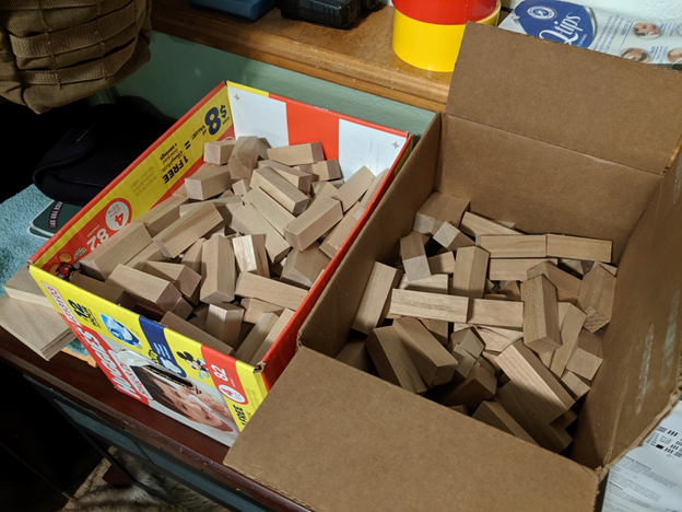 Third, the boards made several passes through the table saw and I then had several lengths of board that were all about 7/8” square, and ready to get chopped up into 2.5” long Jenga-like pieces. To the chop saw I went and eventually two boxes of little Maple and Cherry pieces sat before me, ready to be glued together. My glue of choice was Gorilla wood glue as I had read excellent reviews on it.