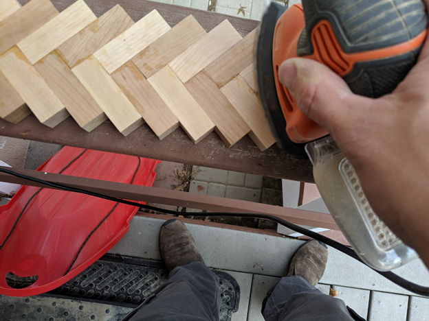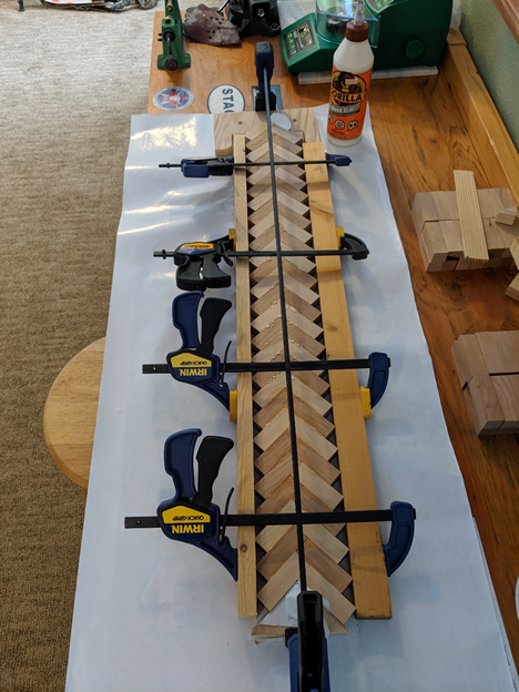 Gluing these pieces together was a challenge! I needed to work up a jig of some sort to make sure that everything stayed square to each other and so every board I glued up was as identical to the other as possible. A small piece of plywood received a square corner cut out of it like a triangle and one of my left-over pieces of Cherry got nailed down to my loading bench to act as a clamping surface along one side. Another small triangular piece of plywood would act as a wedge to push everything together from behind and a plain 1x2 piece of pine was the other clamping surface for the other side. In total, I made 3 boards measuring 36 inches in length with alternating cherry and maple pieces in herringbone pattern. I then glued together four more boards that were 18 inches in length. Before gluing the pieces together, I put a sheet of wax paper down to prevent everything getting glued to my bench. I also put a piece of wax paper at the front and around the triangular wedge at the back. This worked amazingly well as the board didn’t stick to the wax paper once the glue was dried, it all just peeled right off and I could reuse the same pieces of wax paper for the next glue-up. All pieces I let sit for 24 hours before releasing the clamps and pulling the boards out of the jig.