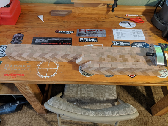 I wouldn’t say I play a lot of chess, but I like the game and the strategy that you need to have to win, especially against an equally competent opponent. This whole precision rifle game is much the same way, you need a strategy and be always forward thinking. For my stock idea, my mind went toward making a chess board layout down the sides with the end grain of the wood; oak and walnut would provide the contrasting colors. I was sitting on a couch mulling this over in my mind when my buddy says “whatcha thinkin about over there?” I hadn’t really realized it, but I was basically staring off into space and had been quiet for some time. My response was a simple, “Just thinking about stuff, a new stock idea.” That’s when the discussion really began. I explained what I was thinking about, how I’d go about putting it together, and the whole deal. Now our other friend, usually the guy with a very close relationship with the good-idea-fairy, chimed in. He took my idea a bit further and thought that instead of having the pieces oriented perpendicular to the centerline of the bore, to put them at an angle so more of the grain would show through and have a cooler look along the top edge of the stock.