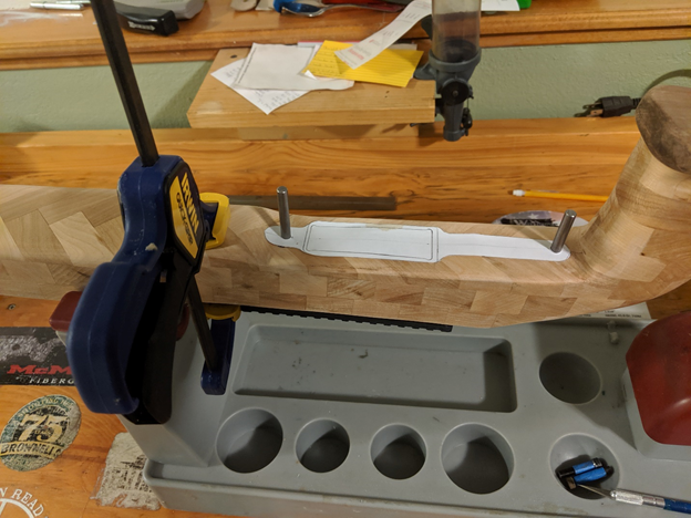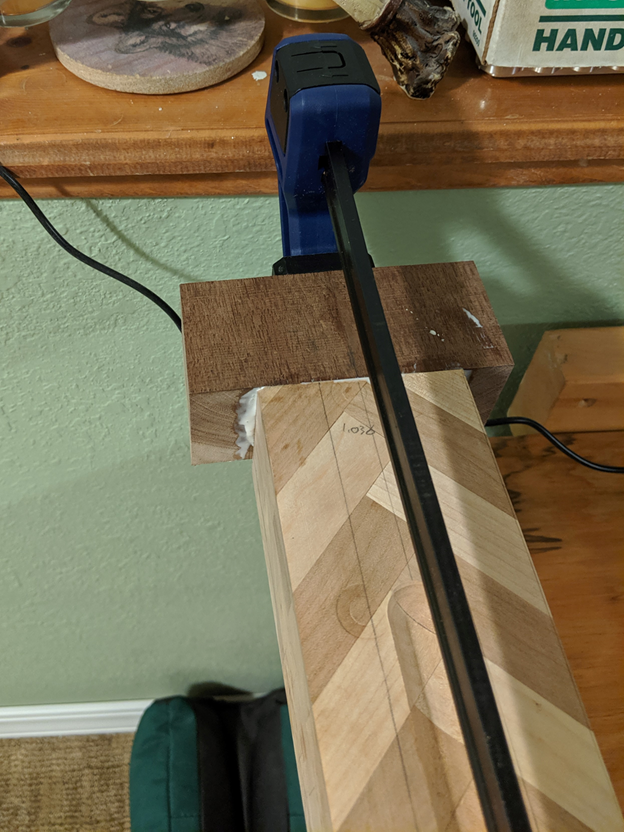 I first glued the three long boards together that would be the forend, action area, and top of the buttstock. I then glued two short boards together, then individually glued one more layer at a time until I had four layers of the shorter length boards. These were glued to the bottom of the back portion of the long boards to complete the depth I would need for the rest of the buttstock and pistol grip. This is also the time when I decided I wanted to use some walnut as a forend tip, grip cap, and buttstock accent pieces. Back to the lumber yard I went and managed to locate a few scrap pieces that I could make work.