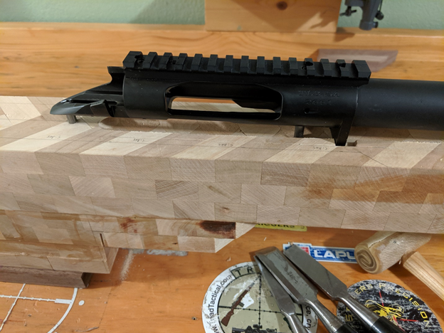 Starting the inletting was a little stressful because this is the very first stock I’ve ever made. Well, not quite. I actually made a thumbhole stock for my Ruger 10/22 back when I was in high school, sometime around 1996. That stock was made from Walnut and oak, with the oak board being sandwiched between two walnut pieces like an Oreo cookie. I still have that stock and rifle today. But this project is on a completely different level than the one I made in high school, my margin for error was much less. First thing to get carved into the stock was the recoil lug pocket. Away I went with my chisels, and Lord help me, a Dremel!