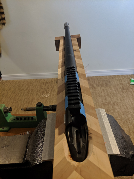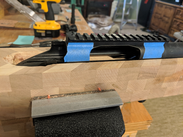A sanding drum on my Dremel and a little bit of time, and I was set. I took two regular action bolts, wrapped blue painters’ tape around them so that they would just barely slide into the pillars, then trimmed the excess blue off level with the pillar. This ensures that the action holes are perfectly centered in the pillars when the pillars get bedded into the stock. The action bolts with the pillars on them were then threaded onto the action and more test fitting was done until I was happy with the fit and placement of the action and barrel in the stock.