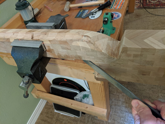I didn’t take pictures of everything as I had originally intended, my focus was on inletting the stock, not taking pictures. But I used a router attachment for the Dremel to help keep me steady for carving out the barrel channel. I would make several passes, then switch to the barrel bedding scraper and sandpaper wrapped around a wooden dowel. After several hours, and several hours more, I had the barreled action dropping down nicely into the stock. I lost count of how many times I lowered the action down to check for alignment and fitting issues. Everything was staying straight down thanks to the stock makers bolts though, and persistently checking for clearance and only removing wood where it had to come out. Time to go back to the band saw for some more shaping now that I know everything is lining up as I intended.