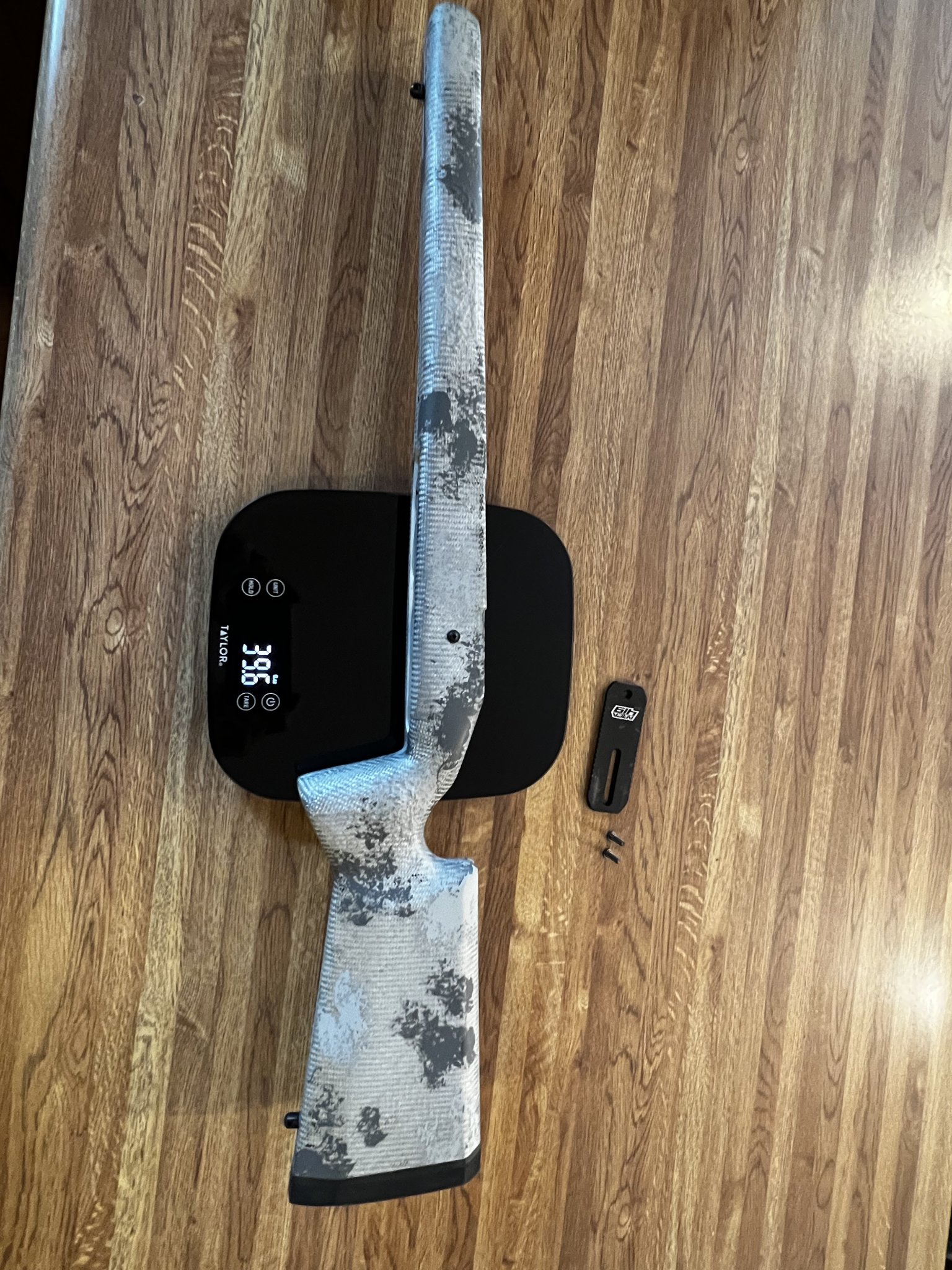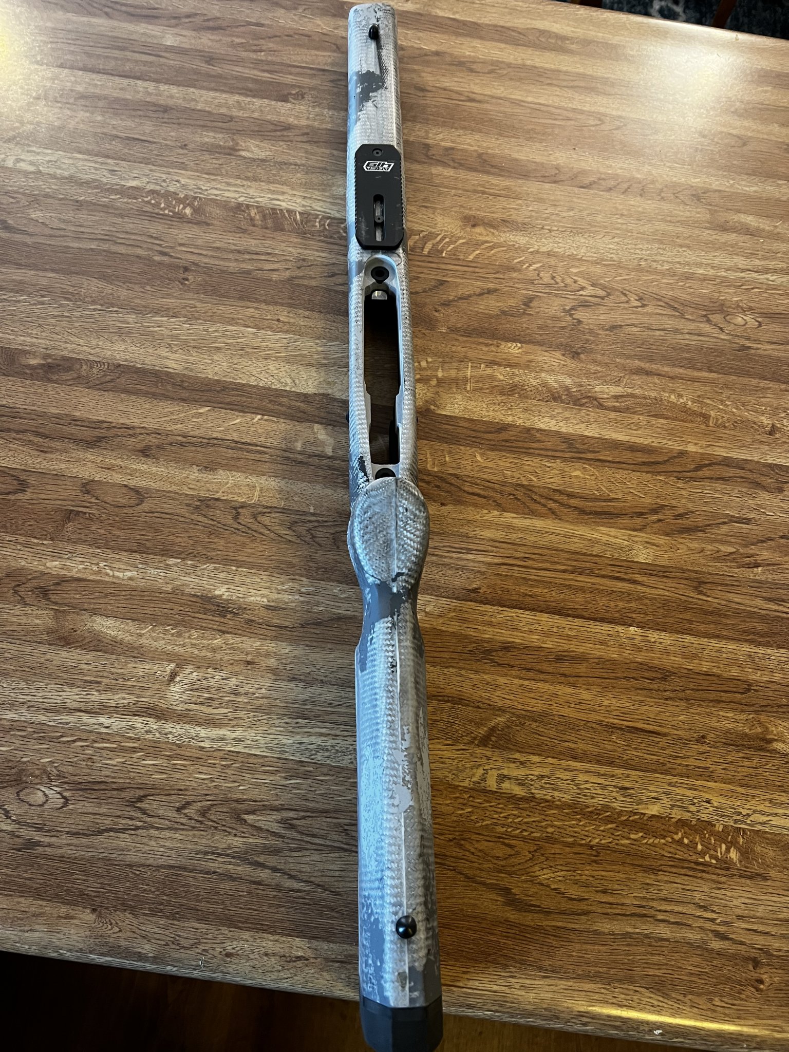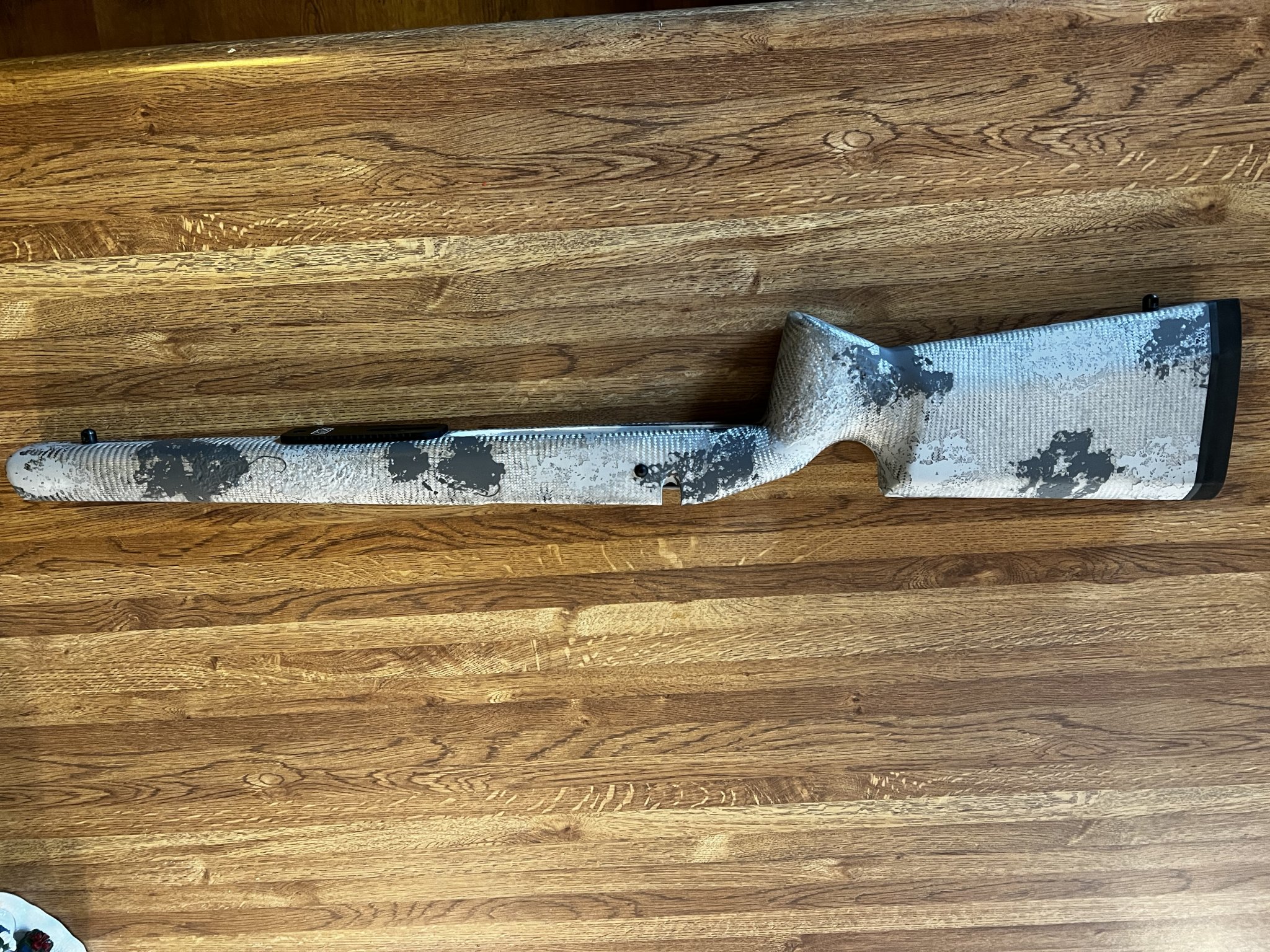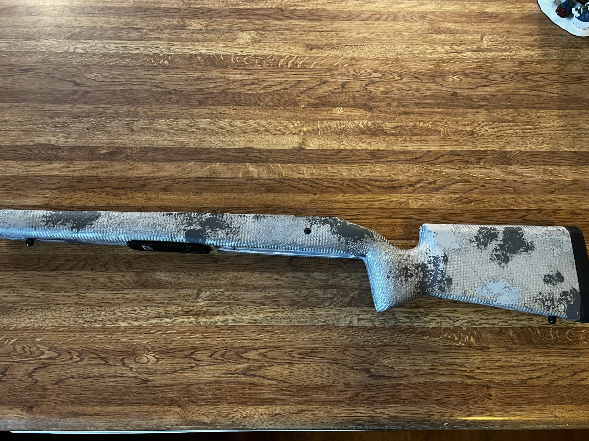 This is a Manners EH1-TK with the mini chassis and factory trigger guard (not included). This stock is finished in the now discontinued Elite Tac Arctic Camo. I’ve wanted to love it but it just doesn’t fit. The looks are killer. I received this stock in March, and it was originally inletted for a bartlein 2b. I sent it back and had them open it up for a proof sendero barrel, as manners “forgot” to install the sling studs.