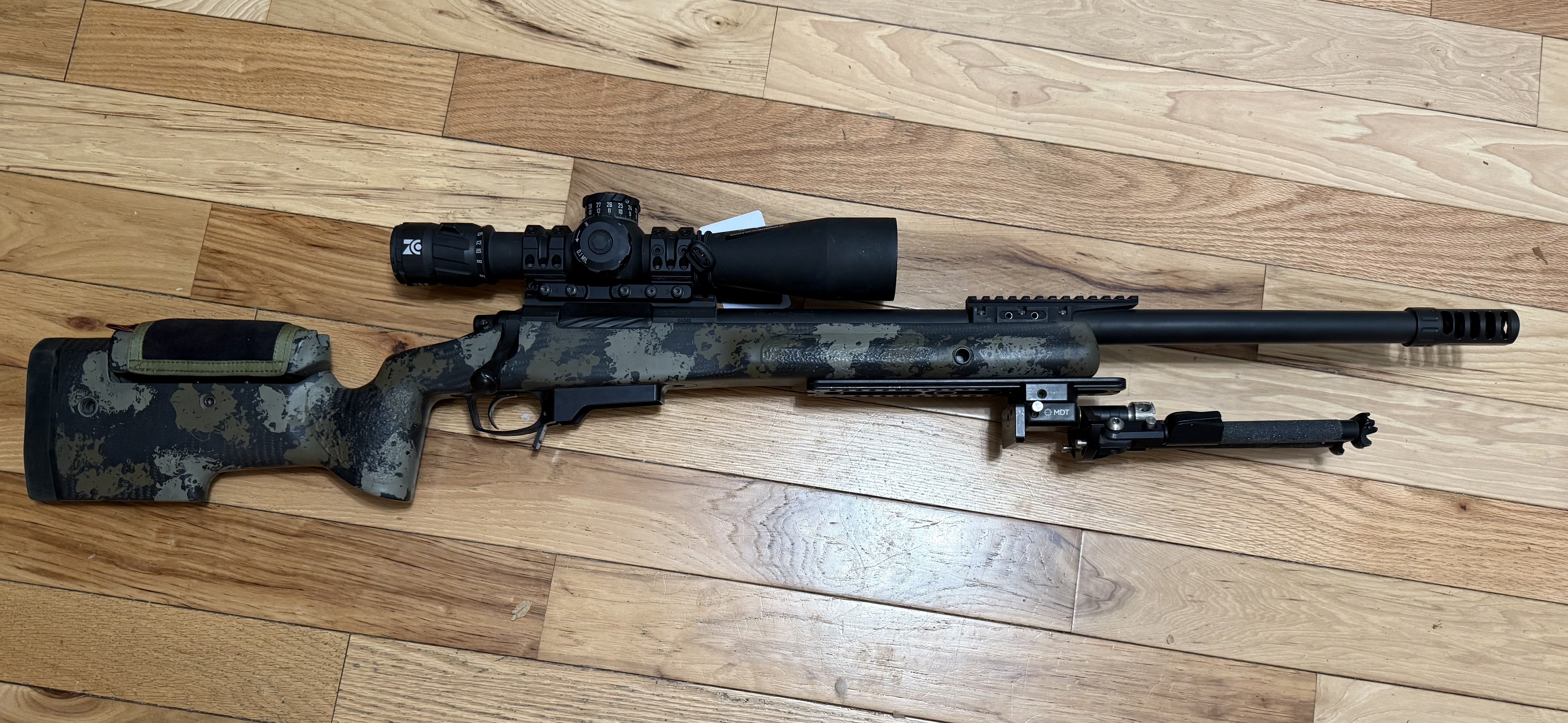 Swamp camo. Comes with everything as new: weights, rail and spacers.