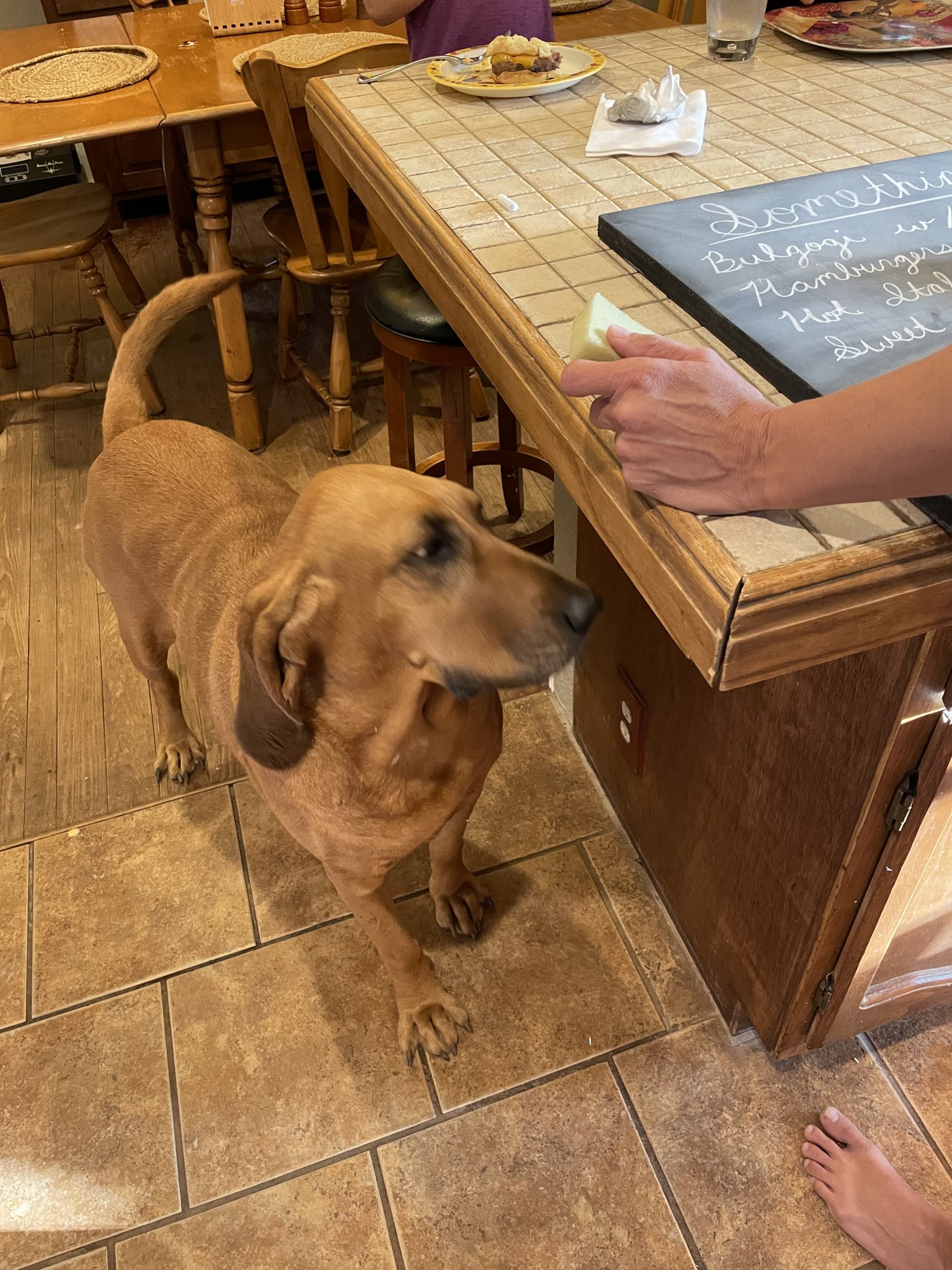 I stole your dog.Trying to get him to do his homework!. He says he knows it already.