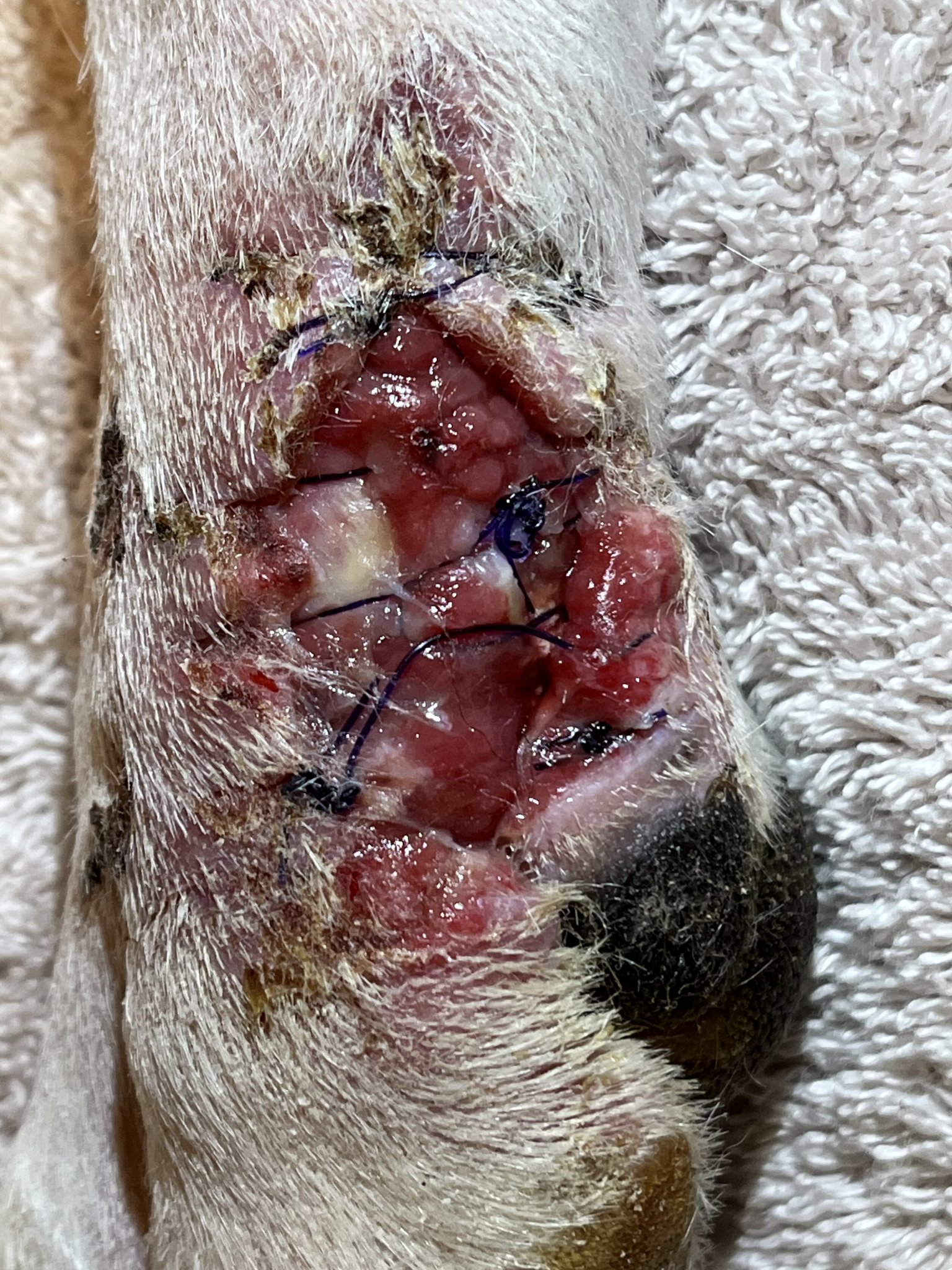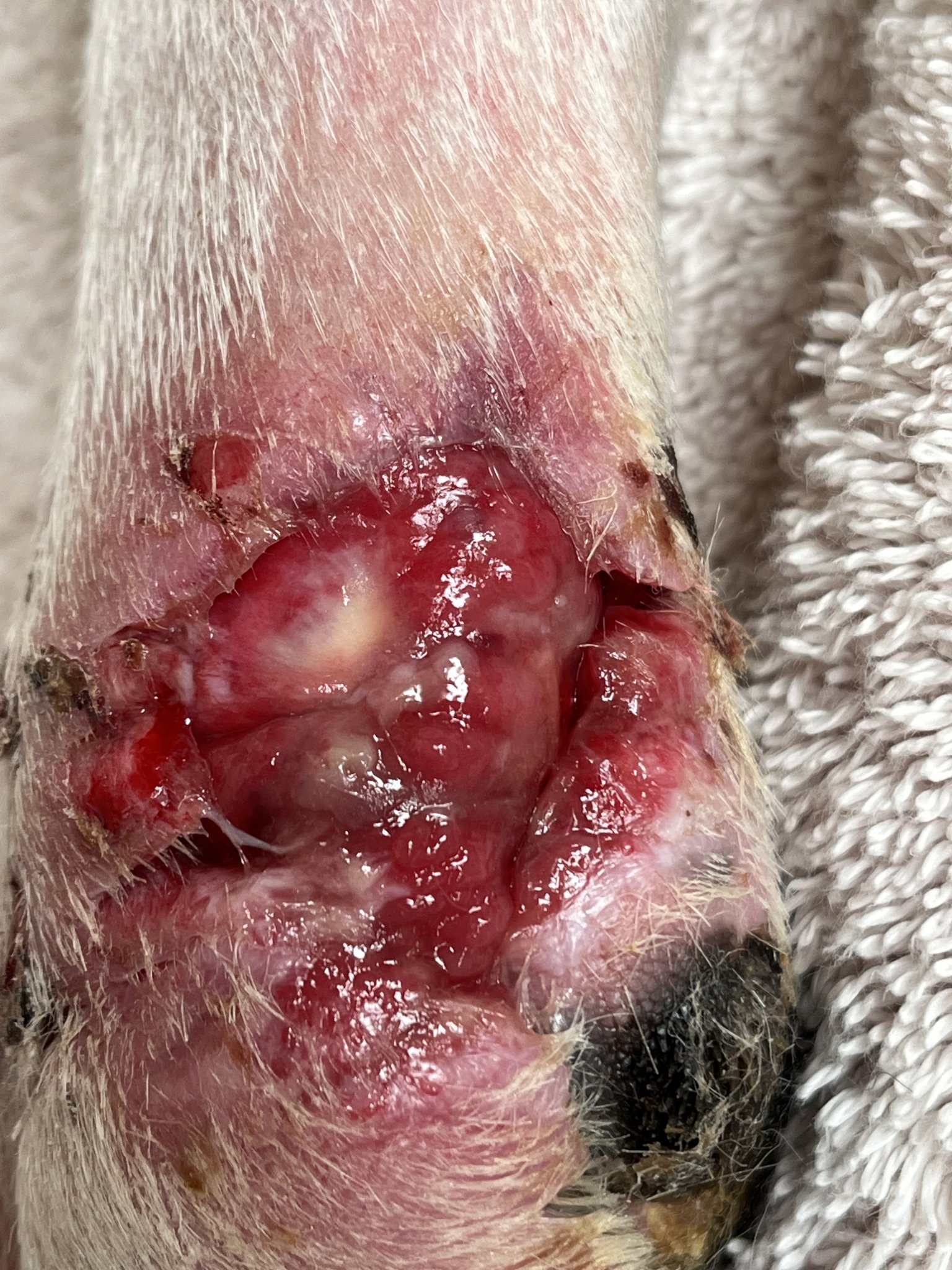 My problem with the Manuka is that I don't know enough about it to say when it's time to say it's not working. There's very little, to no, new granulation (it doesn't look overly wet to me, but the margins are pink) and the Manuka prevents the wet to dry technique. Thankfully nothing is sticking in the hole but I also can't see that the margins are contracting; probably because we are still in the inflammation phase. We've identified one regional vet that has some extensive small animal surgery out east and has relocated here but he won't be back in the area until Thurs. Most of the local offices are closed until Wed, so we're just trying the least risky treatment until we can get somebody experienced and competent on it.