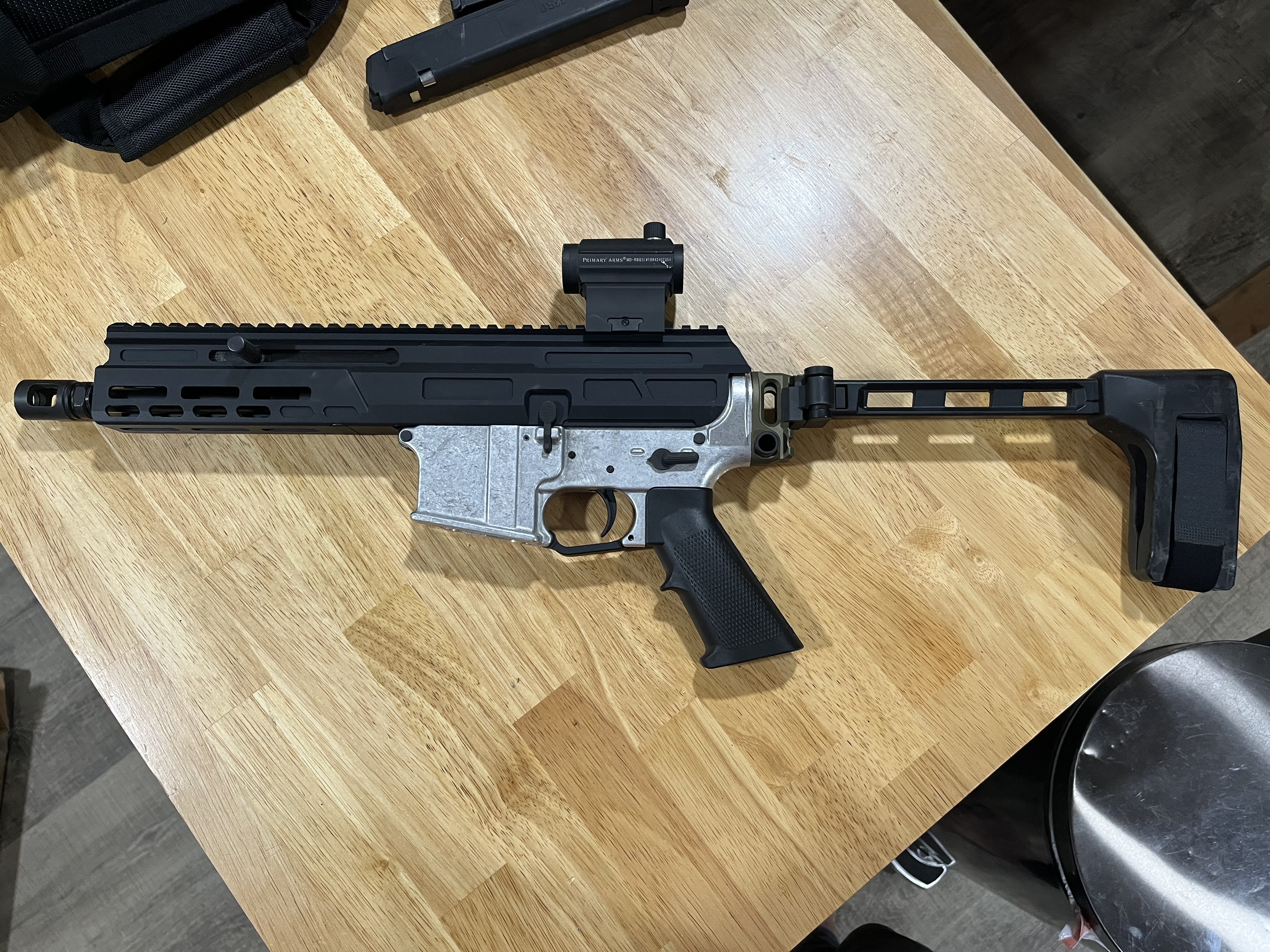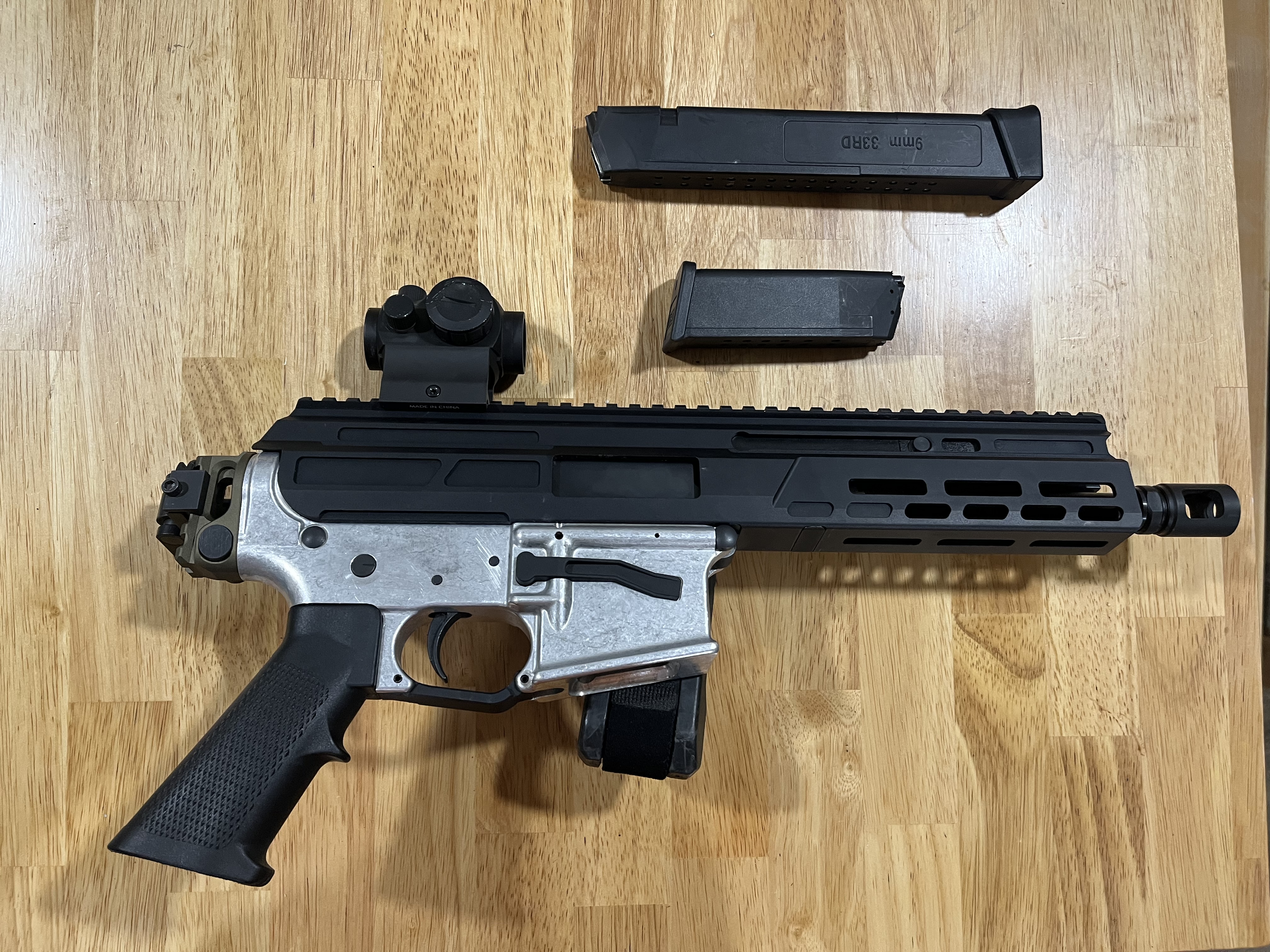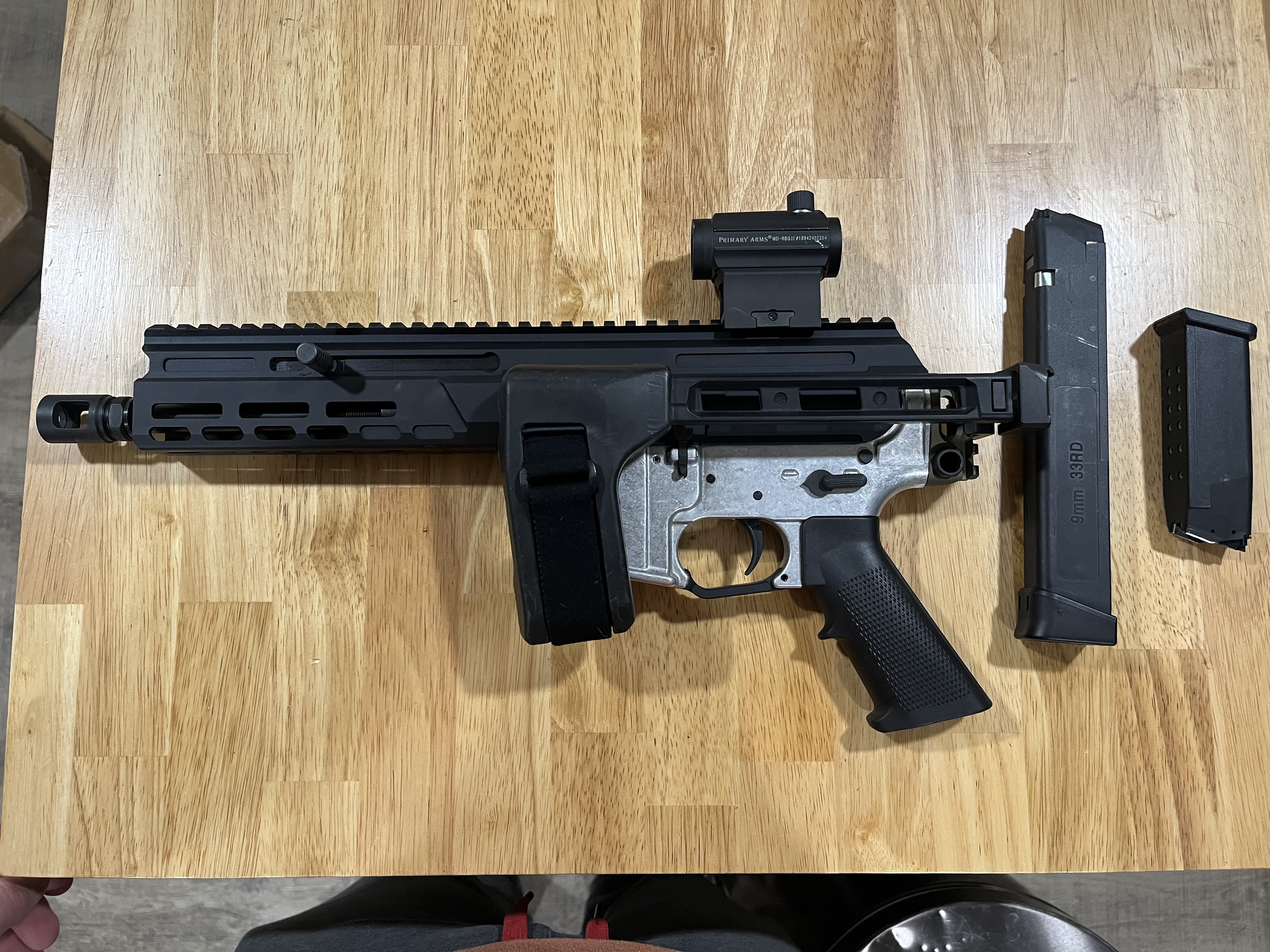 I got this in a trade a while back. Matador Arms upper. 80% lower w/ Strike Industries brace and Primary Arms red dot. 33 and 15 round generic magazine. The lower accepts Glock mags. Hit me up with questions.