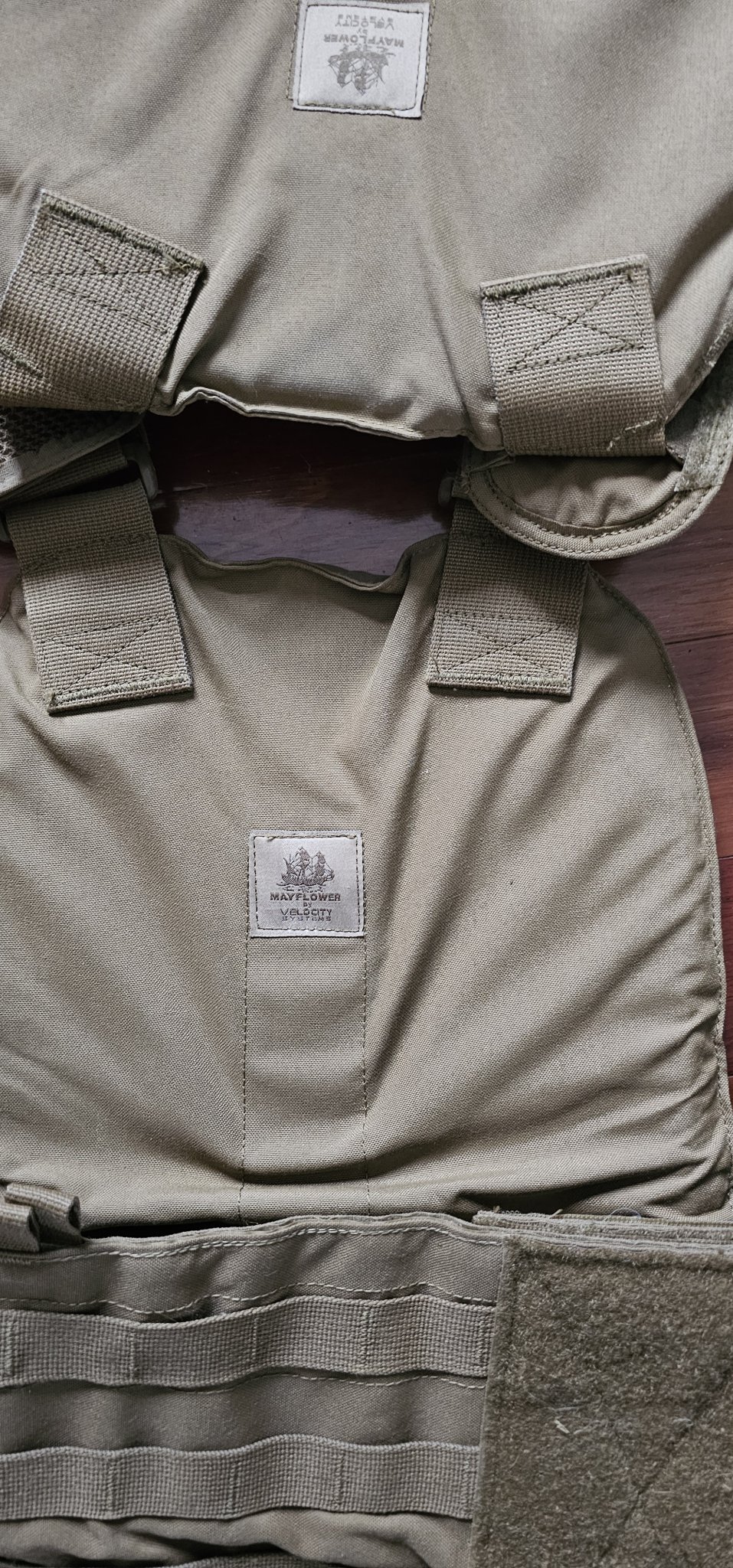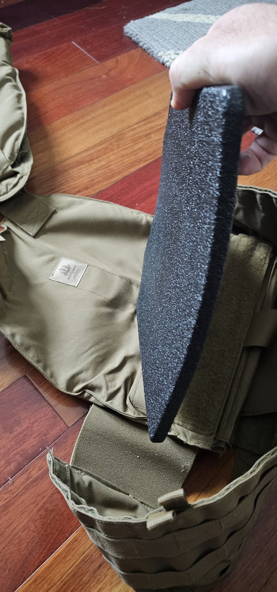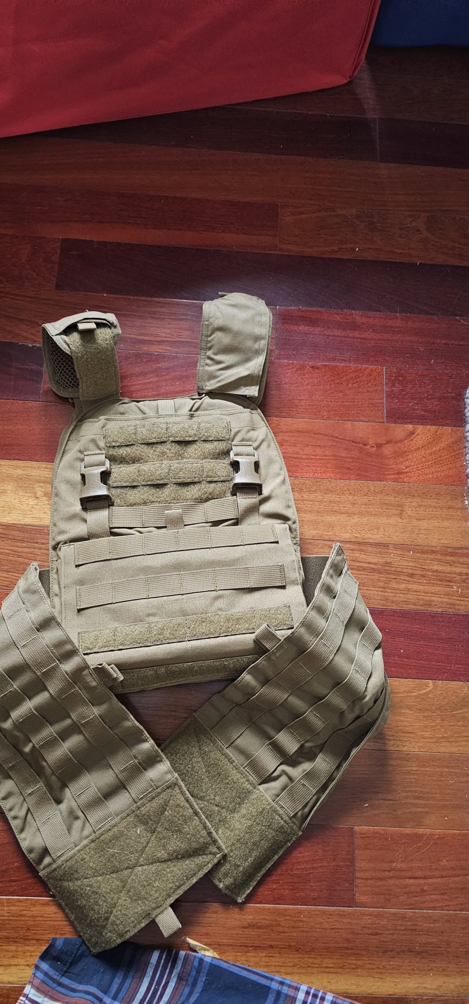 Coyote Brown, size large/xlarge. Like new. Never worn. Includes front and rear Coated Ar500 3/8" curved plates. $350 shipped or trade to Desert Tech SRS A2 accessories.