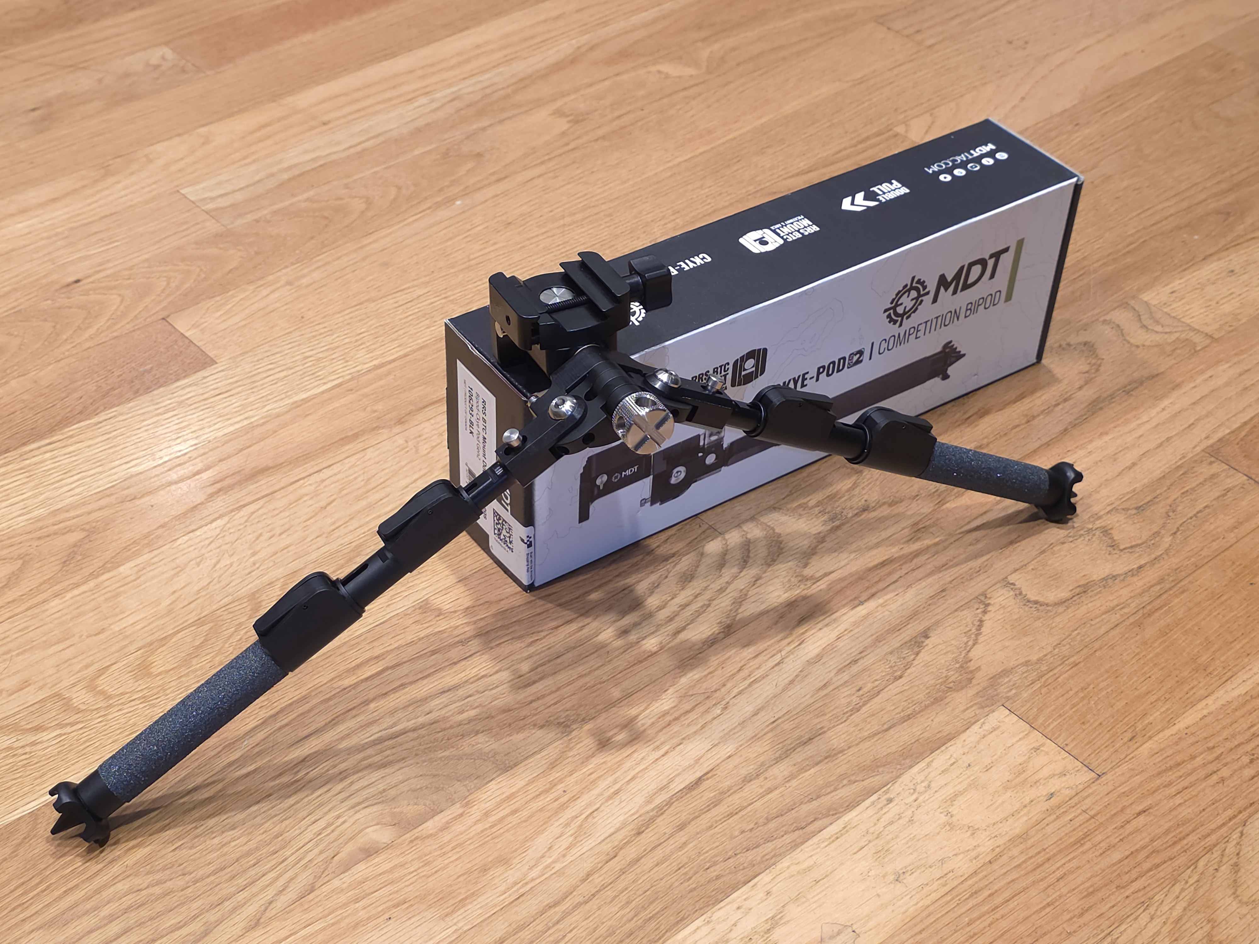 I’m surprisingly pleased at the amazing quality and function of my MDT Ckye-Pod2 Competition Bipod. The dual extension legs glide open and close with a silky precision, and the release levers have the perfect tension and hold precisely. Everything has a feel of precision, and the legs can be moved to various angles changing the stance as needed. The front tension knob adjusts the cant adjustment, and the bipod can be rotated or locked in place. The mount will fit an ARCA or picatinny rail.