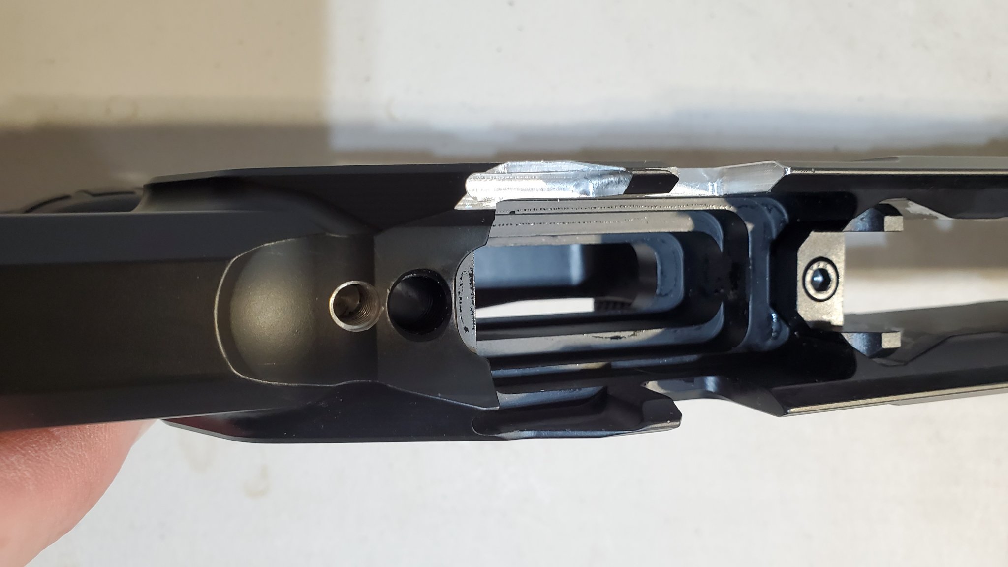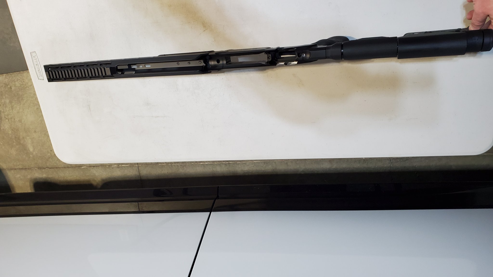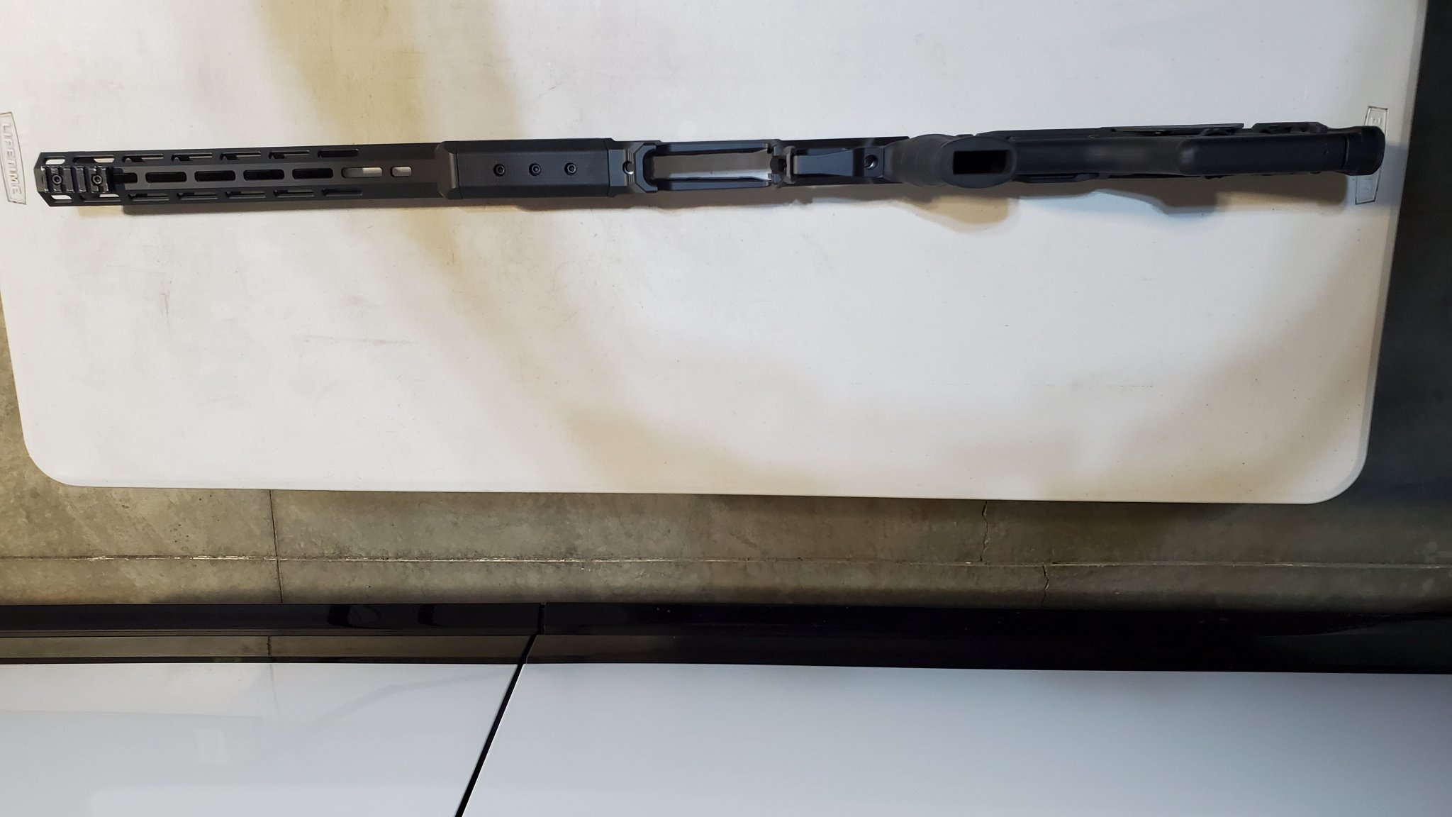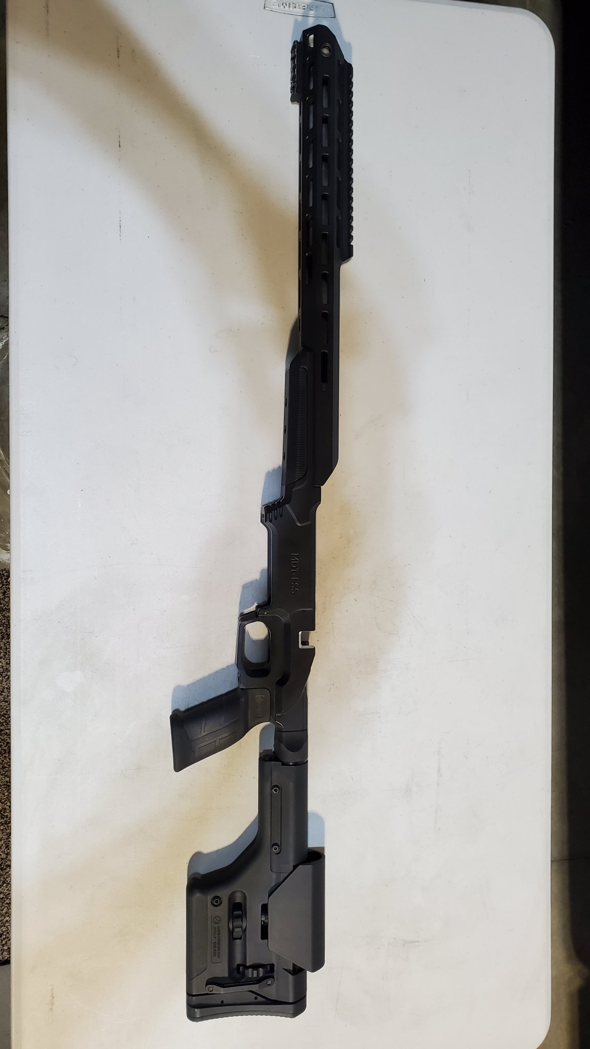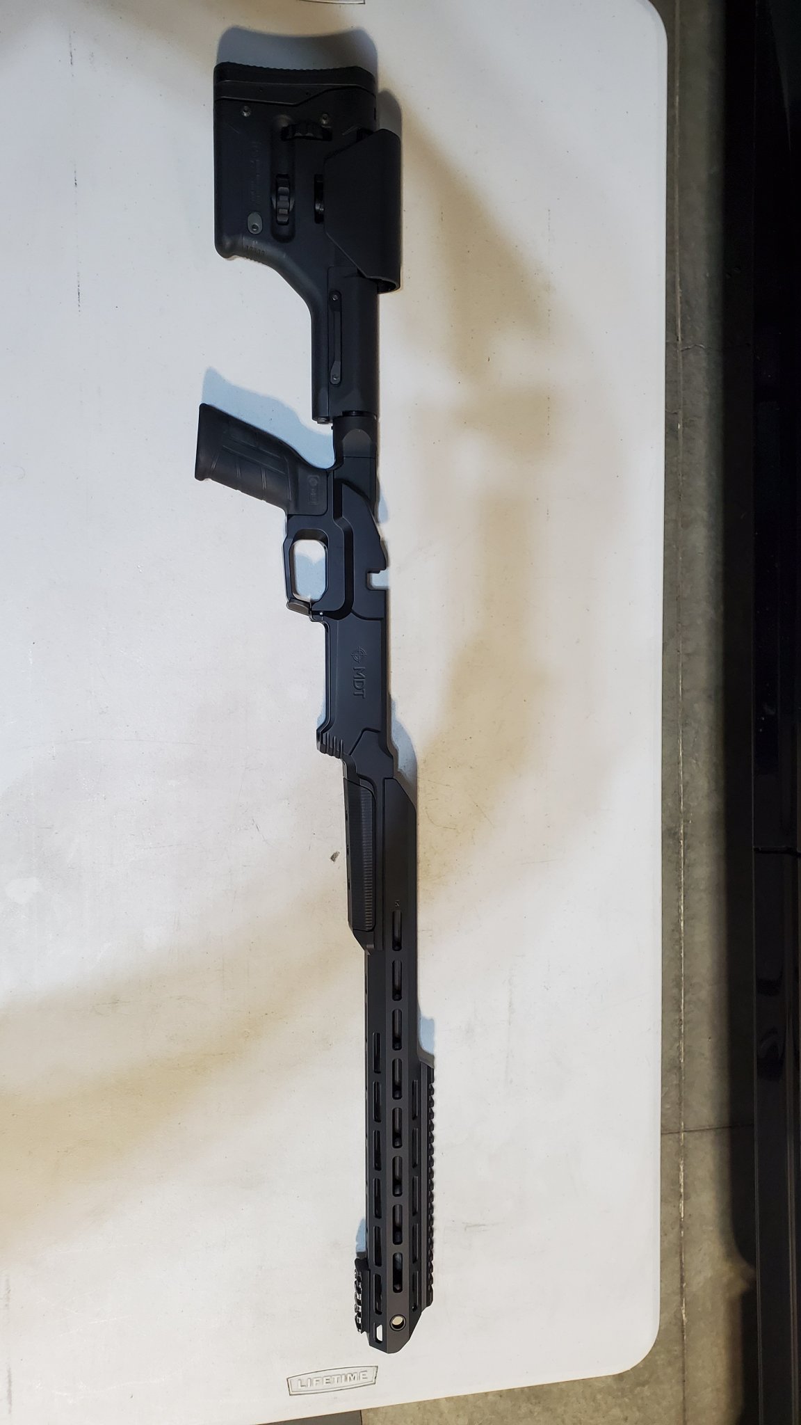 New barreld action mounted but never shot, 18" NV rail forend, Magnum PRS butt stock, MDT grip, black in color. Wad cut for ambidextrous set up done professionally and is a mirror or the original side. $950