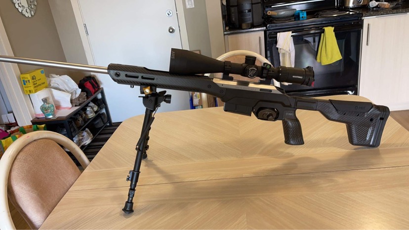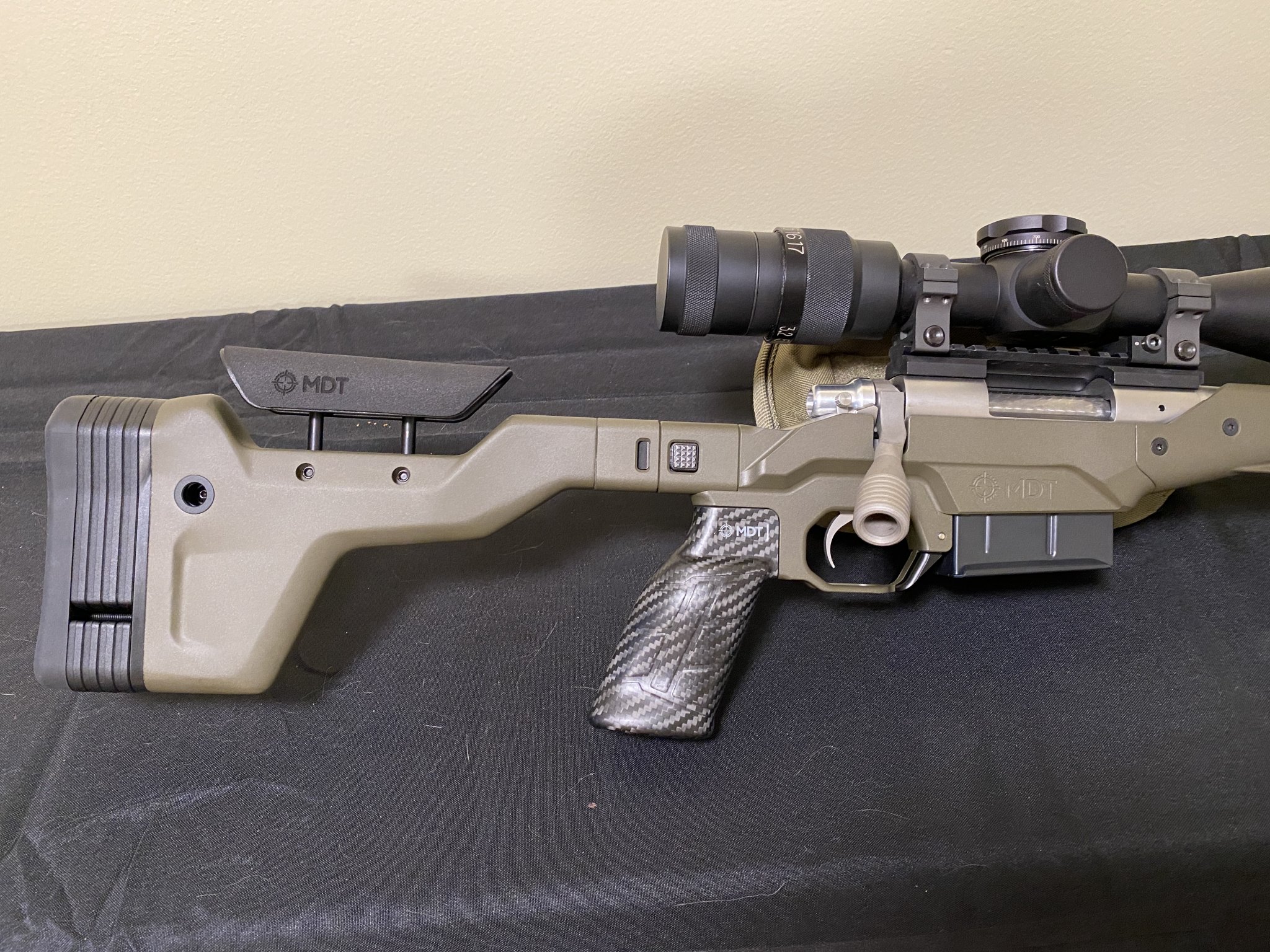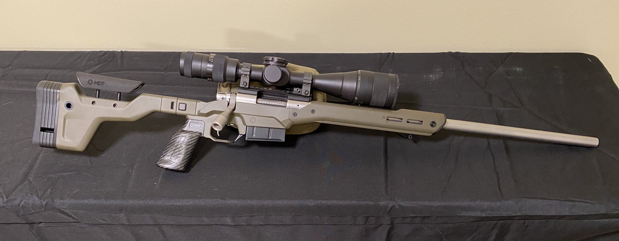 Here is the full rifle, total weight is 9 pounds 4 oz though the 18” carbon six barrel on order should drop that to 8 pounds 12 oz. I plan to pick up one of the new MDT wood grips during their Black Friday sale to put on it as that should only add an oz or so.