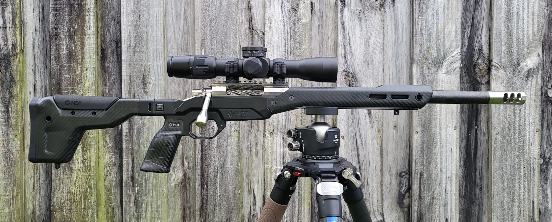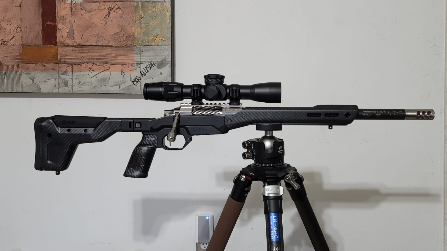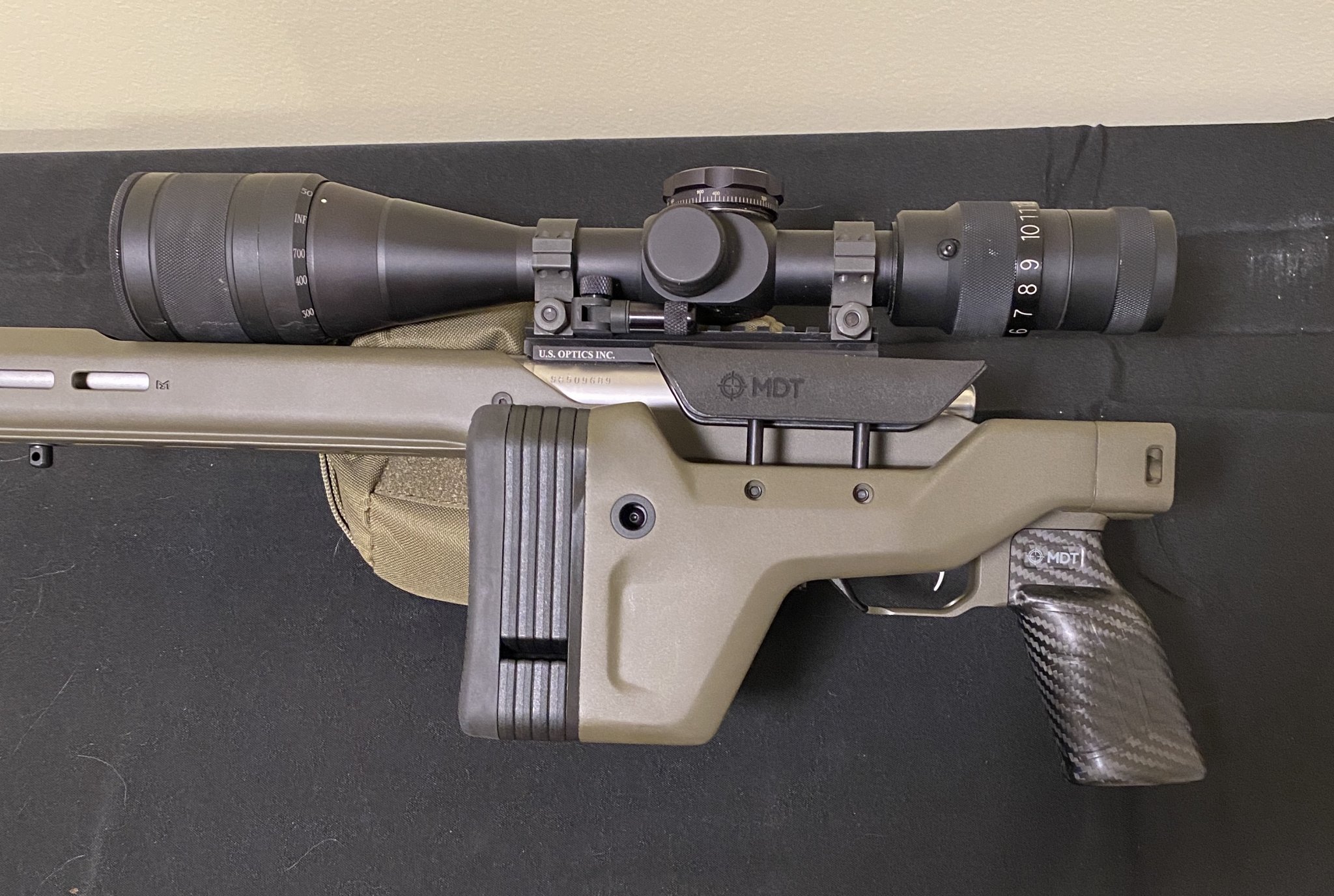 Here is the full rifle, total weight is 9 pounds 4 oz though the 18” carbon six barrel on order should drop that to 8 pounds 12 oz. I plan to pick up one of the new MDT wood grips during their Black Friday sale to put on it as that should only add an oz or so.