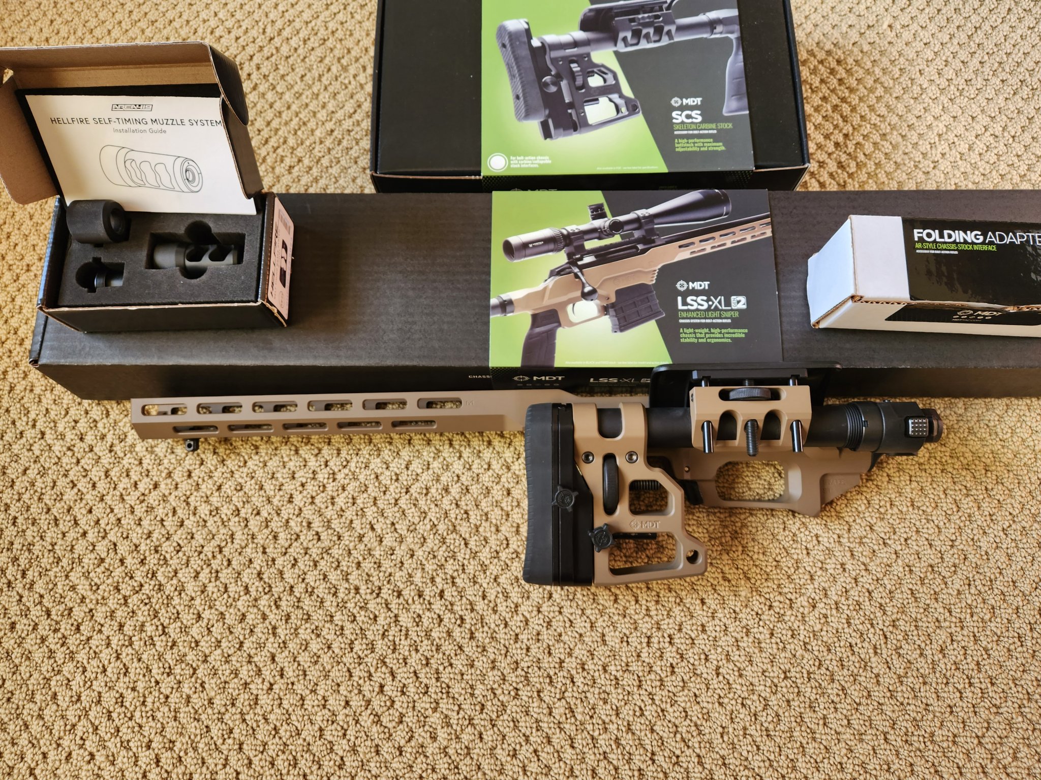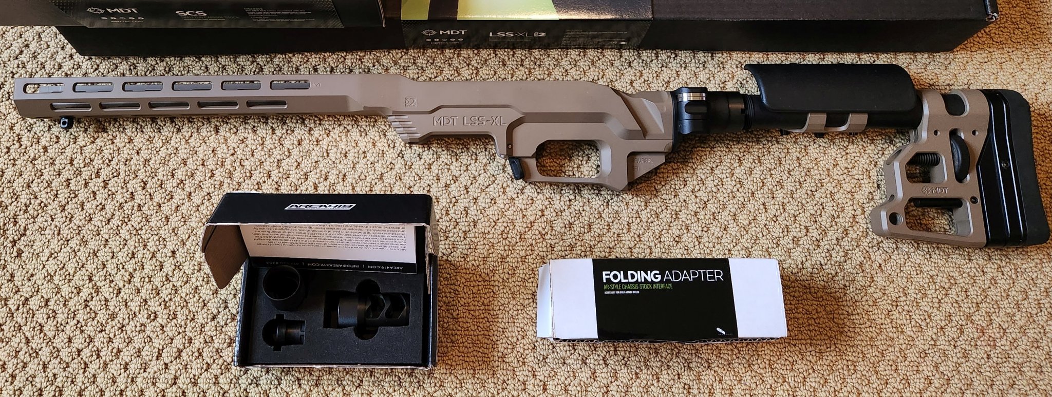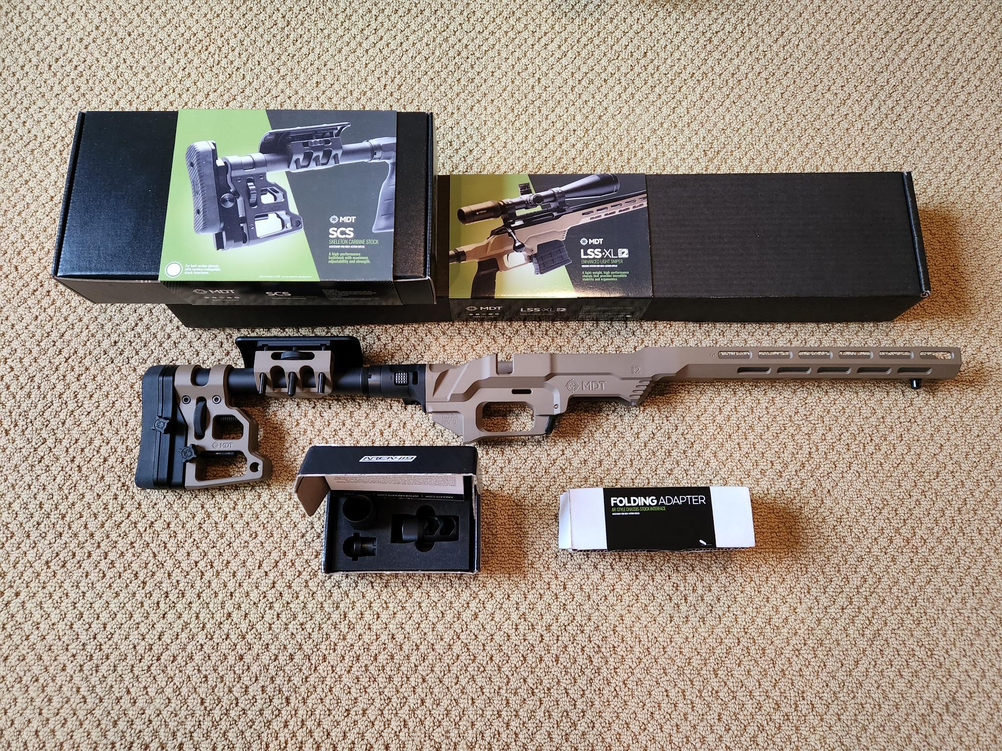 MDT LSS-XL Gen 2 chassis in FDE (comes with action screws) in the "fixed" interface (SKU: 103355-FDE)MDT 2-way locking folding adapter (fixed to carbine, SKU: 103408-BLK)MDT Skeleton Carbine Stock in FDE. (SKU: 102856-FDE)