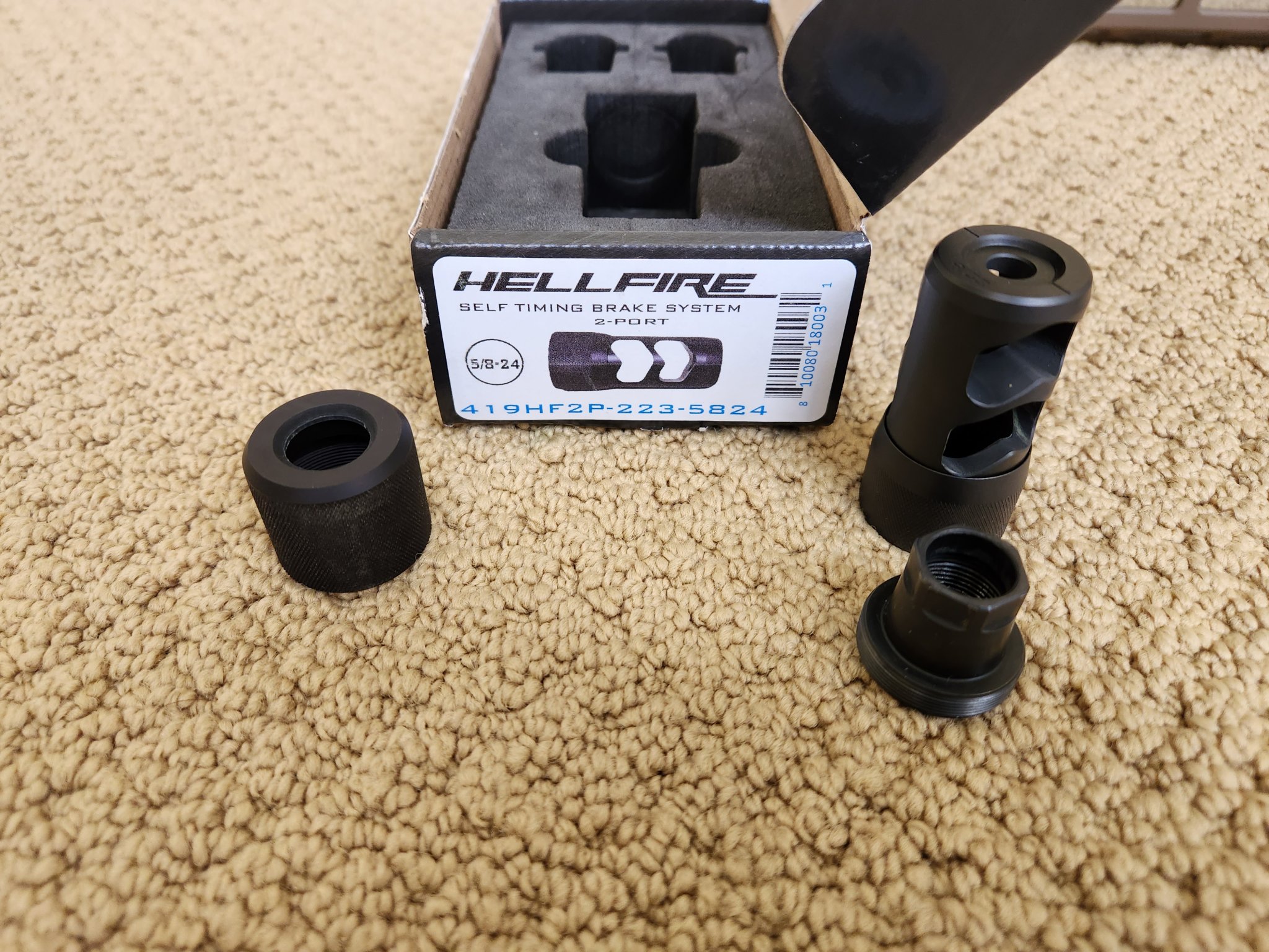 2) Area 419 2 Port brake. For .223/6mm and threaded 5/8-24. Comes with an extra Area 419 Hellfire thread protector. Used for less than 500 rounds on a bolt gun. SOLD