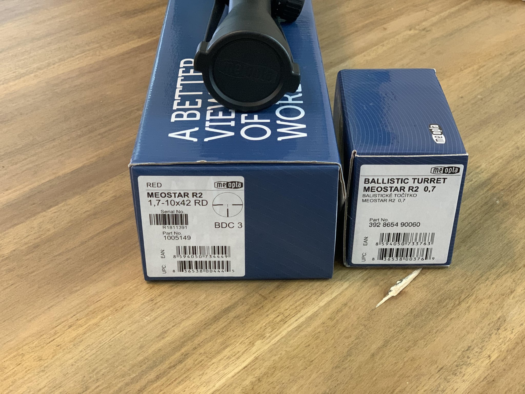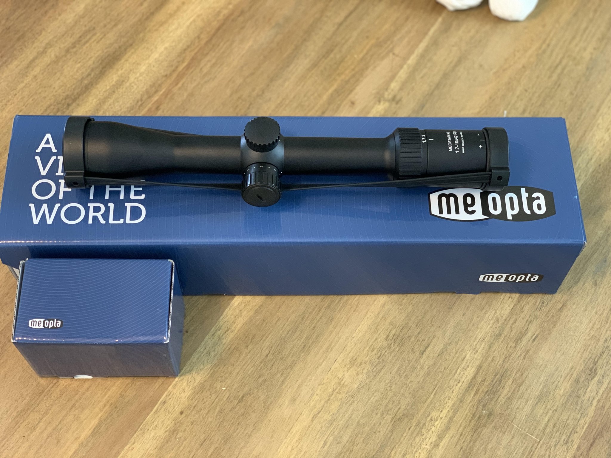 Like new scope. It was mounted on a rifle and it's seen 5 rds of use. Sold the rifle and don't have a place for it now. Glass is excellent and the highest quality Meopta offers. Edge to edge clarity with 94.5% daylight transmission and 92% at twilight. Most people may not know that Meopta is either the manufacturer or cuts the glass for high end companies like Zeiss, Swarovski, Leica and many others. 1.7x is low enough for quick both eyes open shots and 10X is high enough to make shots at distance. The BHT (not installed) allows several distances to be dialed very quickly and easily. BDC 3 in my opinion is the perfect reticle for this scope. Pic attached is the data from my model 70 375 HH Mag. I can easily make the same data card for the buyer if some info is provided. Illumination is bright enough to be used mid day and very quick to pick up with both eyes open.