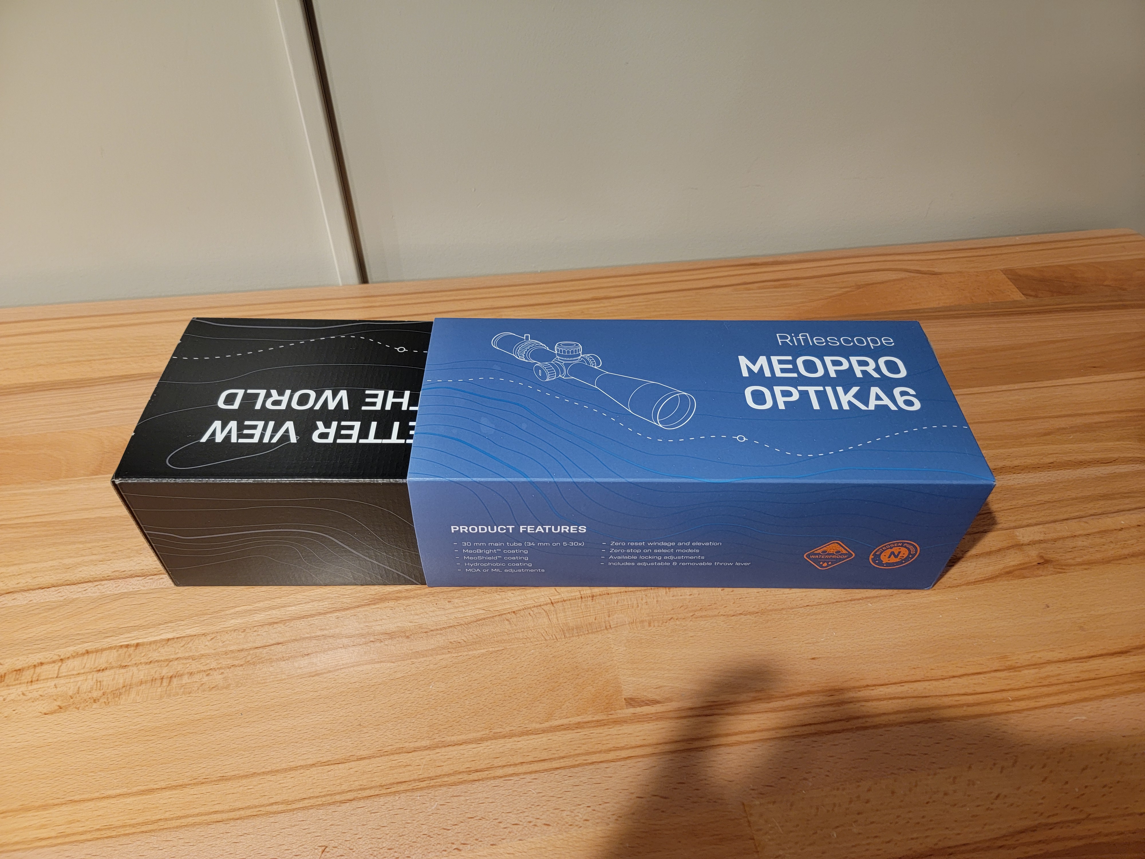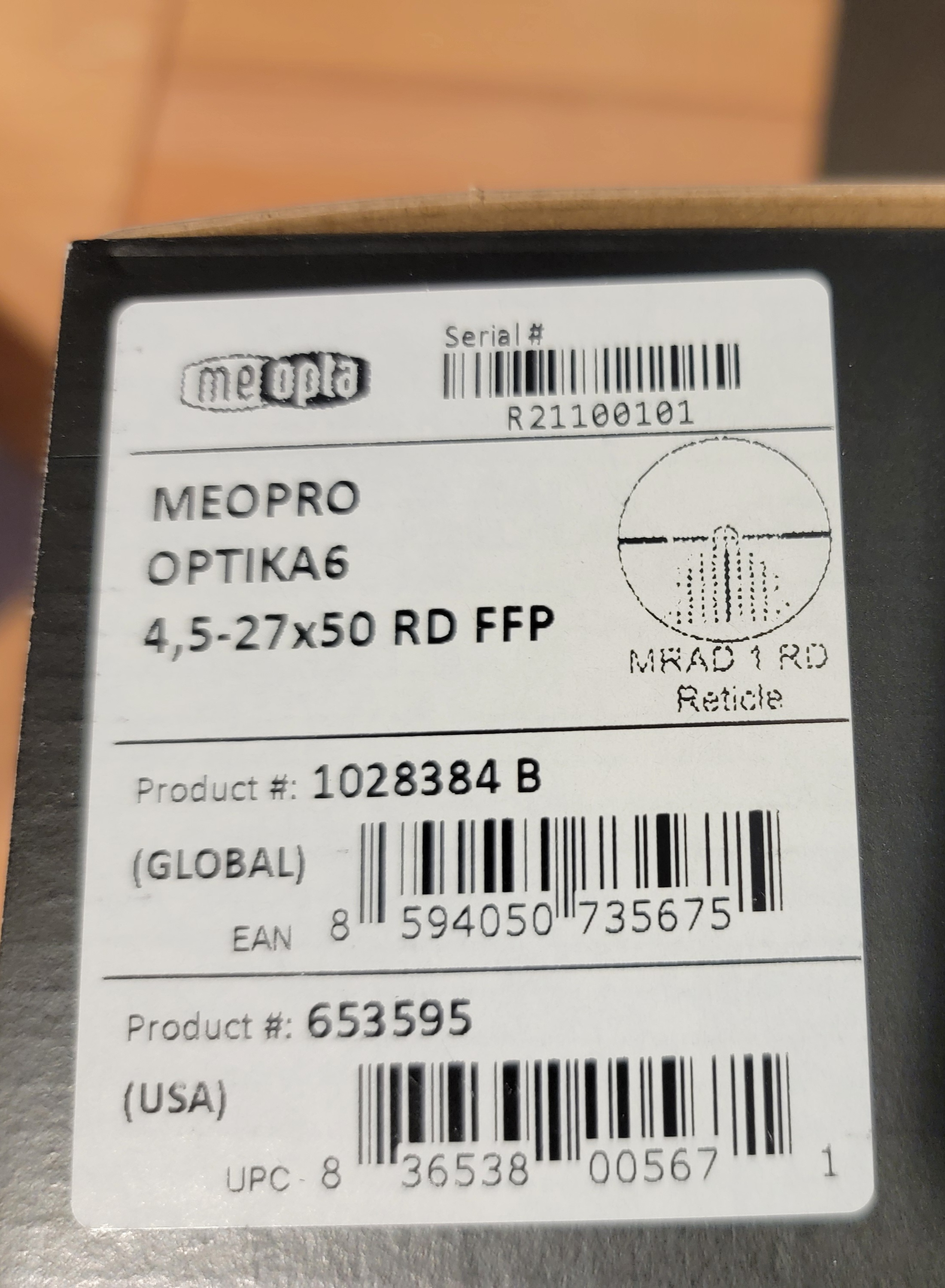 New in box Meopta Optika 6 4.5-27, RD FFP MIL reticle Fantastic dual purpose reticle that's nice and visible on low power. This scope has never been mounted, includes box and swag it comes with .....$500 shipped. Don't think you can get better glass for the money.