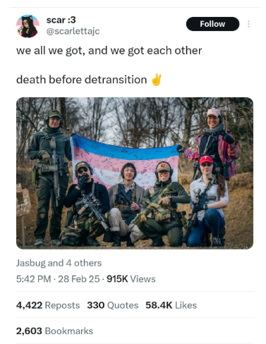 A better comparison of rates would be normal people (all races) vs trans people (all races). Then itd be nice to drill through into the rates by race within each of those two bucketsWell, most of the tranny mentally-ill POS assassins are... white.