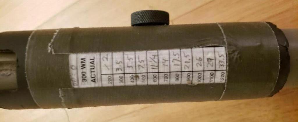 Fwiw, attached is the dope card on the stock I got from you last year. It shows a (presumably) 100 meter zero, with drops out to 1200 meters, which was the 'official' max effective range of Mk 248 Mod 0 ammo of the era, but the later Mk 248 Mod 1 ammo has an official effective range of 1500 meters, hence I was curious if any dope cards on that one stock got out to 1500, etc.