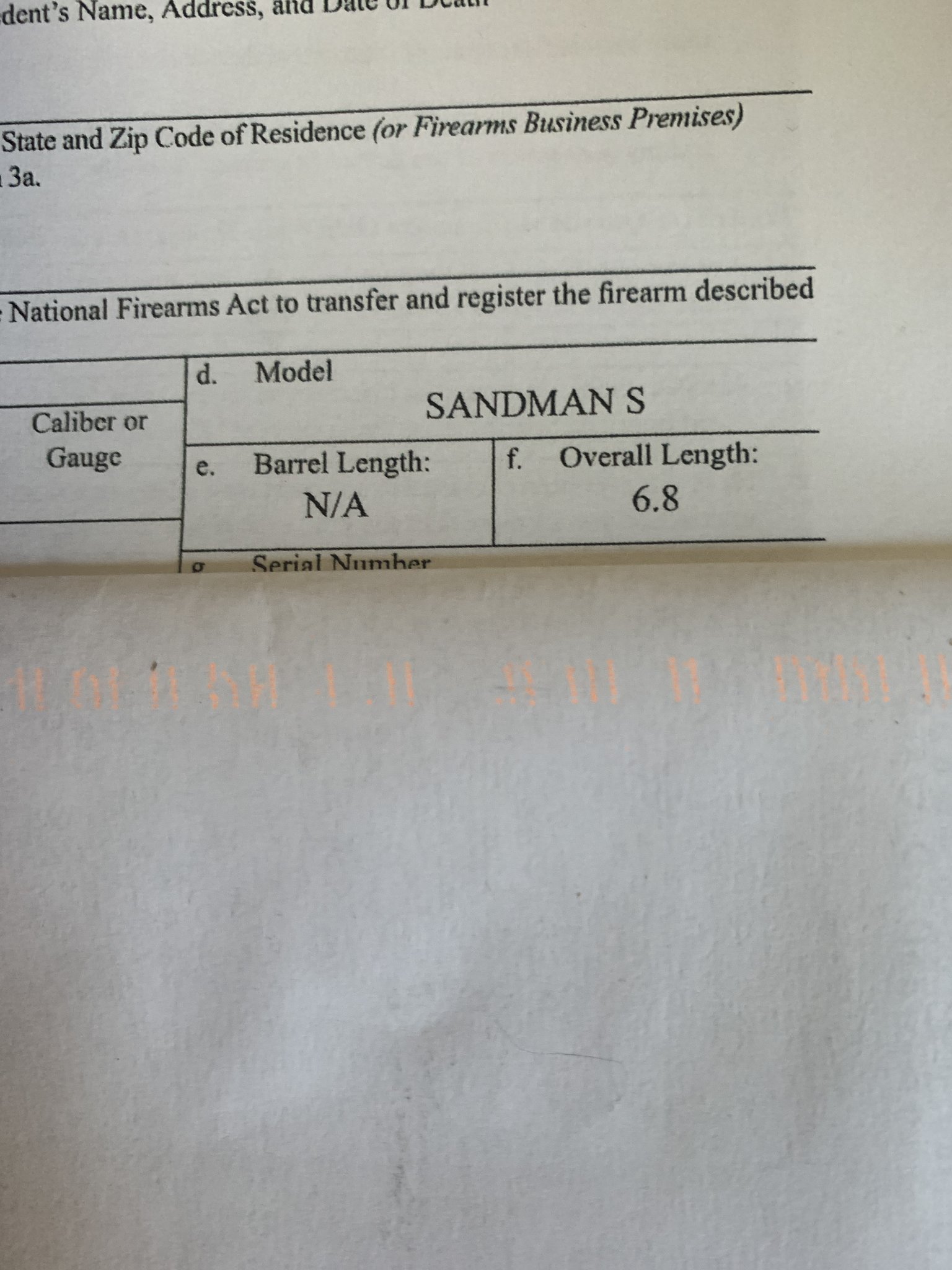 I'm not new to the Form 4 and Form 1 Processes. I have over 30 stamps at this point. I made the mistake of venturing out into the Dead Air brand, though, and I've come to regret it. I purchased 3 cans (a Sandman S and a Wolverine in one batch and then the third - a Sierra 5 much later). The first two were filed before the e-Forms, and I'm sitting at 459 days now. I was recently notified by BATFE that both of my forms would need to be resubmitted because the model names were incorrect. The ATF's position is that the models are NOT "Sandman S" and "Wolverine", but instead are the PART NUMBER that is listed on Dead Air's website.