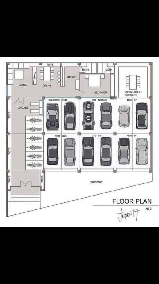 No specific weapons securing room, and no place for a nice truck. That “storage/work” area could store a few supplies.